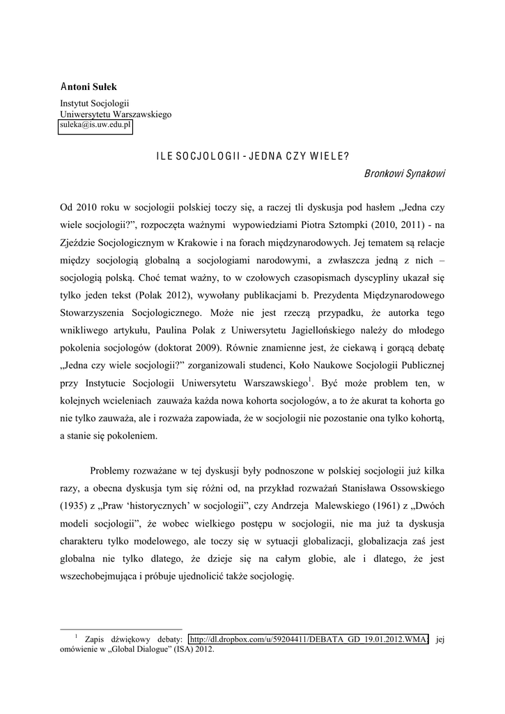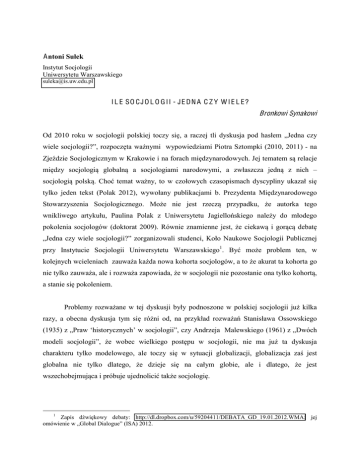 AQWRQL6XáHN Instytut Socjologii Uniwersytetu Warszawskiego [email protected] I L E SO C J O L O G I I - J E D N A C Z Y W I E L E? Bronkowi Synakowi Od 2010 roku w socjologii polskiej tocz\ VLĊ, a raczej tli dyskusja pod KDVáHP Ä-HGQD F]\ wiele socjologii"´UR]SRF]ĊWDZDĪQ\PL wypowiedziami Piotra Sztompki (2010, 2011) - na =MHĨG]LH6RFMRORJLF]Q\PZ.UDNRZLHLna forach PLĊG]\QDURGRZ\ch. Jej tematem Vąrelacje PLĊG]\ VRFMRORJLą JOREDOQą a socjologiami narodowymi, D ]ZáDV]F]D MHGQą z nich ± socjologią SROVNą &KRü WHPDW ZDĪQ\ WR Z F]RáRZ\FK F]DVRSLVPDFK G\VF\SOLQ\ XND]Dá VLĊ tylko jeden tekst (Polak 2012) Z\ZRáDQ\ SXEOLNDFMDPL E 3UH]\GHQWD 0LĊG]\QDURGRZHJR Stowarzyszenia Socjologicznego. MRĪH QLH jest U]HF]ą SU]\SDGNX ĪH autorka tego ZQLNOLZHJR DUW\NXáX, Paulina Polak z Uniwersytetu JagieOORĔVNLHJR QDOHĪ\ GR PáRGHJR SRNROHQLD VRFMRORJyZ (doktorat 2009). RyZQLH ]QDPLHQQH MHVW ĪH FLHNDZą L JRUąFą GHEDWĊ Ä-HGQD F]\ ZLHOH VRFMRORJLL"´ zorganizowali studenci .RáR 1DXNRZH 6RFMRORJLL 3XEOLF]QHM przy Instytucie Socjologii Uniwersytetu Warszawskiego1. %\ü PRĪH SUREOHP WHQ, w kolejnych wcieleniach ]DXZDĪDNDĪGDQRZDNRKRUWDVRFMRORJyZDWRĪHDNXUDWWDkohorta go QLHW\ONR]DXZDĪDDle i UR]ZDĪD]DSRZLDGDĪHZVRFMRORJLLQLHSR]RVWDQLHona tylko kohortą, a VWDQLHVLĊSRNROHQLHP Problem\ UR]ZDĪDQH Z WHM G\VNXVML E\á\ podnoszone Z SROVNLHM VRFMRORJLL MXĪ NLOND razy, a REHFQD G\VNXVMD W\P VLĊ UyĪQL RG QD SU]\NáDG UR]ZDĪDĔ 6WDQLVáDZa Ossowskiego (1935]Ä3UDZµhistorycznych¶ ZVRFMRORJLL´F]\Andrzeja Malewskiego (1961) z Ä'ZyFK modeli VRFMRORJLL´ ĪH ZREHF ZLHONLHJR SRVWĊSX Z VRFMRORJLL nie ma MXĪ WD G\VNXVMD charakteru tylko modelowego, ale WRF]\ VLĊ Z V\WXDFML JOREDOL]DFML glREDOL]DFMD ]DĞ MHVW globalna QLH W\ONR GODWHJR ĪH G]ieje VLĊ QD FDá\P JORELH DOH L GODWHJR ĪH MHVW wszechobejmująFDi SUyEXMHujednolicLüWDNĪHVRFMRORJLĊ. 1 =DSLV GĨZLĊNRZ\ GHEDW\ http://dl.dropbox.com/u/59204411/DEBATA_GD_19.01.2012.WMA; jej RPyZLHQLHZÄ*OREDO'LDORJXH´,6$ Zacznijmy, dobrym pozytywistycznym zwyczajem, od definicji, od, najprostszej definicji socjoloJLL6RFMRORJLDMHVWWRQDXNDNWyUDPyZLRVSRáHF]HĔVWZLHWRÄPyZL´MHVWZ GHILQLFML ZDĪQH JG\Ī SR]ZDOD RQR UR]áRĪ\ü pytanie Äjedna czy wiele socjologii"´ na dwa: ÄMHGQRF]y ZLHOHVSRáHF]HĔVWZ"´RUD]ÄMHGHQF]\ZLHOH MĊ]\NyZ"´ 7HSRGS\WDQLDVą]HVREą zZLą]DQH- QLHPRĪQDPyZLüRUyĪQLFDFKPLĊG]\VSRáHF]HĔVWZDPLZRGHUZDQLXRGMĊ]\ND 5yĪQLFH PLĊG]\ VSRáHF]HĔVWZDPL FKFLDáRE\ VLĊ U]HF DĪ ELMą Z RF]\ MXĪ w XVI wieku 0LFKDá]Montaigne w Akwitanii SLVDá w 3UyEDFK, ĪHSUDZLGáDVSRáHF]QHNRĔF]ąVLĊQD PirenejachQLHGDOHNLFK]UHV]WąRGmiejsca, gdzie Ī\á. Pytanie, co za QLPLRF]\ZLĞFLHQLH]D W\PLJyUDPLDOH]DW\PLUyĪQLFDPLVLĊNU\MH" 3DUDIUD]XMąF Z\SRZLHGĨ Stefana Nowaka ] MHJR SLHUZV]HJR Z\NáDGX ]H :VWĊSX do socjologii na Uniwersytecie Warszawskim (WDN VLĊ ]áRĪ\áR ĪH E\á WR teĪ pierwszy uniwersytecki w\NáDG MDNLHJR VáXFKDáHP) PRĪQD SRZLHG]LHü ĪH SRG SHZQ\PL Z]JOĊGDPL ZV]\VWNLH VSRáHF]HĔVWZD Vą WDNLH VDPH; SRG SHZQ\PL Z]JOĊGDPL MHGQH VSRáHF]HĔVWZD Vą podobne, a pod innymi UyĪQH pod pewn\PL Z]JOĊGDPL NDĪGH VSRáHF]HĔVWZR MHVW LQQH (profesor PyZLáWDNROXG]LDFK]DSHZQH]DNWyU\PĞ]VRFMRORJyZDPHU\NDĔVNLFKPRĪH]D Homansem). 5]HF]ZW\PĪHQLHZLHP\]JyU\ jakie VąWRZ]JOĊG\DGRNáDGQLHMQDMDNLP SR]LRPLHDEVWUDNFMLWHSRGRELHĔVWZDLUyĪQLFHZ\VWĊSXMĊDOERQLHZ\VWĊSXMą ,ZW\PWDNĪH F]\ PDP\ MĊ]\N GR GRVWU]HĪHQLD L RSLVDQLD SRGRELHĔVWZ QD JáĊEV]\FK ÄWHRUHW\F]Q\FK´ poziomach. ÄMechanizmy LUHJXODUQRĞFLĪ\FLDVSRáHF]QHJRVąXQLZHUVDOQHGODFDáHMUDV\ ludzkiej, aczkolwiek, oczywiĞFLH LFK SU]HMDZ\ UyĪQLą VLĊ PLĊG]\ F\ZLOL]DFMDPL NXOWXUDPL VSRáHF]HĔVWZDPLOXEVHJPHQWDPLVSRáHF]HĔVWZ´± QDSLVDá6]WRPSND (2011). To stwierdzenie QDOHĪ\ jednak WDN VDPR MDN ]DVDGD SU]\F]\QRZRĞFL czy uniwersalnego funkcjonalizmu do niesprawdzalnych, a MXĪ QD SHZQR GR nieobalalnych ]DáRĪHĔ Qauki. Nigdy bowiem nie EĊG]LHP\ PXVLHOL SU]\]QDü ĪH pewne UyĪQLFH PLĊG]\NUDMRZH Vą GHILQLW\ZQH L SU]HVWDü ZLHU]\üĪHQDMDNLPĞJáĊEV]\PSR]LRPLHLVWQLHMHXSUDJQLRQDXQLZHUVDOQDUHJXODUQRĞüLĪHMą Z NRĔFX ]QDMG]LHPy ± ]LQWHUSUHWXMHP\ WH UyĪQLFH MDNR W\ONR MHM SU]HMDZ\ =DáRĪHQLH WR PD jednak ZLHONą ZDUWRĞü heurystyczną ER ]DFKĊFD GR niezmordowanego szukania tych powszechniNyZIXQGDPHQWyZWHRULLVRFMRORJLF]Q\FK 2 %\üPRĪHUR]PaLWRĞü ĞZLDWDVSRáHF]QHJR, czy nawet ĞZLDWyZVSRáHF]Q\FKGDáaE\VLĊ SU]HGVWDZLü MDNR rozmaitoĞü W\ONR SU]HMDZyZ G]LDáDQLD PHFKDQL]PyZ XQLZHUVDOQ\FK, ale taka reprezentacja to utopia poznawcza, a najciekawsz\PL GOD VRFMRORJD PRJą VLĊ RND]Dü UHVLGXDXQLNDWRZHFHFK\VSRáHF]HĔVWZNWyUHQLHGDMą VLĊ (FKRü, kto PRĪHVLĊNLHG\ĞGDG]ą tak SU]HGVWDZLü. &]\QDSU]\NáDG3ROVNDNLHG\NROZLHNGDVLĊ w pHáQL RSLVDüMDNRXQLNDOQD NRPELQDFMD ZDUWRĞFL n ]PLHQQ\FK WHRUHW\F]Q\FK L F]\ WDND SU]HVWU]HĔ RJURPQHM OLF]E\ ZáDVQRĞFLZ RJyOHGDVLĊVNRQVWUXRZDü"*G\ w latach stanu wojennego Janin a Wedel (1986) SLVDáD VZRMą Private Poland, to EDUG]R ZDĪQH cechy polskiego VSRáHF]eĔVWZD tego czasu RSDWU]\áDHW\NLHWNDPLZMĊ]\NXSROVNLPDQLHZÄRJyOQRVRFMROogicznym´ MĊ]\NXDQJLHOVNLP, VWąGMHVWWDPVáRZRĞURGRZLVNRL VáRZR]DáDWZLü, ZLGDüdesygnaty t\FKVáyZ nie maMą swoich GRNáDGQ\FK RGSRZLHGQLNyZ Z ĞZLHFLH DQJORVDVNLP QLH GD VLĊ LFK DQL SU]HWáXPDF]\ü DQL ]UR]XPLHü MHĞOL VLĊ QLH ]QD NRQWHNVWX $ MDN SU]HWáXPDF]\ü malaise z pism Emila Durkheima? Tak samo jak K]Q ]HVWDPEXOVNLFKRSRZLHĞFL2UKDQD3DPXND" Im mocniej wierzymy w PRĪOLZRĞü]EXGRZDQLDWDNLHMWHRULL VSRáHF]HĔVWZDZNWyUHM VSRáHF]HĔVWZD UyĪQLą VLĊ W\ONR SU]HMDZDPL W\FK VDP\FK RJyOQ\FK SUDZLGáRZRĞFL OXE PLHMVFDPLQDMDNLFKĞWHRUHW\F]QLH]GHILQLRZDQ\ch skalach, tym bardziej potrzebny jest nam MĊ]\N RJyOQ\FK SRMĊü socjologicznych D LP JáĊEV]\ MHVW SR]LRP QD NWyU\P G]LDáDMą WH PHFKDQL]P\ W\P EDUG]LHM DEVWUDNF\MQH SRMĊFLD Vą QDP SRWU]HEQH 3RGRELHĔVWZ L UyĪQLF PLĊG]\ NUDMDPL QLH PRĪHP\ RSLVDü Z MĊ]\Nach XĪ\ZDQ\FK Z F]ĊĞFL W\FK NUDMyZ przy SRPRF\WHUPLQyZGHQRWXMąF