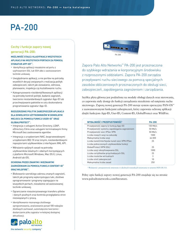 PA L O A LT O N E T W O R K S : PA - 2 0 0 — k a r t a k a t a l o g o w a PA-200 Cechy i funkcje zapory nowej generacji PA‑200: PA-200 Możliwość stałej klasyfikacji wszystkich aplikacji na wszystkich portach za pomocą sygnatur App-IDT™. Identyfikacja aplikacji niezależnie od portu z szyfrowaniem SSL lub SSH albo z zastosowaniem techniki unikowej. • • Uwzględnianie aplikacji, a nie portów na potrzeby wszelkich decyzji związanych z realizacją polityk zabezpieczeń, takich jak zezwalanie, odmowa, planowanie, inspekcja czy kształtowanie ruchu. • Kategoryzowanie niezidentyfikowanych aplikacji na potrzeby kontroli polityk, badanie zagrożeń, tworzenie niestandardowych sygnatur App-ID lub przechwytywanie pakietów w celu doskonalenia programowania sygnatur App-ID. Rozszerzenie polityk zabezpieczeń aplikacji dla dowolnych użytkowników w dowolnym Zapora Palo Alto Networks™ PA-200 jest przeznaczona do szybkiego wdrażania w korporacyjnym środowisku z rozproszonymi oddziałami. Zapora PA-200 zarządza przepływami ruchu sieciowego za pomocą specjalnych zasobów obliczeniowych przeznaczonych do obsługi sieci, zabezpieczeń, zapobiegania zagrożeniom i zarządzania. Szybka płyta główna jest podzielona na moduły obsługi danych oraz sterowania, co zapewnia stały dostęp do funkcji zarządzania niezależnie od natężenia ruchu sieciowego. Zaporą nowej generacji PA-200 steruje system operacyjny PAN‑OS™ z zaawansowanymi funkcjami zabezpieczeń, który zapewnia ochronę aplikacji dzięki funkcjom App-ID, User-ID, Content-ID, GlobalProtect oraz WildFire. miejscu za pomocą funkcji User-ID™ oraz GlobalProtect™. Wydajność i przepustowość1PA-200 • Integracja z usługami Active Directory, LDAP, Przepływność zapory (z funkcją App-ID) Przepływność systemu zapobiegania zagrożeniom Przepływność sieci IPSec VPN Liczba nowych sesji na sekundę Maksymalna liczba sesji Liczba tuneli/interfejsów tuneli sieci VPN IPSec Liczba jednoczesnych użytkowników funkcji GlobalProtect (VPN SSL) Liczba sesji odszyfrowywania SSL Liczba certyfikatów przychodzących SSL Liczba routerów wirtualnych Liczba stref zabezpieczeń Maksymalna liczba zasad eDirectory Citrix oraz usługami terminalowymi firmy Microsoft bez zastosowania agentów. • Integracja z urządzeniami NAC, bezprzewodowymi urządzeniami 802.1X oraz innymi, niestandardowymi repozytoriami użytkowników z interfejsem XML API. • Wdrażanie spójnych zasad na potrzeby użytkowników lokalnych i zdalnych korzystających z platform Microsoft Windows, Mac OS X, Linux, Android lub iOS. Ochrona przed znanymi i nieznanymi zagrożeniami za pomocą funkcji Content-ID™ oraz WildFire™. • Blokowanie szerokiego zakresu znanych zagrożeń, takich jak programy wykorzystujące luki, złośliwe oprogramowanie i programy szpiegujące na wszystkich portach, niezależnie od zastosowanej techniki unikowej. • Ograniczanie nieautoryzowanego transferu plików i danych poufnych oraz kontrola przeglądania stron niezwiązanych z pracą. • Identyfikowanie nieznanego złośliwego oprogramowania, analizowanie ponad 100 rodzajów złośliwych zachowań, automatyczne tworzenie i dostarczanie pliku sygnatur w kolejnej dostępnej aktualizacji. 1 100 Mb/s 50 Mb/s 50 Mb/s 1000 64 000 25 25 1000 25 3 10 250 Wydajność i przepustowość zmierzone w idealnych warunkach testowania w systemie PAN-OS 5.0. Pełny opis funkcji zapory nowej generacji PA-200 znajduje się na stronie www.paloaltonetworks.com/literature. PA L O A LT O N E T W O R K S : PA - 2 0 0 — k a r t a k a t a l o g o w a Dane techniczne sprzętu Porty we-wy Średni czas między awariami (MTBF) •(4) 10/100/1000 •13 lat Administracyjne porty we-wy Wymiary (samo urządzenie/w opakowaniu transportowym) •(1) port do zarządzania pozapasmowego 10/100 (1) port konsoli RJ-45 •4,45 cm (wys.) x 17,8 cm (gł.) x 23,5 cm (szer.) Pojemność dysków •16 GB SSD Zasilanie (średni/maksymalny pobór mocy) •40 W (20 W/30 W) Maks. BTU/h •102 BTU Napięcie wejściowe (częstotliwość wejściowa) •100–240 V AC (50–60 Hz) Średni czas między awariami (MTBF) •3,3 A przy 100 V AC Masa •1,3 kg/2,3 kg (opakowanie transportowe) Bezpieczeństwo •UL, CUL, CB Interferencja elektromagnetyczna (EMI) •FCC klasa B, CE klasa B, VCCI klasa B Certyfikaty •ICSA, UCAPL Środowisko •Temperatura pracy: od 0 do 40°C •Temperatura podczas przechowywania: od -20 do 70°C Urządzenia sieciowe Tryby interfejsu: Wirtualne sieci LAN (VLAN) •L2, L3, Tap, połączenie wirtualne (tryb transparentny) •Liczba znaczników 802.1q sieci VLAN na urządzenie/interfejs: 4094/4094 •Maks. liczba interfejsów: 100 Routing •Tryby: OSPF, RIP, BGP, adres statyczny •Rozmiar tablicy przekazywania (liczba wpisów na urządzenie/VR): 1000/1000 •Routing oparty na politykach •Protokół PPPoE (Point-to-Point Protocol over Ethernet) •Multicasting: PIM-SM, PIM-SSM, IGMP v1, v2 i v3 •Tryb aktywny/pasywny bez synchronizacji sesji •Wykrywanie usterek: monitorowanie ścieżek i interfejsów •Maks. liczba polityk trybu NAT: 125 •Maks. liczba polityk trybu NAT (DIPP): 125 •Liczba dynamicznych adresów IP i pula portów: 254 •Pula dynamicznych adresów IP: 16 234 •Tryby NAT: 1:1 NAT, n:n NAT, m:n NAT •Nadsubskrypcja DIPP (unikatowe docelowe adresy IP przypadające na źródłowy port i adres IP): 1 •NAT64 Przydzielanie adresów Połączenie wirtualne •Przydzielanie adresów do urządzeń: klient DHCP/PPPoE/adres statyczny •Przydzielanie adresów do użytkowników: serwer DHCP/przekaźnik DHCP/adres statyczny •Maks. liczba połączeń wirtualnych: 50 •Typy interfejsów przypisane do połączeń wirtualnych: fizyczne oraz podinterfejsy Wysoka dostępność IPv6 •L2, L3, Tap, połączenie wirtualne (tryb transparentny) •Funkcje: App-ID, User-ID, Content-ID, WildFire i rozszyfrowywanie SSL Str. 2 Nat/pat Przekazywanie L2 •Rozmiar tablicy ARP/urządzenie: 500 •