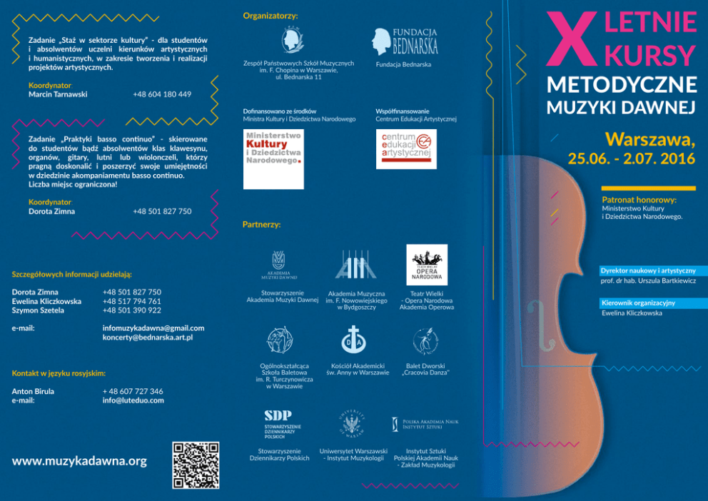 Organizatorzy: Zadanie „Staż w sektorze kultury” - dla studentów i absolwentów uczelni kierunków artystycznych i humanistycznych, w zakresie tworzenia i realizacji projektów artystycznych. Koordynator: Marcin Tarnawski Zespół Państwowych Szkół Muzycznych im. F. Chopina w Warszawie, ul. Bednarska 11 Fundacja Bednarska Dofinansowano ze środków Ministra Kultury i Dziedzictwa Narodowego Współfinansowanie Centrum Edukacji Artystycznej +48 604 180 449 Patronat honorowy: Ministerstwo Kultury i Dziedzictwa Narodowego. +48 501 827 750 Dyrektor naukowy i artystyczny prof. dr hab. Urszula Bartkiewicz Szczegółowych informacji udzielają: +48 501 827 750 +48 517 794 761 +48 501 390 922 Stowarzyszenie Akademia Muzyczna Akademia Muzyki Dawnej im. F. Nowowiejskiego w Bydgoszczy Teatr Wielki - Opera Narodowa Akademia Operowa e-mail: [email protected] [email protected] Kontakt w języku rosyjskim: Anton Birula e-mail: MUZYKI DAWNEJ 25.06. - 2.07. 2016 Partnerzy: Dorota Zimna Ewelina Kliczkowska Szymon Szetela METODYCZNE Warszawa, Zadanie „Praktyki basso continuo” - skierowane do studentów bądź absolwentów klas klawesynu, organów, gitary, lutni lub wiolonczeli, którzy pragną doskonalić i poszerzyć swoje umiejętności w dziedzinie akompaniamentu basso continuo. Liczba miejsc ograniczona! Koordynator: Dorota Zimna X LETNIE KURSY + 48 607 727 346 [email protected] www.muzykadawna.org Ogólnokształcąca Szkoła Baletowa im. R. Turczynowicza w Warszawie Stowarzyszenie Dziennikarzy Polskich Kościół Akademicki św. Anny w Warszawie Balet Dworski „Cracovia Danza” Uniwersytet Warszawski Instytut Sztuki - Instytut Muzykologii Polskiej Akademii Nauk - Zakład Muzykologii Kierownik organizacyjny Ewelina Kliczkowska Seminaria muzykologiczne Wykładowcy: Marek Rzepka śpiew Michael Schmidt - Casdorff flet traverso, kameralistyka Peter Frankenberg obój barokowy, kameralistyka Daniel Deuter Markus Mőllenbeck skrzypce barokowe, altówka barokowa, kameralistyka wiolonczela barokowa, kameralistyka Urszula Bartkiewicz klawesyn Maria Erdman Ewa Mrowca Anna Urszula Kucharska klawikord, organy, propedeutyka kompozycji barokowej kameralistyka z realizacją basso continuo na klawesynie praktyka basso continuo z elementami improwizacji basso continuo dla basowych Jakub Kościukiewicz instrumentów smyczkowych, kameralistyka Anton Birula, lutnia, gitara, teorba, kameralistyka Anna Kowalska Dorota Zimna realizacja basso continuo skrzypcowe barokowe, kameralistyka, Marcin Tarnawski podstawy improwizacji dla instrumentów orkiestrowych Karolina Koślacz viola da gamba (konsultacje) Romana Agnel taniec dawny, choreografia Dariusz Brojek taniec dawny, choreorelaksacja Małgorzata prezentacja sceniczna Kaczmarska - Rucińska Jacek Guzowski kurs temperacji historycznych i strojenia klawesynu Ewa Biały psychodedukacja Jakub Saniewski profilaktyka i rehabilitacja aparatu ruchowego muzyków Katarzyna Ewa Sokołowska, pianista korepetytor Alina Hoffman Weronika Janyst realizacja basso continuo prof. dr hab. Elżbieta Witkowska Zaremba dr hab. Barbara Przybyszewska – Jarmińska dr hab. Szymon Paczkowski Letnie Kursy Metodyczne Muzyki Dawnej adresowane są do muzyków (instrumentalistów, wokalistów, rytmików) oraz tancerzy: •nauczycieli szkół muzycznych wszystkich stopni, •studentów, absolwentów i wykładowców uczelni muzycznych, •uczniów i absolwentów szkół muzycznych II stopnia, •uczniów ostatnich klas oraz absolwentów szkół muzycznych I st. •uczniów i nauczycieli szkół baletowych, •zespołów kameralnych zajmujących się muzyką dawną •grup wokalno-instrumentalno-tanecznych działających przy ośrodkach kultury. Interdyscyplinarny charakter Kursów łączy praktykę muzyczną z tańcem, z mocnym ugruntowaniem wiedzy teoretycznej. Szeroka i kompleksowa oferta dydaktyczna, przebieg zajęć oraz ich treści programowe zostały opracowane i dostosowane pod kątem możliwości udziału uczestników będących na różnych poziomach zaawansowania i znajomości problematyki. Oferta skierowana jest nie tylko do osób zaznajomionych już z zagadnieniami wykonawczymi muzyki dawnej, ale przede wszystkim do uczestników (uczniów, studentów, a zwłaszcza nauczycieli szkolnictwa artystycznego) pragnących poznać i poszerzyć zakres dotychczasowych umiejętności gry na instrumentach współczesnych o praktykę gry na instrumentach historycznych oraz pogłębić wiedzę na temat stylistyki muzyki dawnej, doskonaląc zarazem własny warsztat artystyczny oraz dydaktyczne kompetencje. Akceptowane są zarówno instrumenty historyczne jak i współczesne. W seminariach kameralistyki mogą brać udział również uczestnicy grający na instrumentach spoza głównych dyscyplin Kursów. Oferta Kursów obejmuje: Seminaria i warsztaty specjalistyczne dla muzyków instrumentalistów (wykłady, lekcje otwarte oraz indywidualne konsultacje artystyczne dotyczące praktyk wykonawczych muzyki dawnej oraz metod ich nauczania i stosowania) w następujących dyscyplinach: •flet traverso •obój barokowy •skrzypce barokowe •altówka barokowa •wiolonczela barokowa •klawesyn •lutnia (renesansowa i barokowa), gitara (barokowa i romantyczna), teorba •organy •klawikord •viola da gamba (konsultacje praktyczne) Mistrzowski kurs wokalny (dla uczniów, studentów i absolwentów klas śpiewu. Liczba uczestników czynnych jest ograniczona.) Taniec dworski a)Warsztaty: (instrumentaliści, wokaliści, rytmicy, tancerze, amatorskie grupy taneczne) •grupa początkująca •grupa zaawansowana b)Seminarium dla uczniów i nauczyciel szkół baletowych •wykłady teoretyczne i warsztaty dla uczniów •wykłady metodyczne i lekcje pokazowe dla nauczycieli Seminaria naukowe z wykładami i panelami dyskusyjnymi prowadzone przez wykładowców kursu oraz ekspertów m.in. PAN i Instytutu Muzykologii UW Seminaria i warsztaty uzupełniające •podstawy improwizacji •kameralistyka •propedeuty