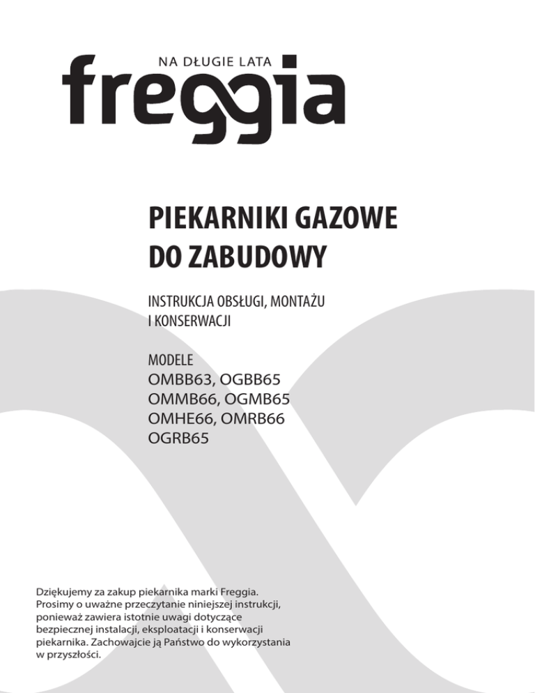 PIEKARNIKI GAZOWE DO ZABUDOWY INSTRUKCJA OBSŁUGI, MONTAŻU I KONSERWACJI MODELE OMBB63, OGBB65 OMMB66, OGMB65 OMHE66, OMRB66 OGRB65 Dziękujemy za zakup piekarnika marki Freggia. Prosimy o uważne przeczytanie niniejszej instrukcji, ponieważ zawiera istotnie uwagi dotyczące bezpiecznej instalacji, eksploatacji i konserwacji piekarnika. Zachowajcie ją Państwo do wykorzystania w przyszłości. GŁÓWNE KORZYŚCI • Powiększona objętość wewnętrzna • Podwójne szyby w drzwiach piekarnika zabezpieczające przed poparzeniem Ciebie i Twoje dzieci • Zabezpieczenie przeciwwypływowe gazu dla głównego palnika oraz palnika grilla gazowego • Zabezpieczenie przed przegrzaniem oraz bezpieczeństwo mebli dzięki systemowi chłodzenia obwodowego • System katalitycznego czyszczenia we wszystkich piekarnikach dla łatwiejszego utrzymania w czystości* • Łatwiejsze utrzymanie w czystości dzięki wyjmowanej szybie wewnętrznej • Drabinki boczne ułatwiające wysuwanie blachy** • Grill gazowy lub elektryczny** • Unikalna funkcja wymuszonego obiegu, zwiększająca efektywność pracy piekarnika i pozwalająca na poprawę jakości pieczenia** * Wszystkie piekarniki wyposażone są w tylny panel katalityczny. Niektóre modele posiadają także w wyposażeniu standardowym boczne panele katalityczne, lub można je dokupić osobno. ** W modelach wyposażonych w odpowiednie funkcje UWAGA! Ważne informacje dotyczące bezpieczeństwa. PRZYDATNA INFORMACJA: Dodatkowe informacje na temat funkcjonowania urządzenia. WSKAZÓWKA: Porady i wskazówki dotyczące eksploatacji urządzenia. SPIS TREŚCI GŁÓWNE KORZYŚCI.....................................................................................................................2 SPIS TREŚCI....................................................................................................................................3 INFORMACJE OGÓLNE...............................................................................................................4 OGÓLNE ZALECENIA DOTYCZĄCE EKSPLOATACJI PIEKARNIKA.................................5 PANEL STEROWANIA PIEKARNIKÓW SERII OGBB65.......................................................7 PANEL STEROWANIA PIEKARNIKÓW SERII OGMB65......................................................8 PANEL STEROWANIA PIEKARNIKÓW SERII OMBB63......................................................9 PANEL STEROWANIA PIEKARNIKÓW SERII OMRB66...................................................10 PANEL STEROWANIA PIEKARNIKÓW SERII OGRB65...................................................11 PANEL STEROWANIA PIEKARNIKÓW SERII OMMB66.................................................12 PANEL STEROWANIA PIEKARNIKÓW SERII OMHE66..................................................13 PROGRAMY PIECZENIA...........................................................................................................15 KORZYSTANIE Z ROŻNA.........................................................................................................16 PIECZENIE W PIEKARNIKU – PORADY PRAKTYCZNE....................................................17 KORZYSTANIE Z GRILLA........................................................................................................18 PALNIK PIEKARNIKA.................................................................................................................20 WENTYLATOR OBWODOWEGO SYSTEMU CHŁODZENIA..........................................20 KONSERWACJA I CZYSZCZENIE...........................................................................................21 ZDEJMOWANIE I ZAKŁADANIE DRZWICZEK PIEKARNIKA...........................................22 WYJMOWANIE I WSTAWIANIE WEWNĘTRZNEJ SZYBY DRZWICZEK...................24 SYSTEM KATALITYCZNEGO CZYSZCZENIA PIEKARNIKÓW.......................................25 ZDEJMOWANIE BOCZNYCH DRABINEK...........................................................................26 MONTAŻ PROWADNIC TELESKOPOWYCH.......................................................................27 WYMIANA ŻARÓWKI................................................................................................................28 INSTRUKCJA MONTAŻU PIEKARNIKA W MEBLACH KUCHENYCH.............................29 PODŁĄCZENIE PIEKARNIKA DO SIECI ELEKTRYCZNEJ..............................................31 PODŁĄCZENIE PIEKARNIKA DO SIECI GAZOWEJ........................................................33 CZĘŚCI ZAMIENNE I CZYNNOŚCI SERWISOWE...............................................................36 ZAŁĄCZNIK NR 1. DANE TECHNICZNE............................................................................37 SPIS TREŚCI 3 INFORMACJE OGÓLNE Niniejsze urządzenie oznaczone jest zgodnie z Dyrektywą Europejską 2002/96/EC oraz polską ustawą o zużytym sprzęcie elektrycznym i elektronicznym. Symbol <<przekreślony kosz>> umieszczony na produkcie oznacza, że nie jest on klasyfikowany jako odpad gospodarstwa domowego, w związku z czym po zakończeniu swojego okresu użyteczności użytkownik musi go przekazać do stosownego punktu zbiórki w celu recyklingu komponentów elektrycznych i elektronicznych. Urządzenie należy złomować zgodnie z lokalnymi przepisami w zakresie utylizacji odpadów. Dla uzyskania dodatkowych informacji na temat traktowania, odzyskiwania i recyklingu tego produktu, należy skontaktować się z odpowiednim lokalnym biurem, służbą odpadów domowych lub ze sklepem, w którym produkt został zakupiony. Przed złomowaniem zawsze należy doprowadzić urządzenie do stanu nieprzydatności odcinając kabel elektryczny. Właściwe postępowanie ze zużytym sprzętem elektrycznym i elektronicznym przyczynia się do ochrony środowiska naturalnego i zdrowia ludzi. Producent nie ponosi żadnej odpowiedzialności w przypadku niewłaściwego lub nieprawidłowego montażu urządzenia. Producent zastrzega sobie także prawo do dokonywania niezbędnych i k