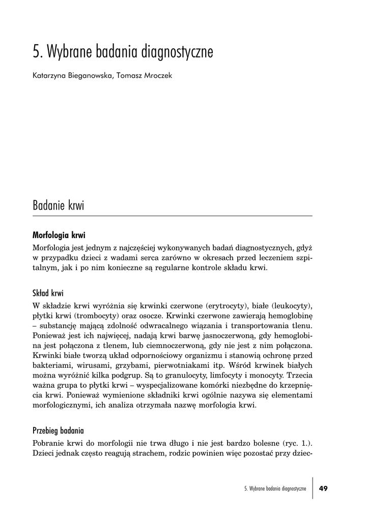 5. Wybrane badania diagnostyczne Katarzyna Bieganowska, Tomasz Mroczek Badanie krwi Morfologia krwi Morfologia jest jednym z najczęściej wykonywanych badań diagnostycznych, gdyż w przypadku dzieci z wadami serca zarówno w okresach przed leczeniem szpitalnym, jak i po nim konieczne są regularne kontrole składu krwi. Skład krwi W składzie krwi wyróżnia się krwinki czerwone (erytrocyty), białe (leukocyty), płytki krwi (trombocyty) oraz osocze. Krwinki czerwone zawierają hemoglobinę – substancję mającą zdolność odwracalnego wiązania i transportowania tlenu. Ponieważ jest ich najwięcej, nadają krwi barwę jasnoczerwoną, gdy hemoglobina jest połączona z tlenem, lub ciemnoczerwoną, gdy nie jest z nim połączona. Krwinki białe tworzą układ odpornościowy organizmu i stanowią ochronę przed bakteriami, wirusami, grzybami, pierwotniakami itp. Wśród krwinek białych można wyróżnić kilka podgrup. Są to granulocyty, limfocyty i monocyty. Trzecia ważna grupa to płytki krwi – wyspecjalizowane komórki niezbędne do krzepnięcia krwi. Ponieważ wymienione składniki krwi ogólnie nazywa się elementami morfologicznymi, ich analiza otrzymała nazwę morfologia krwi. Przebieg badania Pobranie krwi do morfologii nie trwa długo i nie jest bardzo bolesne (ryc. 1.). Dzieci jednak często reagują strachem, rodzic powinien więc pozostać przy dziec- 5. Wybrane badania diagnostyczne 49 Ryc. 1. Nawet starsze dzieci nie lubią pobierania krwi ku, by odwrócić jego uwagę od czynności wykonywanych przez personel medyczny. W przypadku dzieci starszych pomaga posmarowanie miejsca wkłucia kremem znieczulającym EMLA pół godziny przed badaniem. Do badania dziecko należy ułożyć w pozycji leżącej lub posadzić na kolanach rodzica. Krew pobierana jest najczęściej z żyły w zgięciu łokciowym lub z innych żył, a także z opuszki palca (zwykle u małych dzieci), z płatka ucha, a tętnicza bezpośrednio z tętnic, np. promieniowej (nadgarstek) lub udowej (nakłucie w pachwinie). Aby oszczędzić dzieciom niepotrzebnego stresu, w warunkach szpitalnych krew do badania pobiera się z istniejących już wkłuć i cewników założonych do naczyń tętniczych lub żylnych. Wynik morfologii krwi W przeszłości analizy i obliczenia dotyczące morfologii krwi wykonywano pod mikroskopem. Obecnie pracę tę wykonują automatycznie maszyny. Wynik badania morfologicznego krwi otrzymuje się najczęściej w postaci wydruku komputerowego w języku polskim lub angielskim. W terminologii angielskiej najczęściej stosuje się następujące skróty: WBC – krwinki białe (leukocyty) RBC – krwinki czerwone (erytrocyty) HGB lub Hb – hemoglobina MCV – średnia objętość krwinki czerwonej RDW – rozkład objętości krwinek czerwonych PLT – płytki krwi (trombocyty). Krwinki białe (WBC) – zwiększenie ich liczby ponad normę oznacza leukocytozę, a zmniejszenie – leukopenię. Leukocytoza może być wywołana wieloma przyczynami; najczęściej powoduje ją stan zapalny w organizmie. Krwinki czerwone (RBC) – zwiększenie ich liczby to erytrocytoza, zmniejszenie – erytropenia. Erytrocytoza (czyli czerwienica) u dzieci z wrodzonymi 50 Dziecko z wadą serca wadami serca najczęściej spowodowana jest zmniejszonym dostarczaniem tlenu do tkanek, które wpływa na zwiększoną produkcję hormonu pobudzającego wytwarzanie krwinek czerwonych, tzw. erytropoetyny. Przeciwność tego stanu stanowi niedokrwistość, wywołana krwawieniem zewnętrznym lub wewnętrznym, niedostateczną produkcją krwinek czerwonych lub nadmiernym ich rozpadem. Płytki krwi (PLT) – zwiększona liczba płytek – nadpłytkowość (trombocytoza) – występuje w przypadku różnych stanów zapalnych. Częściej stwierdza się małopłytkowość (trombocytopenię) spowodowaną np. uogólnionym zakażeniem i wewnątrznaczyniowym wykrzepianiem krwi. U dzieci z wrodzonymi wadami serca niezwykle istotna jest ocena wskaźnika hematokrytu, czyli stosunku objętości krwinek czerwonych do całkowitej objętości krwi. W wadach sinicznych, w których ilość tlenu dostarczana do tkanek jest niewystarczająca, organizm uruchamia mechanizmy obronne. Wytwarzany jest hormon – erytropoetyna – który stymuluje produkcję krwinek czerwonych. Jednak nadmierne wytwarzanie krwinek czerwonych może spowodować zagęszczenie krwi. Wskaźnik hematokrytu, zwany popularnie hematokrytem, wynosi wtedy powyżej 60%. Paradoksalnie krew, choć zawiera zwiększoną liczbę krwinek czerwonych, transportuje mniejszą ilość tlenu, ponieważ staje się zbyt gęsta, wzrasta jej lepkość i opory przepływu w naczyniach. W takich sytuacjach mniejsza ilość krwi dopływa do tkanek. Dodatkowo stan taki sprzyja wykrzepianiu krwi w naczyniach, co daje ciężkie powikłania, do których należą: zatory naczyń ośrodkowego układu nerwowego, zatory tętnic płucnych lub innych naczyń. Niedokrwistość (anemia), charakteryzująca się małą zawartością hemoglobiny we krwi, jest również stanem niekorzystnym, ponieważ krew nie może przetransportować wystarczającej ilości tlenu do tkanek. Ma to szczególne znaczenie u dzieci z wadami sinicznymi serca oraz u dzieci z niewydolnością krążenia. Rodzice powinni jednak pamiętać, że każdy wynik morfologii krwi jest obarczony pewnym ryzykiem błędu. Może być to spowodowane nieprawidłowym odczytem aparatu lub pomyłką w laboratorium. Analizę wyników należy więc pozostawić lekarzom, którzy znając dziecko i jego wadę serca, mogą właściwie je zinterpretować. Badanie gazometryczne i równowaga kwasowo-zasadowa Badania gazometryczne oraz równowagi kwasowo-zasadowej (popularnie oba badania nazywa się „badaniem gazometrycznym”) należą do podstawowych badań wykonywanych w celu oceny wydolności układu oddechowego i układu krążenia. Prawidłowy wynik daje jedynie badanie wykonane bezpośrednio po pobraniu krwi, ponieważ dłuższy kontakt próbk