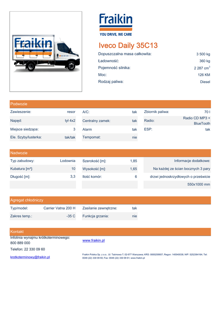 Iveco Daily 35C13 Dopuszczalna masa całkowita: 3 500 kg Ładowność: 360 kg Pojemność silnika: 2 287 cm3 Moc: 126 KM Rodzaj paliwa: Diesel Podwozie Zawieszenie: resor Napęd: tył 4x2 Miejsce siedzące: 3 Ele. Szyby/lusterka: tak/tak A/C: tak Zbiornik paliwa: Centralny zamek: tak Radio: Alarm tak ESP: Tempomat: nie 70 l Radio CD MP3 + BlueTooth tak Nadwozie Typ zabudowy: Lodownia Szerokość [m]: 1,85 Informacje dodatkowe: Kubatura [m³]: 10 Wysokość [m]: 1,65 Na każdej ze ścian bocznych 3 pary Długość [m]: 3,3 Ilość komór: 6 drzwi jednoskrzydłowych o prześwicie 550x1000 mm Agregat chłodniczy Typ/model: Carrier Vatna 200 H Zakres temp.: -35 C Zasilanie zewnętrzne: tak Funkcja grzania: nie Kontakt Infolinia wynajmu krótkoterminowego: 800 889 000 www.fraikin.pl Telefon: 22 330 09 60 [email protected] Fraikin Polska Sp. z o.o.. Ul. Taśmowa 7; 02-677 Warszawa; KRS: 0000258807; Regon: 140540038; NIP: 5252364164; Tel: 0048 (22) 330 09 60; Fax: 0048 (22) 330 09 61; www.fraikin.pl