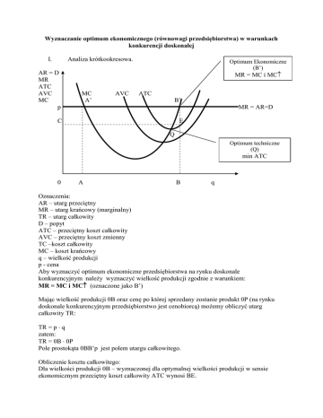 Wyznaczanie optimum ekonomicznego (równowagi przedsiębiorstwa) w warunkach konkurencji doskonałej Analiza krótkookresowa. I. AR = D MR ATC AVC MC p Optimum Ekonomiczne (B’) MR = MC i MC MC A’ AVC ATC B’ MR = AR=D C E Q Optimum techniczne (Q) min ATC 0 A B q Oznaczenia: AR – utarg przeciętny MR – utarg krańcowy (marginalny) TR – utarg całkowity D – popyt ATC – przeciętny koszt całkowity AVC – przeciętny koszt zmienny TC –koszt całkowity MC – koszt krańcowy q – wielkość produkcji p - cena Aby wyznaczyć optimum ekonomiczne przedsiębiorstwa na rynku doskonale konkurencyjnym należy wyznaczyć wielkość produkcji zgodnie z warunkiem: MR = MC i MC (oznaczone jako B’) Mając wielkość produkcji 0B oraz cenę po której sprzedany zostanie produkt 0P (na rynku doskonale konkurencyjnym przedsiębiorstwo jest cenobiorcą) możemy obliczyć utarg całkowity TR: TR = p q zatem: TR = 0B 0P Pole prostokąta 0BB’p jest polem utargu całkowitego. Obliczenie kosztu całkowitego: Dla wielkości produkcji 0B – wyznaczonej dla optymalnej wielkości produkcji w sensie ekonomicznym przeciętny koszt całkowity ATC wynosi BE. TC to dla wyliczenia kosztu całkowitego TC wystarczy pomnożyć q przeciętny koszt całkowity ATC przez wielkość produkcji q. Zatem: TC= BE 0B Pole prostokąta 0BEC jest polem kosztu całkowitego. Ponieważ ATC = Obliczenie zysku ekonomicznego polega na odjęciu od pola utargu całkowitego TR pola kosztu całkowitego TC. Zysk Ekonomiczny = 0BB’p – 0BEC Zysk ekonomiczny przedstawia pole prostokąta CEB’p Wnioski: W powyżej przedstawionym przykładzie widzimy, że przedsiębiorstwo znajdując się w stanie równowagi krótkookresowej może osiągać zysk ekonomiczny. Ponadto optimum ekonomiczne występuje przy większym wolumenie produkcji niż optimum techniczne. Wynika z tego, że przedsiębiorstwo maksymalizuje zysk ponosząc wyższe koszty jednostkowe niż miałoby to miejsce w sytuacji, gdyby przedsiębiorstwo wytwarzało wielkość produkcji określoną przez optimum techniczne. Istnienie zysku ekonomicznego w danej gałęzi zachęca innych potencjalnych producentów do wejścia do tej gałęzi. Prowadzić to będzie do wzrostu podaży dobra na rynku wywołując spadek jego ceny. W następstwie czego wystąpi tendencja do zanikania zysku ekonomicznego w sytuacji równowagi długookresowej panującej w danej gałęzi. I Długookresowa równowaga przedsiębiorstwa w warunkach równowagi całej gałęzi produkcji AR = D MR AC MC MC AC A’ B’ p MR = AR=D Optimum ekonomiczne (B’) pokrywa się z optimum technicznym (min AC) 0 A B q W długim okresie wszystkie koszty są zmienne, dlatego nie ma rozbicia na ATC i AVC (Na rysunku występuje tylko jedna krzywa przeciętnych kosztów AC). Wyznaczanie: Utarg całkowity = 0B BB’ Utarg całkowity przedstawia pole prostokąta 0BB’p Koszt całkowity = 0B BB’ Koszt całkowity przedstawia pole prostokąta 0BB’p Utarg całkowity = koszt całkowity Zatem: W warunkach równowagi długookresowej zysk ekonomiczny wynosi 0.