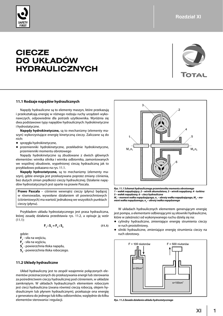 Rozdział XI: Ciecze do układów hydraulicznych Rozdział XI CIECZE DO UKŁADÓW HYDRAULICZNYCH 11.1 Rodzaje napędów hydraulicznych Napędy hydrauliczne są to elementy maszyn, które przekazują i przekształcają energię w różnego rodzaju ruchy urządzeń wykonawczych, odpowiednie dla potrzeb użytkownika. Wyróżnia się dwa podstawowe typy napędów hydraulicznych: hydrokinetyczne i hydrostatyczne. Napędy hydrokinetyczne, są to mechanizmy (elementy maszyn) wykorzystujące energię kinetyczną cieczy. Zaliczane są do nich: q sprzęgła hydrokinetyczne, q przemienniki hydrokinetyczne, przekładnie hydrokinetyczne, przemienniki momentu obrotowego Napędy hydrokinetyczne są zbudowane z dwóch głównych elementów: wirnika silnika i wirnika odbiornika, zamontowanych we wspólnej obudowie, wypełnionej cieczą hydrauliczną jak to przykładowo pokazano na rys. 11.1. Napędy hydrostatyczne, są to mechanizmy (elementy maszyn), gdzie energia jest przekazywana poprzez zmiany ciśnienia, bez dużych zmian prędkości cieczy hydraulicznej. Działanie napędów hydrostatycznych jest oparte na prawie Pascala. Prawo Pascala – ciśnienie wewnątrz cieczy (płynu) będącej w równowadze, wywołane działaniem sił powierzchniowych (ciśnieniowych) ma wartość jednakową we wszystkich punktach cieczy (płynu). Przykładem układu hydrostatycznego jest prasa hydrauliczna, której zasadę działania przedstawia rys. 11.2, a opisuje ją wzór (11.1): F1 : S1 = F2 : S2 (11.1) gdzie: F1 - siła na wejściu, F2 - siła na wyjściu, S1 - powierzchnia tłoka napędu, S2 - powierzchnia tłoka roboczego. Rys. 11.1 Schemat hydraulicznego przemiennika momentu obrotowego 1 – wałek napędzający, 2 – wirnik akumulatora, 3 – wirnik napędzany, 4 - turbina 5 – wałek napędzany, 6 – ciecz hydrauliczna M1 – moment wałka napędzającego, n1 – obroty wałka napędzającego, M2 – moment wałka napędzanego, n2 – obroty wałka napędzanego W układach hydraulicznych elementem generującym energię jest pompa, a elementami odbierającymi są siłowniki hydrauliczne, które w zależności od wykonywanego ruchu dzielą się na: q cylindry hydrauliczne, zmieniające energię strumienia cieczy w ruch prostoliniowy, q silniki hydrauliczne, zmieniające energię strumienia cieczy na ruch obrotowy. 11.2 Układy hydrauliczne Układ hydrauliczny jest to zespół wzajemnie połączonych elementów przeznaczonych do przekazywania energii lub sterowania za pośrednictwem cieczy hydraulicznej pod ciśnieniem, w układzie zamkniętym. W układach hydraulicznych elementem roboczym jest ciecz hydrauliczna (zwana również cieczą roboczą, olejem hydraulicznym lub płynem hydraulicznym), przekazuje ona energię z generatora do jednego lub kilku odbiorników, względnie do kilku elementów sterowania i regulacji. Rys. 11.2 Zasada działania układu hydrostatycznego XI 1 Poszczególne zespoły układów hydraulicznych są połączone między sobą przewodami hydraulicznymi. W niniejszym opracowaniu przedstawiono jedynie specyficzną grupę cieczy hydraulicznych – ciecze do układów hydrostatycznych. Podstawowymi elementami hydraulicznych układów hydrostatycznych są: q pompy hydrauliczne (trybikowe, tłokowe, nurnikowe itp.), q siłowniki hydrauliczne (silniki liniowe), q silniki hydrauliczne (obrotowe), q zawory, q filtry, q przewody hydrauliczne, q zbiornik cieczy hydraulicznej, q układ odpowietrzający, q zespoły pomiarowe i pomocnicze (manometry, przepływomierze, króćce do pobierania próbek, chłodnice itp.), q ciecz hydrauliczna. Układy hydrauliczne mogą napędzać jeden (pojedyncze) albo wiele (wielokrotne) cylindrów hydraulicznych lub silników hydraulicznych. Schemat hydrostatycznego układu hydraulicznego z siłownikiem hydraulicznym i silnikiem hydraulicznym, przedstawiono na rys. 11.3 Rys. 11.3 Schemat hydrostatycznego układu hydraulicznego 1 – zbiornik z cieczą hydrauliczną, 2 – zawór zwrotny, 3 – pompa hydrauliczna, 4 – filtr (by–pass), 5 – zawór regulujący dopływ cieczy hydraulicznej do silnika hydraulicznego, 6 – silnik hydrauliczny, 7 – zawór regulujący dopływ cieczy hydraulicznej do siłownika hydraulicznego, 8 – siłownik hydrauliczny, 9 – filtr, 10 – odpowietrzenie, 11 – zawór do zlewania odstojów 11.3 Funkcje cieczy hydraulicznych Ponieważ układy hydrauliczne znalazły liczne zastosowania, między innymi w przemysłach: maszynowym, samochodowym, lotniczym, metalurgicznym, zbrojeniowym, tworzyw sztucznych, w automatyce, w obrabiarkach, w rolnictwie, w budownictwie, w robotach publicznych i wielu innych; w technice tej dokonuje się nieustający postęp. Nowoczesne technologie wymagają spełnienia ściśle określonych i coraz ostrzejszych kryteriów w zakresie: q niezawodności i trwałości stosowanych materiałów konstrukcyjnych, 2 XI q optymalnych parametrów cieczy hydraulicznych, q łatwego dostosowania układów hydraulicznych do różnych maszyn i innych technologii (na przykład elektroniki), q przekazywania coraz większych mocy (na przykład moc rzędu 1000 kW w napędach wiertniczych), q coraz mniejszego stosunku masy układów hydraulicznych do przenoszonej mocy, q uproszczenia metod kontroli, przy jednoczesnym zwiększeniu ich precyzji, q łatwej i szybkiej konserwacji. Wszystkie wymienione czynniki stawiają przed cieczą hydrauliczną wymagania coraz trudniejsze do spełnienia. Ciecz hydrauliczna ma za zadanie przenieść energię z napędu hydraulicznego (najczęściej pompy hydraulicznej) do odbiorników (elementów wykonawczych), takich jak: cylindry i silniki hydrauliczne, wykonujących czynności wymagane przez użytkownika. Ciecz hydrauliczna we współczesnych układach hydraulicznych spełnia następujące, podstawowe funkcje: q przenoszenie energii i sygnałów sterujących, q smarowanie ruchomych elementów, q odprowadzanie ciepła, q odprowadzanie zanieczyszczeń stałych z układu, q uszczelnianie układu. 