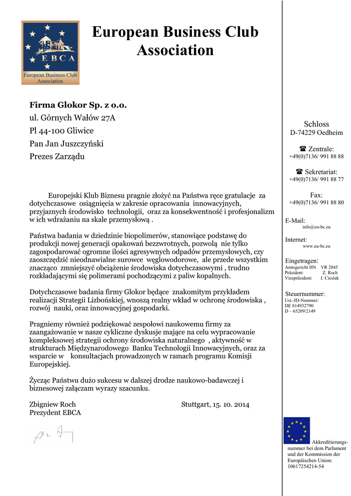 European Business Club Association Firma Glokor Sp. z o.o. ul. Górnych Wałów 27A Schloss Pl 44-100 Gliwice D-74229 Oedheim Pan Jan Juszczyński Zentrale: Prezes Zarządu +49(0)7136/ 991 88 88 Sekretariat: +49(0)7136/ 991 88 77 Europejski Klub Biznesu pragnie złożyć na Państwa ręce gratulacje za dotychczasowe osiągnięcia w zakresie opracowania innowacyjnych, przyjaznych środowisko technologii, oraz za konsekwentność i profesjonalizm w ich wdrażaniu na skale przemysłową . Fax: +49(0)7136/ 991 88 80 E-Mail: [email protected] Państwa badania w dziedzinie biopolimerów, stanowiące podstawę do produkcji nowej generacji opakowań bezzwrotnych, pozwolą nie tylko zagospodarować ogromne ilości agresywnych odpadów przemysłowych, czy zaoszczędzić nieodnawialne surowce węglowodorowe, ale przede wszystkim znacząco zmniejszyć obciążenie środowiska dotychczasowymi , trudno rozkładającymi się polimerami pochodzącymi z paliw kopalnych. Amtsgericht HN VR 2845 Präsident: Z. Roch Vizepräsident: J. Cieslak Dotychczasowe badania firmy Glokor będące znakomitym przykładem realizacji Strategii Lizbońskiej, wnoszą realny wkład w ochronę środowiska , rozwój nauki, oraz innowacyjnej gospodarki. Ust.-ID-Nummer: DE 814932790 D – 65209/2149 Internet: www.eu-bc.eu Eingetragen: Steuernummer: Pragniemy również podziękować zespołowi naukowemu firmy za zaangażowanie w nasze cykliczne dyskusje mające na celu wypracowanie kompleksowej strategii ochrony środowiska naturalnego , aktywność w strukturach Międzynarodowego Banku Technologii Innowacyjnych, oraz za wsparcie w konsultacjach prowadzonych w ramach programu Komisji Europejskiej. Życząc Państwu dużo sukcesu w dalszej drodze naukowo-badawczej i biznesowej załączam wyrazy szacunku. Zbigniew Roch Prezydent EBCA Stuttgart, 15. 10. 2014 Akkreditierungsnummer bei dem Parlament und der Kommission der Europäischen Union: 10617254214-54
