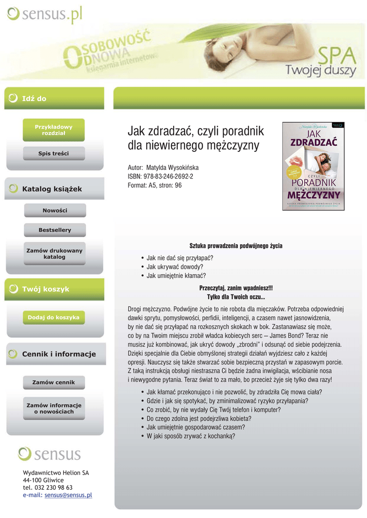 Idź do Przykładowy rozdział Spis treści Katalog książek Nowości Bestsellery Bestesllery Zamów drukowany katalog Twój koszyk Dodaj do koszyka Cennik i informacje Zamów cennik Zamów informacje o nowościach Wydawnictwo Helion SA 44-100 Gliwice tel. 032 230 98 63 e-mail: [email protected] Jak zdradzać, czyli poradnik Sekret przyciągania. dla niewiernego mężczyzny Odkrywaj prawa rządzące miłoœcią i seksem Autor: Matylda Wysokińska ISBN: 978-83-246-2692-2 Autor: Sandra Anne Taylor Format: A5, stron: 96 Tłumaczenie: Marta Borkowska ISBN: 978-83-246-1819-4 Tytuł oryginału: Secrets of Attraction: The Universal Laws of Love, Sex and Romance Format: A5, stron: 280 Sztuka prowadzenia podwójnego życia Magnetyzm uczuć • Jak nie dać się przyłapać? • Prawo przyciągania • Jak ukrywać dowody? • Prawo czystego pożądania • Jak umiejętnie kłamać? • Prawo paradoksalnego zamiaru Przeczytaj, zanim wpadniesz!!! • Prawo harmonii Tylko dla Twoich oczu… Energetyzująca miłoœć Drogi mężczyzno. Podwójne życie to nie robota dla mięczaków. Potrzeba odpowiedniej Całe życie jest wymianą energii. Tej, która wypływa z Ciebie, i tej, którą emitują dawki sprytu, pomysłowoœci, perfidii, inteligencji, a czasem nawet jasnowidzenia, inni ludzie. Ekscytujące krzyżowanie spojrzeń, bolesne ukłucie szpilką złoœliwoœci by nie dać się przyłapać na rozkosznych skokach w bok. Zastanawiasz się może, czy zapierające dech w piersi oœwiadczyny — to wszystko jest bezpoœrednią co by na Twoim miejscu zrobił władca kobiecych serc — James Bond? Teraz nie konsekwencją fal energetycznych, które wytwarzasz każdego dnia. Poznaj prawa musisz już kombinować, jak ukryć dowody „zbrodni” i odsunąć od siebie podejrzenia. kierujące fizyką emocji i zacznij œwiadomie kształtować swoje przeznaczenie. Dzięki specjalnie dla Ciebie obmyœlonej strategii działań wyjdziesz cało z każdej Przyciągaj pozytywne wibracje, miłe doœwiadczenia czyprzystań niespodziewane uczuciaporcie. opresji. Nauczysz się także stwarzać sobie bezpieczną w zapasowym jak magnes. Nawet jeœliniestraszna dziœ słowa Ci te będzie brzmiążadna w Twoich uszach wœcibianie jak niezrozumiałe Z— taką instrukcją obsługi inwigilacja, nosa zaklęcia, właœnie ta książka pomoże Ci zrozumieć, co składa się na Twoje osobiste i niewygodne pytania. Teraz œwiat to za mało, bo przecież żyje się tylko dwa razy! pole energetyczne i w jaki sposób wpływa ono na Twoje życie. Pamiętaj, że ma to • Jak kłamać przekonująco i nie pozwolić, by zdradziła Cię mowa ciała? większe znaczenie w relacjach międzyludzkich niż Twój wygląd, intelekt czy status • Gdzie i jak się spotykać, by zminimalizować ryzyko przyłapania? materialny. Niezależnie od tego, czy jesteœ w związku, czy też szukasz partnera, • Co zrobić, by nie wydały Cię Twój telefon i komputer? dysponujesz wewnętrzną siłą, aby zmienić Waszą wzajemną energię i wciąż na nowo • Do czego zdolna jest podejrzliwa kobieta? doœwiadczać intymnoœci, oddania oraz prawdziwej miłoœci! • Jak umiejętnie gospodarować czasem? osobiste pole energetyczne • WNastrój jaki sposób zrywać z kochanką? i zacznij wirować w orbicie miłoœci • Panowanie nad energią umysłu. • Uniwersalne prawa, decydujące o Twoim losie. • Przyciąganie okreœlonych osób i wymarzonych związków. • Miłoœć własna i uszczęœliwianie innych. • Uzdrawianie bolesnych relacji. • Opcje właœciwej dla Ciebie afirmacji. SPIS TREŚCI Przedmowa .....................................................................................5 Wstępniaczek .................................................................................7 1. Dobre złego początki… .................................................................9 2. W domu i poza domem ................................................................13 3. Telefon ..........................................................................................19 4. Dowody zbrodni ...........................................................................23 5. Internet .........................................................................................27 6. Kłamstwa ......................................................................................33 7. Kilka słów o kobiecej naturze, czyli najlepsze przyjaciółki .......41 8. Do czego podejrzliwa kobieta jest zdolna, a do czego by się nie przyznała… ...............................................45 9. Od czego się to wszystko zaczęło, czyli podejrzliwe paranoje ...........................................................51 10. Tło .................................................................................................57 11. Zachowanie i stereotypy ..............................................................61 12. Jak znaleźć na to wszystko czas? .................................................65 13. Prezenty ........................................................................................69 14. Wypieraj się, wypieraj, wypieraj .................................................73 15. A jeśli sprawy zajdą za daleko? ....................................................77 16. O ukrywaniu tajemnic ..................................................................83 Słowo na koniec ............................................................................87 Dowody zbrodni 4. DOWODY ZBRODNI Dowody zbrodni 23 24 J AK N ZDRADZAĆ , CZYLI PORADNIK DLA NIEWIERNEGO MĘŻCZYZNY o dobrze, skupmy się teraz na jakże ważnym, a tak bardzo ignorowanym przez mężczyzn dopuszczających się zdrady aspekcie, jakim są dowody. Ja wiem, że jesteś zapracowanym mężczyzną, który nie przywiązuje większej wagi do szczegółów. W tej materii szczegóły są jednak wszystkim. Jeden mały szczegół może być powodem do karczemnej awantury, a w dalszej perspektywie naw