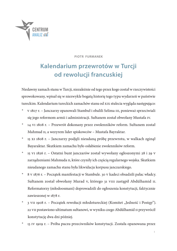PIOTR FURMANEK Kalendarium przewrotów w Turcji od rewolucji francuskiej Niedawny zamach stanu w Turcji, niezależnie od tego przez kogo został w rzeczywistości sprowokowany, wpisał się w niezwykle bogatą historię tego typu wydarzeń w państwie tureckim. Kalendarium tureckich zamachów stanu od xix stulecia wygląda następująco: * v 1807 r. – Janczarzy opanowali Stambuł i obalili Selima iii, ponieważ sprzeciwiali się jego reformom armii i administracji. Sułtanem został obwołany Mustafa iv. * 14 vi 1808 r. – Przewrót dokonany przez zwolenników reform. Sułtanem został Mahmud ii, a wezyrem lider spiskowców – Mustafa Bayraktar. * 15 xi 1808 r. – Janczarzy podjęli nieudaną próbę przewrotu, w walkach zginął Bayaraktar. Skutkiem zamachu było osłabienie zwolenników reform. * 15 vi 1826 r. – Ostatni bunt janczarów został wywołany ogłoszonymi 28 i 29 v zarządzeniami Mahmuda ii, które czyniły ich częścią regularnego wojska. Skutkiem nieudanego zamachu stanu była likwidacja korpusu janczarskiego. * 8 v 1876 r. – Początek manifestacji w Stambule. 30 v kadeci obsadzili pałac władcy. Sułtanem został obwołany Murad v, którego 31 viii zastąpił Abdülhamid ii. Reformatorzy (młodoosmani) doprowadzili do ogłoszenia konstytucji, faktycznie zawieszonej w 1878 r. * 3 vii 1908 r. – Początek rewolucji młodotureckiej (Komitet „Jedność i Postęp”). 22 vii postawiono ultimatum sułtanowi, w wyniku czego Abdülhamid ii przywrócił konstytucję dwa dni później. * 13 iv 1909 r. – Próba puczu przeciwników konstytucji. Została opanowana przez 1 młodoturków 24 iv po zajęciu Stambułu. Abdülhamid ii został zdetronizowany, a zastąpił go Mehmed v. * 21 vii 1912 r. – Ugrupowanie „Wolność i Zgoda” przejęło władzę w wyniku przewrotu. * 23 i 1913 r. – Młodoturcy wrócili do władzy w wyniku zamachu stanu Envera Paszy. * 22 vi 1919 r. – Odezwa Mustafy Kemala w obliczu sytuacji międzynarodowej i w obliczu nieudolności rządu sułtańskiego. 4 ix Kongres Narodowy zebrany w Sivas potwierdził nienaruszalność „granic narodowych” Turcji. 27 xii siedzibą „kemalistów” stała się Ankara. 25 iv 1920 r. zwołano tam Wielkie Zgromadzenie Narodowe, które ogłosiło przejęcie władzy ustawodawczej i wykonawczej w kraju. Przewodniczącym wybrano Mustafę Kemala. 20 i 1921 r. WZN uchwaliło tymczasową konstytucję. 1 xi 1922 r. zniesiono sułtanat. 29 x 1923 r. ogłoszono Republikę Turecką. * 27 v 1960 r. – Wojskowy zamach stanu generała Gursela. Komitet Jedności Narodowej wykorzystał osłabienie pozycji rządu spowodowaną gwałtownymi protestami społecznymi (27 iv ogłoszono stan wyjątkowy) i przejął władzę. vii 1961 r. zmieniono konstytucję, po wyborach w x 1961 r. Gursel został prezydentem. * 22 ii 1962 r. – Nieudany zamach stanu pułkownika Talata Aydemira. Celem było dokonanie reform zaniechanych przez KJN. * 20 v 1963 r. – Kolejny nieudany zamach stanu Aydemira. * 12 iii 1971 r. – Memorandum wojskowych do rządu z żądaniem zaprowadzenia porządku w państwie (starcia bojówek lewicowych i prawicowych pokolenia ‘68). 26 iii powołano „ponadpartyjny rząd fachowców”. * 27 xii 1979 r. – List szefa sztabu i dowódców sił zbrojnych do prezydenta w reakcji na nową falę terroru bojówek lewicowych i prawicowych. 2 i 1980 r. został on opublikowany w prasie i odczytany w telewizji. * 12 ix 1980 r. – Wojskowy (ale bezkrwawy) zamach stanu w reakcji na narastające anarchię i terror. Generał Kenan Evren, szef sztabu, został ogłoszony głową państwa. Władzę przejęła Rada Bezpieczeństwa Narodowego. * 28 ii/ 1 iii 1997 r. – Wojskowi przedstawili premierowi Erbakanowi listę 20 żądań, w których domagali się rewizji polityki rządu. 18 vi premier złożył dymisję. 2 * 15 vii 2016 r. – Nieudany wojskowy zamach stanu, o którym szerzej w analizie Konrada Kotlarczyka (http://analizy.koliber.org/proba-puczu-w-turcji-komentarzkonrada-kotlarczyka/). Redakcja: Marcin Sobiczewski, Judyta Zegan Skład: Judyta Zegan