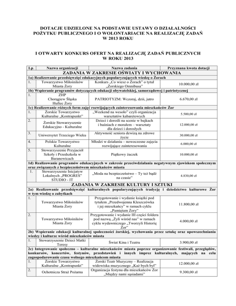 DOTACJE UDZIELONE NA PODSTAWIE USTAWY O DZIAŁALNOŚCI POŻYTKU PUBLICZNEGO I O WOLONTARIACIE NA REALIZACJĘ ZADAŃ W 2013 ROKU I OTWARTY KONKURS OFERT NA REALIZACJĘ ZADAŃ PUBLICZNYCH W ROKU 2013 Lp. Nazwa organizacji Nazwa zadania Przyznana kwota dotacji ZADANIA W ZAKRESIE OŚWIATY I WYCHOWANIA 1a) Realizowanie przedsięwzięć edukacyjnych popularyzujących wiedzę o Żorach 1. Towarzystwo Miłośników Konkurs „Co wiesz o Żorach” o tytuł 10.000,00 zł Miasta Żory „Żorskiego Omnibusa” 1b) Wspieranie programów dotyczących edukacji obywatelskiej, samorządowej i patriotycznej 1. ZHP Chorągiew Śląska PATRIOTYZM: Wczoraj, dziś, jutro 6.670,00 zł Hufiec Żory 1c) Realizowanie różnych form zajęć rozwijających zainteresowania mieszkańców Żor 1. Żorskie Towarzystwo „Weekend na wesoło” czyli organizacja 5.500,00 zł Kulturalne „Kontrapunkt” warsztatów kabaretowych 2. Dzieci i dorośli na scenie w bajkach Żorskie Stowarzyszenie 12.000,00 zł i baśniach z morałem – warsztaty Edukacyjno - Kulturalne dla dzieci i dorosłych 3. Aktywność seniora dewizą na zdrowe 30.000,00 zł Uniwersytet Trzeciego Wieku życie 4. Polskie Towarzystwo Młodzi w działaniu – nowoczesne zajęcia 6.000,00 zł Kulturalne rozwijające zainteresowania 5. Stowarzyszenie Przyjaciół 10.000,00 zł Szkoły i Przedszkola w Piątkowy żaczek Baranowicach 1d) Realizowanie programów edukacyjnych w zakresie przeciwdziałania negatywnym zjawiskom społecznym oraz związanych z bezpieczeństwem mieszkańców miasta 1. Stowarzyszenie Inicjatyw „Moda na bezpieczeństwo – Ty też bądź 4.830,00 zł Lokalnych „PROGRES” na czasie” STUDIO - IT ZADANIA W ZAKRESIE KULTURY I SZTUKI 2a) Realizowanie przedsięwzięć kulturalnych popularyzujących tradycję i dziedzictwo kulturowe Żor w tym wiedzę o zabytkach 1. Przygotowanie i wydanie książki pod Towarzystwo Miłośników tytułem „Przedwojenna Kleszczówka 11.800,00 zł Miasta Żory i jej mieszkańcy” w ramach cyklu „Pamiętam Żory” 2. Przygotowanie i wydanie III części foldera Towarzystwo Miłośników pod nazwą „Żyli wśród nas” w ramach 4.000,00 zł Miasta Żory cyklu wydawniczego „Tworzyli Historię Żor” 2b) Wspieranie edukacji kulturalnej społeczności żorskiej, wychowania przez sztukę oraz upowszechniania wiedzy i kulturze wśród mieszkańców miasta 1. Stowarzyszenie Dzieci Matki Świat Kina i Teatru 3.900,00 zł Teresy 2c) Integrowanie społeczno – kulturalne mieszkańców miasta poprzez organizowanie festiwali, przeglądów, konkursów, koncertów, festynów, przedstawień i innych imprez kulturalnych, mających na celu zagospodarowanie czasu wolnego mieszkańcom miasta 1. Żorskie Towarzystwo Żorski Teatr Muzyczny – Realizacja 12.000,00 zł Kulturalne „Kontrapunkt” widowiska muzycznego „Każ bych był” 2. Organizacja festynu dla mieszkańców Żor Ochotnicza Straż Pożarna 9.300,00 zł „Między nami sąsiadami” 3. 4. 5. 6 Rzymskokatolicka Parafia św. Stanisława Stowarzyszenie Międzykulturowe MALOKA Towarzystwo Wspierania Twórczości Dzieci i Młodzieży BALLO Stowarzyszenie Inicjatyw Twórczych „Kreator” Kulturalny festyn u św. Stanisława II Żorski Festiwal Podróży i Nauki OPINIE 8.000,00 zł 20.000,00 zł Grudniowe Marzenia – „Krok Po Kroku Do Sukcesu” 4.000,00 zł Letnie spotkania z tańcem 12.000,00 zł ZADANIA W ZAKRESIE OCHRONY I PROMOCJI ZDROWIA 3a) Organizowanie zajęć ruchowych dla kobiet po mastektomii 1. Stowarzyszenie Organizacja zajęć ruchowych dla kobiet 2.500,00 zł „AMAZONKI” po mastektomii „AMAZONKI” 3c) Realizowanie programów dla osób nieuleczalnie chorych i ich rodzin w zakresie działań wspierających – nie będących świadczeniami zdrowotnymi 1. Działania wspierające w zakresie wczesnej rehabilitacji dzieci Regionalna Fundacja Pomocy niewidome i niedowidzące 3.234,90 zł Niewidomym ze sprzężoną niepełnosprawnością, w wieku do 7 lat, oraz ich rodziny z terenu miasta Żory ZADANIA W ZAKRESIE KULTURY FIZYCZNEJ I SPORTU 4a) Organizowanie na terenie Miasta otwartych dla mieszkańców sportowo – rekreacyjnych i widowisk sportowych 1. Kurkowe Bractwo Strzeleckie Organizacja otwartych zawodów strzeleckich dla mieszkańców miasta Żory z okazji Rocznicy Uchwalenia Konstytucji 3 Maja w dniu 3 maja 2013 r. oraz Dnia Niepodległości w dniu 11 listopada 2013r. na leśnej strzelnicy kulowej „Dębina” 2. Baseballowy Uczniowski Klub Organizacja Międzynarodowego Turnieju Sportowy „Gepardy” Kadetów i Juniorów w Baseballu 3. Hokej Stołowy – nowa dyscyplina Klub Sportowy „Ogień Żory” w Żorach 4. LKS Baranowice Aktywna rodzina imprez sportowych, 12.000,00 zł 6.020,00 zł 6.000,00 zł 5.980,00 zł ZADANIA W ZAKRESIE PRZECIWDZIAŁANIA ALKOHOLIZMOWI 5a) Wspieranie działań podejmowanych na rzecz dzieci i młodzieży ze środowisk zagrożonych patologią w formie świetlic środowiskowych i terapeutycznych 1. Wspieranie działań podejmowanych Stowarzyszenie Pomocy na rzecz dzieci i młodzieży ze środowisk zagrożonych patologią 35.000,00 zł Dzieciom i Młodzieży „Po Prostu Partner” w formie świetlic środowiskowych i terapeutycznych 5b) Organizowanie pozalekcyjnych zajęć sportowych dla dzieci i młodzieży, jako alternatywy spędzania wolnego czasu, służących promocji zdrowego stylu życia 1. Młodzieżowy Klub Sportowy Z piłką po zdrowie i bezpieczeństwo 17.000,00 zł Żory ZADANIA W ZAKRESIE POMOCY SPOŁECZNEJ 6a) Prowadzenie na terenie Miasta świetlicy środowiskowej działającej w najbliższym środowisku lokalnym dziecka, jako placówki wspierającej rodziny w wychowaniu i sprawowaniu opieki nad dzieckiem 1. Prowadzenie na terenie Miasta świetlicy środowiskowej działającej w najbliższym środowisku lokalnym Caritas Archidiecezji dziecka, jako placówki wspierającej 105.000,00 zł Katowickiej rodziny w wychowaniu i sprawowaniu opieki nad dzieckiem 6c) Wspieranie działań na r