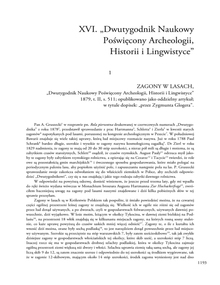 XVI. „Dwutygodnik Naukowy Poświęcony Archeologii, Historii i Lingwistyce” 1 ZAGONY W LASACH, „Dwutygodnik Naukowy Poświęcony Archeologii, Historii i Lingwistyce” 1879, t. II, s. 511; opublikowano jako oddzielny artykuł; w tytule dopisek: „przez Zygmunta Glogera”. Pan A. Gruszecki1 w rozprawie pn. Rola pierwotna drukowanej w czerwcowych numerach „Dwutygodnika” z roku 18782, przedstawił sprawozdanie z prac Hartmanna3, Schletta4 i Zierla5 w kwestii starych zagonów 6 napotykanych pod lasami, poruszonej na kongresie archeologicznym w Peszcie 7. W południowej Bawarii znajduje się wiele takiej uprawy, którą lud miejscowy rozmaicie nazywa. Już w roku 1788 Paul Schrank8 bardzo długie, szerokie i wysokie te zagony nazywa kosmologiczną zagadką9. Dr Zierl w roku 1829 nadmienia, że zagony te mają od 20 do 30 stóp szerokości, a nieraz pół mili są długie i mniema, że są zabytkiem czasów starożytnych, Schlett10 osądził, że czasów rzymskich. August Pauly11 odrzuca myśl jakoby te zagony były zabytkiem rzymskiego rolnictwa, a opierając się na Cezarze 12 i Tacycie 13 twierdzi, że role owe są pozostałością gmin marchijskich 14 i ówczesnego sposobu gospodarowania, które miało polegać na periodycznym paleniu lasu, aby popiołem użyźnić pole, i zapuszczaniu następnie pola na las. P. Gruszecki sprawozdanie swoje zakończa odwołaniem się do właścicieli ziemskich w Polsce, aby zechcieli odpowiedzieć „Dwutygodnikowi”, czy się u nas znajdują i jakie tego rodzaju zabytki dawnego rolnictwa. W odpowiedzi na powyższą odezwę, donieść winienem, że jeszcze przed trzema laty, gdy mi wpadła do ręki świeżo wydana wówczas w Monachium broszura Augusta Hartmanna Zur Hochackerfrage15, zwróciłem baczniejszą uwagę na zagony pod lasami naszymi znajdowane i dziś kilka pobieżnych słów w tej sprawie przesyłam. Zagony w lasach są w Królestwie Polskiem tak pospolite, iż śmiało powiedzieć można, że na czwartej części ogólnej przestrzeni leśnej zagony te znajdują się. Wielkość ich w ogóle nie różni się od zagonów przez lud dotąd używanych, a po dworach, czyli w gospodarstwach folwarcznych, używanych dawniej powszechnie, dziś wyjątkowo. W lesie moim, leżącym w okolicy Tykocina, w dawnej ziemi bielskiej na Podlasiu16, na przestrzeni 18 włók znajdują się w kilkunastu miejscach zagony, na których rosną sosny stuletnie, co każe uprawę powyższą do czasów saskich mniej więcej odnieść17. Zagony te, o ile z kształtu ich wnosić dziś można, orane były sochą podlaską18, to jest narzędziem dotąd powszechnie przez lud miejscowy używanym. Szerokie są przeciętnie na stóp warszawskich 7, były zatem sześcioskibowe 19, tak jak zwykłe dzisiejsze zagony w gospodarstwach włościańskich tej okolicy, które skib sześć, a szerokości stóp 7 liczą. Inaczej rzecz się ma w gospodarstwach drobnej szlachty podlaskiej, która w okolicy Tykocina zajmuje ogólną przestrzeń ziemi większą niż dwory i włości. Szlachta uprawia ziemię taką samą sochą, ale zagony jej liczą skib 9 do 12, są zatem znacznie szersze i odpowiednio do tej szerokości są środkiem wygórowane, tak że w zagonie 12-skibowym, mającym około 14 stóp szerokości, środek zagonu wyniesiony jest nad dno 1193 Zagony w las ach bruzdy niekiedy do dwóch stóp. Regularne ułożenie takiego zagonu wymaga umiejętnego oracza i sochy podlaskiej. Zagony takie, zwane półtorakami, miewają niekiedy w obszerniejszych wioskach do ćwierć mili długości, a 3 podobne zagony (w każdym polu po jednym) stanowią nieraz cały majątek zagonowego szlachcica. O ile z opisów widzimy, stare role bawarskie są najwięcej do tego rodzaju uprawy zbliżone. W lasach drobnej szlachty podlaskiej i mazowieckiej tak samo pospolite są zagony dotąd przez tę szlachtę uprawiane, jak w lasach dworskich zagony ważkie, właściwe rolnictwu kmieci i dworów. Ważna to wskazówka, bo dowodząca, że nasza uprawa leśna nie sięga zbyt odległych czasów, że dokonywało jej to samo uspołecznienie rolnicze, które dziś ziemię uprawia20, tylko dokonywało wiek, dwa lub trzy wieki temu. Najstarsi w okolicy ludzie, których w sprawie zagonów leśnych badałem, przechowali tradycję potwierdzającą moje domysły. Przed laty, powiadali oni, kiedy drzewo nie miało żadnej prawie wartości, ojcowie nasi wypalali kawały lasu i uprawiali w tym miejscu nowinę 21 pod zboże a zwłaszcza pod proso i owies, które znakomite wydają plony na świeżej ziemi. Często korzystano z pożaru przypadkowego, od ogniska pasterzy w suche lato powodowanego. Po kilkunastu leciech corocznej siejby22, gdy nowina wyjałowiała, zaprzestano ją uprawiać przenosząc się w inne miejsce, a wtedy zagony szybko zasiewały się lasem. Gdzie gleba była sama z siebie urodzajna, tam zostawała na zawsze pod panowaniem pługa, przydzielano ją do najbliższego folwarku lub zakładano na niej nowy folwark, słobodę23 czyli wólkę24, wieś, awuls25, osadę, leśniczówkę, futor26. Stąd zagony porosłe lasem najczęściej znajdują się tylko na ziemi lżejszej, która bez umierzwiania27 nie mogła rodzić zbyt długo. W dawniejszych zaś gospodarstwach umierzwiano tylko pola bliżej domu położone. W ogóle nie należy uważać tego rodzaju dawnego gospodarstwa za stan barbarzyński. Trzeba wiedzieć, że po lasach znajdowały się dawniej liczne piece potażowe28, w których z drzewa wypalano potaż i węgle kowalskie, wytapiano smołę, terpentynę29 i dziegieć30, produkty, mające dawniej obszerniejsze niż dziś zastosowanie. Był to jedyny sposób przemysłowego zużytkowania drzewa i lasu, który przemieniano następnie na pole. W wielu miejscach w lasach i na polach znajdowałem stare piece podobne dziś do mogił, porosłe nieraz drzewami, zawierające w sobie mnóstwo popiołu i przepalonej gliny, a dla nieświadomych poszukiwaczy mogące służyć za archeologiczną zagadkę. 