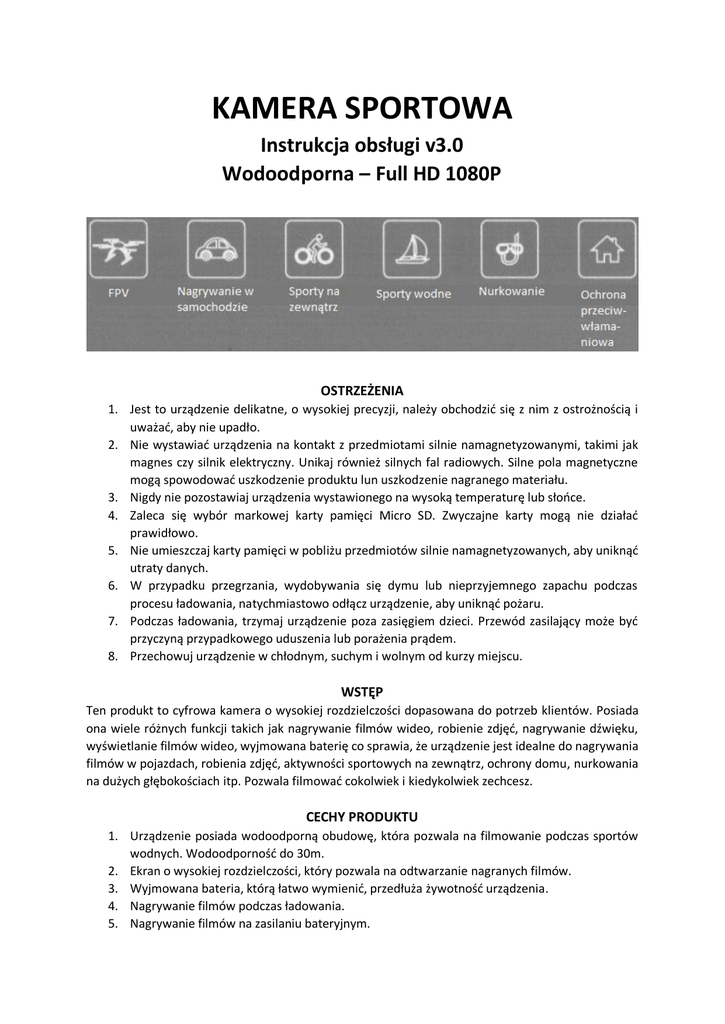 KAMERA SPORTOWA Instrukcja obsługi v3.0 Wodoodporna – Full HD 1080P OSTRZEŻENIA 1. Jest to urządzenie delikatne, o wysokiej precyzji, należy obchodzić się z nim z ostrożnością i uważać, aby nie upadło. 2. Nie wystawiać urządzenia na kontakt z przedmiotami silnie namagnetyzowanymi, takimi jak magnes czy silnik elektryczny. Unikaj również silnych fal radiowych. Silne pola magnetyczne mogą spowodować uszkodzenie produktu lun uszkodzenie nagranego materiału. 3. Nigdy nie pozostawiaj urządzenia wystawionego na wysoką temperaturę lub słońce. 4. Zaleca się wybór markowej karty pamięci Micro SD. Zwyczajne karty mogą nie działać prawidłowo. 5. Nie umieszczaj karty pamięci w pobliżu przedmiotów silnie namagnetyzowanych, aby uniknąć utraty danych. 6. W przypadku przegrzania, wydobywania się dymu lub nieprzyjemnego zapachu podczas procesu ładowania, natychmiastowo odłącz urządzenie, aby uniknąć pożaru. 7. Podczas ładowania, trzymaj urządzenie poza zasięgiem dzieci. Przewód zasilający może być przyczyną przypadkowego uduszenia lub porażenia prądem. 8. Przechowuj urządzenie w chłodnym, suchym i wolnym od kurzy miejscu. WSTĘP Ten produkt to cyfrowa kamera o wysokiej rozdzielczości dopasowana do potrzeb klientów. Posiada ona wiele różnych funkcji takich jak nagrywanie filmów wideo, robienie zdjęć, nagrywanie dźwięku, wyświetlanie filmów wideo, wyjmowana baterię co sprawia, że urządzenie jest idealne do nagrywania filmów w pojazdach, robienia zdjęć, aktywności sportowych na zewnątrz, ochrony domu, nurkowania na dużych głębokościach itp. Pozwala filmować cokolwiek i kiedykolwiek zechcesz. CECHY PRODUKTU 1. Urządzenie posiada wodoodporną obudowę, która pozwala na filmowanie podczas sportów wodnych. Wodoodporność do 30m. 2. Ekran o wysokiej rozdzielczości, który pozwala na odtwarzanie nagranych filmów. 3. Wyjmowana bateria, którą łatwo wymienić, przedłuża żywotność urządzenia. 4. Nagrywanie filmów podczas ładowania. 5. Nagrywanie filmów na zasilaniu bateryjnym. 6. 7. 8. 9. 10. 11. 12. Wyjście HDMI HD. Kamera internetowa. Obsługa kart pamięci do 32GB. Różnorodne formaty nagrywania: 1080P/720P/VGA. Nagrywanie w formacie AVI. Szyfrowanie filmów wideo. Mała konstrukcja, różne kolory do wyboru. SCHEMAT PRODUKTU SCHEMAT OBUDOWY WODOODPORNEJ SCHEMAT AKCESORIÓW PIERWSZE KROKI INSTALACJA KART PAMIECI MICRO SD Urządzenie jest kompatybilne z kartami o pojemności 8GB, 16GB oraz 32GB. Należy używać kart o klasie szybkości 10. Zalecamy używanie kart uznanych marek dla gwarancji niezawodności. INSTALACJA ORAZ WYJMOWANIE BATERII A. Przyciśnij pokrywę baterii, aby ją otworzyć. B. Poprawnie umieść baterię zgodnie z symbolami +/- oraz kierunkami zaznaczonymi na baterii. C. Wskaźnik baterii: sprawdź diagram. D. Wyjmowanie baterii: otwórz pokrywę, aby wyjąć baterię. ŁADOWANIE A. Ładowanie może odbywać się poprzez podłączenie urządzenia do komputera lub adaptera. B. Urządzenie można ładować w samochodzie poprzez podłączenie go do gniazda zapalniczki samochodowej. C. Podczas ładowania można nagrywać filmy. WŁĄCZANIE ZASILANIA Wciśnij i przytrzymaj przycisk Zasilanie/tryb przez 3-5 sekund, aby włączyć urządzenie. WYŁACZANIE ZASILANIA Wciśnij i przytrzymaj przycisk Zasilanie/tryb przez 3-5 sekund, aby wyłączyć urządzenie. PODŁĄCZANIE DO KOMPUTERA Podłącz urządzenie do komputera. Urządzenie jest wyposażone we wtyczkę. Możliwe jest odtwarzanie filmów na komputerze. Podłącz urządzenie do komputera za pomocą kabla USB. PODŁĄCZANIE DO TELEWIZORA Wciśnij i przytrzymaj przycisk Do góry przez 3-5 sekund. PRZEŁĄCZANIE TRYBÓW Włącz kamerę i kilkakrotnie wciśnij przycisk Zasilanie/tryb, aby przechodzić pomiędzy trybami i ustawieniami. Tryby pojawią się w następującej kolejności: TRYB WIDEO Aby rozpocząć nagrywanie, włącz tryb nagrywania wideo. Jeżeli na wyświetlaczu LCD nie pojawiła się ikona , wciśnij przycisk Zasilanie/tryb kilkakrotnie aż do momentu jej pojawienia się. Aby rozpocząć nagrywanie: Wciśnij przycisk OK, migać będzie ikona Aby zatrzymać nagrywanie: Wciśnij przycisk OK, ikona . przestanie migać. TRYB ZDJĘĆ Aby zrobić zdjęcie, włącz tryb zdjęć, Jeżeli na wyświetlaczu LCD nie pojawiła się ikona , wciśnij przycisk Zasilanie/tryb kilkakrotnie aż do momentu jej pojawienia się. Aby zrobić zdjęcie: Wciśnij przycisk OK. Kamera w momencie robienia zdjęcia wyda specyficzny dźwięk. ODTWARZANIE Aby odtworzyć filmy, zdjęcia, włącz tryb odtwarzania. Jeżeli na wyświetlaczu LCD nie pojawiła się ikona , wciśnij przycisk Zasilanie/tryb kilkakrotnie aż do momentu jej pojawienia się. Wciśnij przycisk Do góry lub Do dołu, aby wybrać film lub zdjęcie, następnie wciśnij przycisk OK, aby odtworzyć. USTAWIENIA Dopasuj ustawienia kamery, rozdzielczości i inne. Jeśli na wyświetlaczu LCD nie pojawiła się ikona , wciśnij przycisk Zasilanie/tryb kilkakrotnie aż do momentu jej pojawienia się.