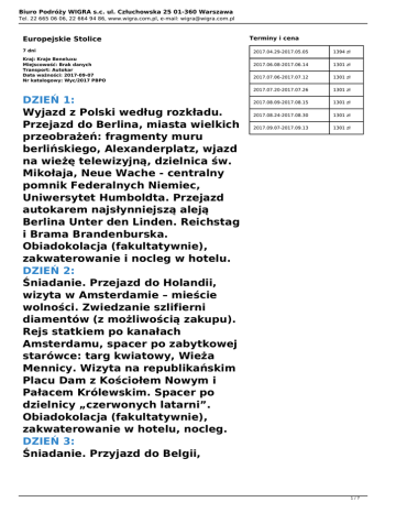 Biuro Podróży WIGRA s.c. ul. Człuchowska 25 01-360 Warszawa Tel. 22 665 06 06, 22 664 94 86, www.wigra.com.pl, e-mail: [email protected] Europejskie Stolice 7 dni Kraj: Kraje Beneluxu Miejscowość: Brak danych Transport: Autokar Data ważności: 2017-09-07 Nr katalogowy: Wyc/2017 PBPO DZIEŃ 1: Wyjazd z Polski według rozkładu. Przejazd do Berlina, miasta wielkich przeobrażeń: fragmenty muru berlińskiego, Alexanderplatz, wjazd na wieżę telewizyjną, dzielnica św. Mikołaja, Neue Wache - centralny pomnik Federalnych Niemiec, Uniwersytet Humboldta. Przejazd autokarem najsłynniejszą aleją Berlina Unter den Linden. Reichstag i Brama Brandenburska. Obiadokolacja (fakultatywnie), zakwaterowanie i nocleg w hotelu. DZIEŃ 2: Śniadanie. Przejazd do Holandii, wizyta w Amsterdamie – mieście wolności. Zwiedzanie szlifierni diamentów (z możliwością zakupu). Rejs statkiem po kanałach Amsterdamu, spacer po zabytkowej starówce: targ kwiatowy, Wieża Mennicy. Wizyta na republikańskim Placu Dam z Kościołem Nowym i Pałacem Królewskim. Spacer po dzielnicy „czerwonych latarni”. Obiadokolacja (fakultatywnie), zakwaterowanie w hotelu, nocleg. DZIEŃ 3: Śniadanie. Przyjazd do Belgii, Terminy i cena 2017.04.29-2017.05.05 1394 zł 2017.06.08-2017.06.14 1301 zł 2017.07.06-2017.07.12 1301 zł 2017.07.20-2017.07.26 1301 zł 2017.08.09-2017.08.15 1301 zł 2017.08.24-2017.08.30 1301 zł 2017.09.07-2017.09.13 1301 zł 1/7 Biuro Podróży WIGRA s.c. ul. Człuchowska 25 01-360 Warszawa Tel. 22 665 06 06, 22 664 94 86, www.wigra.com.pl, e-mail: [email protected] zwiedzanie Brukseli – stolicy Europy. Wjazd na Atomium, olbrzymią konstrukcję modelu sieci krystalicznej żelaza, którą zbudowano w 1958 roku z okazji Światowej Wystawy Expo.Przejazd do Dzielnicy Europejskiej, Park 50lecia z Łukiem Triumfalnym, rondo Roberta Schumana z Komisją Europejską i Radą Europy, Parlament Europejski. Wizyta w Górnym Mieście z Pałacem Królewskim, kościołem św. Jakuba, Pałacem Sprawiedliwości, Notre Dame du Sablon. Zwiedzanie Królewskiego Muzeum Sztuki Dawnej z bezcennymi zbiorami malarstwa flamandzkiego, m.in. dzieła Rubensa, van Dyka, Halsa, Rembrandta, Piotra Bruegla starszego. Spacer po najpiękniejszym rynku Europy Grand Place: ratusz, Dom Królewski, Manneken Pis symbol beztroskiego ducha Brukseli. Obiadokolacja (fakultatywnie). Zakwaterowanie, nocleg w hotelu. DZIEŃ 4: Śniadanie. Przejazd do Francji. Wizyta w Paryżu - mieście miłości. Objazd miasta autokarem: Place Vendome, Place de la Concorde, Pola Elizejskie, Plac de Gaulle’a z Łukiem Triumfalnym, Most Aleksandra III. Wjazd na wieżę Eiffla. Pola Marsowe. Rejs statkiem 2/7 Biuro Podróży WIGRA s.c. ul. Człuchowska 25 01-360 Warszawa Tel. 22 665 06 06, 22 664 94 86, www.wigra.com.pl, e-mail: [email protected] po Sekwanie. Obiadokolacja (fakultatywnie), zakwaterowanie w hotelu, nocleg. DZIEŃ 5: Śniadanie. Zwiedzanie zbiorów Muzeum Luwru – największego muzeum świata. Hôtel des Invalides z grobowcem Napoleona Bonaparte. Awangardowe Centrum Pompidou. Spacer na wyspę Cité z katedrą Notre Dame, Pałacem Sprawiedliwości, Świętą Kaplicą i najstarszym paryskim mostem Pont Neuf. Następnie Dzielnica Łacińska: Sorbona, Panteon z grobem m. in. Marii Skłodowskiej – Curie; Ogród Luksemburski. Wieczorem spacer po wzgórzu Montmartre: Bazylika Sacre Coeur, Place du Tertre, Place Pigalle, kabaret Moulin Rouge. Obiadokolacja (fakultatywnie). Powrót do hotelu, nocleg. DZIEŃ 6: Śniadanie. Wyjazd do Luxemburga – zielonego serca Europy, zwiedzanie miasta: Plac Konstytucji, katedra Notre Dame, dzielnica Grund, kościół św. Michała, przełom rzeki Alzette, spacer uliczką de la Corniche czyli "najpiękniejszym balkonem Europy” będącej fragmentem dawnej cytadeli. Wizyta na Placu Guillaume II, ratusz, Pałac Wielkiego Księcia, Izba Deputowanych. Bulwar 3/7 Biuro Podróży WIGRA s.c. ul. Człuchowska 25 01-360 Warszawa Tel. 22 665 06 06, 22 664 94 86, www.wigra.com.pl, e-mail: [email protected] Królewski – finansowe centrum Luksemburga. Plac Armii z licznych restauracjami i kawiarniami. Przejazd przez dzielnicę europejską: Sekretariat Generalny Parlamentu Europejskiego, Europejski Fundusz Monetarny, Europejski Bank Inwestycyjny, wyjazd do Polski. DZIEŃ 7: Przyjazd do kraju, powrót do poszczególnych miejscowości. Program imprezy jest ramowy. Kolejność zwiedzania może ulec zmianie. ZAREZERWUJ JUŻ DZIŚ, TEL. 22 665 06 06, 22 664 94 86 DOPŁATY OPCJONALNE: Dopłata do 5 obiadokolacji: 350zł Dopłata do pokoju 1-osobowego: 460 zł CENA IMPREZY OBEJMUJE: - przejazd autokarem (klimatyzacja, dvd, barek, wc) - 5 noclegów w hotelach**/*** w pokojach 2 - os. z łazienką - 5 śniadań - program turystyczny - opiekę pilota - ubezpieczenie Signal Iduna (KL 10.000 EUR, NNW 15.000 PLN, bagaż 1.000 PLN) 4/7 Biuro Podróży WIGRA s.c. ul. Człuchowska 25 01-360 Warszawa Tel. 22 665 06 06, 22 664 94 86, www.wigra.com.pl, e-mail: [email protected] DODATKOWO PŁATNE: Pakiet do realizacji programu: 130 EUR (rezerwacje i wstepy do zwiedzanych obiektów, usługi przewodnickie, wjazd na wieżę Eiffla, rejsy statkiem po kanałach w Amsterdamie oraz po Sekwanie w Paryżu, bilety komunikacji miejskiej, zestaw słuchawkowy Tour Guide) płatny obligatoryjnie pilotowi wycieczki. WAŻNE INFORMACJE: 1.Wycieczki będą realizowane w zależności od ilości uczestników w grupie: wygodnymi autokarami lub wygodnymi busami. 2.Niektóre połączenia krajowe mogą być realizowane innymi środkami transportu niż autokar (bus, samochód osobowy, autokar liniowy, pociąg). Trasy antenowe obsługiwane są bez pilota. 3.Wyjazd *antenkowy za dopłatą z wybranego miasta organizowany przy minimum 6 os. wsiadających. W przypadku braku wymaganego min. 6 osób PBP OLSZTYN ma prawo anulować wyjazd z danej miejscowości. Anulacja wyjazdu nie upoważnia do bezkosztowej rezygnacji z wycieczki. W takim przypadku Klient wybiera wyjazd z