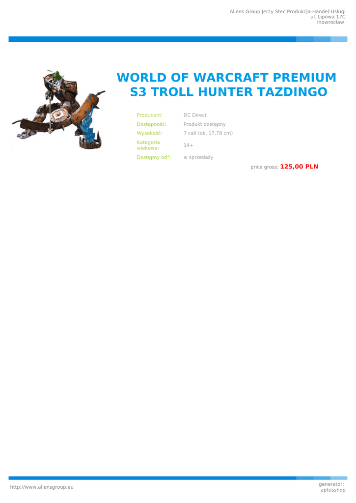 Aliens Group Jerzy Stec Produkcja-Handel-Usługi ul. Lipowa 17C Inowrocław WORLD OF WARCRAFT PREMIUM S3 TROLL HUNTER TAZDINGO Producent: DC Direct Dostępność: Produkt dostępny Wysokość: 7 cali (ok. 17,78 cm) Kategoria wiekowa: 14+ Dostępny od*: w sprzedaży price gross: http://www.aliensgroup.eu 125,00 PLN generator: aptusshop