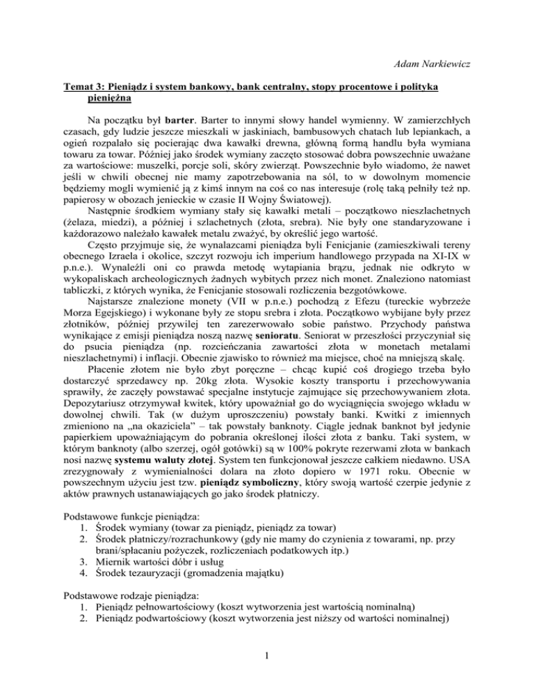 Adam Narkiewicz Temat 3: Pieniądz i system bankowy, bank centralny, stopy procentowe i polityka pienięŜna Na początku był barter. Barter to innymi słowy handel wymienny. W zamierzchłych czasach, gdy ludzie jeszcze mieszkali w jaskiniach, bambusowych chatach lub lepiankach, a ogień rozpalało się pocierając dwa kawałki drewna, główną formą handlu była wymiana towaru za towar. Później jako środek wymiany zaczęto stosować dobra powszechnie uwaŜane za wartościowe: muszelki, porcje soli, skóry zwierząt. Powszechnie było wiadomo, Ŝe nawet jeśli w chwili obecnej nie mamy zapotrzebowania na sól, to w dowolnym momencie będziemy mogli wymienić ją z kimś innym na coś co nas interesuje (rolę taką pełniły teŜ np. papierosy w obozach jenieckie w czasie II Wojny Światowej). Następnie środkiem wymiany stały się kawałki metali – początkowo nieszlachetnych (Ŝelaza, miedzi), a później i szlachetnych (złota, srebra). Nie były one standaryzowane i kaŜdorazowo naleŜało kawałek metalu zwaŜyć, by określić jego wartość. Często przyjmuje się, Ŝe wynalazcami pieniądza byli Fenicjanie (zamieszkiwali tereny obecnego Izraela i okolice, szczyt rozwoju ich imperium handlowego przypada na XI-IX w p.n.e.). Wynaleźli oni co prawda metodę wytapiania brązu, jednak nie odkryto w wykopaliskach archeologicznych Ŝadnych wybitych przez nich monet. Znaleziono natomiast tabliczki, z których wynika, Ŝe Fenicjanie stosowali rozliczenia bezgotówkowe. Najstarsze znalezione monety (VII w p.n.e.) pochodzą z Efezu (tureckie wybrzeŜe Morza Egejskiego) i wykonane były ze stopu srebra i złota. Początkowo wybijane były przez złotników, później przywilej ten zarezerwowało sobie państwo. Przychody państwa wynikające z emisji pieniądza noszą nazwę senioratu. Seniorat w przeszłości przyczyniał się do psucia pieniądza (np. rozcieńczania zawartości złota w monetach metalami nieszlachetnymi) i inflacji. Obecnie zjawisko to równieŜ ma miejsce, choć na mniejszą skalę. Płacenie złotem nie było zbyt poręczne – chcąc kupić coś drogiego trzeba było dostarczyć sprzedawcy np. 20kg złota. Wysokie koszty transportu i przechowywania sprawiły, Ŝe zaczęły powstawać specjalne instytucje zajmujące się przechowywaniem złota. Depozytariusz otrzymywał kwitek, który upowaŜniał go do wyciągnięcia swojego wkładu w dowolnej chwili. Tak (w duŜym uproszczeniu) powstały banki. Kwitki z imiennych zmieniono na „na okaziciela” – tak powstały banknoty. Ciągle jednak banknot był jedynie papierkiem upowaŜniającym do pobrania określonej ilości złota z banku. Taki system, w którym banknoty (albo szerzej, ogół gotówki) są w 100% pokryte rezerwami złota w bankach nosi nazwę systemu waluty złotej. System ten funkcjonował jeszcze całkiem niedawno. USA zrezygnowały z wymienialności dolara na złoto dopiero w 1971 roku. Obecnie w powszechnym uŜyciu jest tzw. pieniądz symboliczny, który swoją wartość czerpie jedynie z aktów prawnych ustanawiających go jako środek płatniczy. Podstawowe funkcje pieniądza: 1. Środek wymiany (towar za pieniądz, pieniądz za towar) 2. Środek płatniczy/rozrachunkowy (gdy nie mamy do czynienia z towarami, np. przy brani/spłacaniu poŜyczek, rozliczeniach podatkowych itp.) 3. Miernik wartości dóbr i usług 4. Środek tezauryzacji (gromadzenia majątku) Podstawowe rodzaje pieniądza: 1. Pieniądz pełnowartościowy (koszt wytworzenia jest wartością nominalną) 2. Pieniądz podwartościowy (koszt wytworzenia jest niŜszy od wartości nominalnej) 1 3. Pieniądz kruszcowy (nie musi być pełnowartościowy) 4. Pieniądz towarowy (papierosy) 5. Pieniądz symboliczny (banknoty, pieniądz bezgotówkowy, elektroniczny itp.) 6. Pieniądz gotówkowy (banknoty, monety) 7. Pieniądz bezgotówkowy (zawartość naszych kont) PowyŜsze kategorie nawzajem się przenikają, np. pieniądz symboliczny jest zazwyczaj teŜ pieniądzem podwartościowym, z kolei towarowy jest zazwyczaj pełnowartościowy, zaś kruszcowy moŜe być zarówno pełnowartościowy jak i podwartościowy oraz symboliczny. PoŜądane cechy pieniądza: 1. Poręczność (lekki, mieści się w portfelu) 2. Stabilność (jego wartość jest w miarę stała w czasie) 3. Jednolitość (nie musisz mi oddać dokładnie tego samego banknotu, który Ci dałem, moŜesz dać mi inny o tym samym nominale) 4. Trwałość (nie niszczy się łatwo) 5. Podzielność (Ŝeby moŜna było zapłacić zarówno małe kwoty jak i duŜe kwoty) 6. Rozpoznawalność (łatwo odróŜnić to co jest pieniądzem od tego co nie jest – utrudnione fałszowanie itp.) 7. Akceptowalność (kaŜdy jest przekonany o wartości pieniądza i nie boi się go przyjąć) PodaŜ pieniądza to całkowita wartość znajdujących się w obiegu zasobów pieniądza występującego w roli środka wymiany. Płynność jest to inaczej taniość, szybkość i pewność, z jaką dana pozycja aktywów moŜe być z powrotem zamieniona na gotówkę w dowolnym momencie. Gotówka jest więc z definicji maksymalnie płynna. Pośrednik finansowy jest to instytucja zajmująca się ułatwianiem kontaktu między kredytobiorcami i kredytodawcami. Agregaty pienięŜne: Agregat Wg podręcznika (UK) M0 Gotówka: w obiegu, w bankach i gotówkowe rezerwy banków w banku centralnym. M1 M0 – rezerwy gotówkowe banków + wkłady na Ŝądanie. M2 Gotówka w obiegu, detaliczne wkłady na Ŝądanie, wkłady detaliczne i udziały w towarzystwach budowlanych. M3 Gotówka w obiegu, całość wkładów na Ŝądanie, wkłady terminowe i certyfikaty depozytowe sektora pozabankowego w bankach. M4 Gotówka w obiegu, całość wkładów na Ŝądanie, wkłady terminowe i certyfikaty depozytowe sektora pozabankowego w bankach i w towarzystwach budowlanych. 2 Polska (wg NBP) Gotówka: w obiegu, w bankach i gotówkowe rezerwy banków w banku centralnym. M0 – rezerwy gotówkowe banków + wkłady na Ŝądanie. M1 + wkła