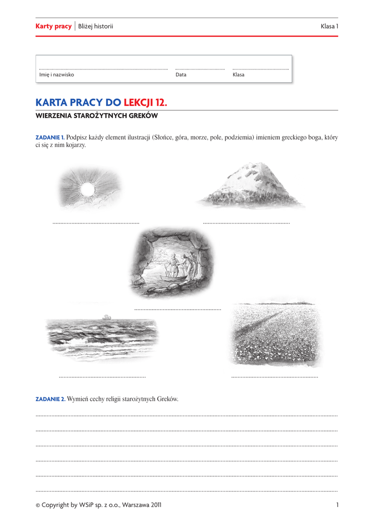 Karty pracy | Bliżej historii Klasa 1 Imię i nazwisko Data Klasa KARTA PRACY DO LEKCJI 12. WIERZENIA STAROŻYTNYCH GREKÓW ZADANIE 1. Podpisz każdy element ilustracji (Słońce, góra, morze, pole, podziemia) imieniem greckiego boga, który ci się z nim kojarzy. ....................................................... ....................................................... ....................................................... ....................................................... ....................................................... ZADANIE 2. Wymień cechy religii starożytnych Greków. ............................................................................................................................................................................................... ............................................................................................................................................................................................... ............................................................................................................................................................................................... ............................................................................................................................................................................................... ............................................................................................................................................................................................... ............................................................................................................................................................................................... © Copyright by WSiP sp. z o.o., Warszawa 2011 1