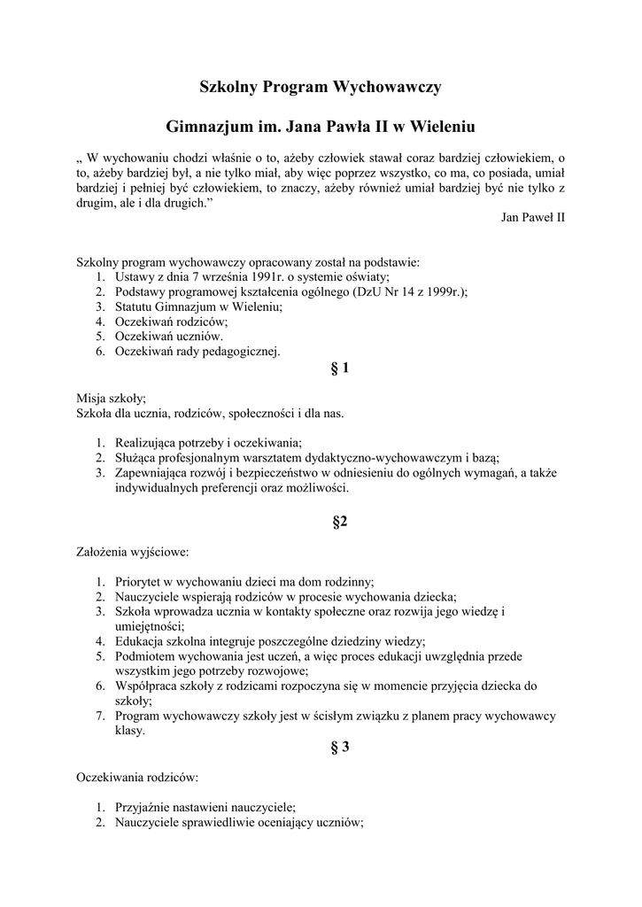 Szkolny Program Wychowawczy Gimnazjum im. Jana Pawła II w Wieleniu „ W wychowaniu chodzi właśnie o to, ażeby człowiek stawał coraz bardziej człowiekiem, o to, ażeby bardziej był, a nie tylko miał, aby więc poprzez wszystko, co ma, co posiada, umiał bardziej i pełniej być człowiekiem, to znaczy, ażeby również umiał bardziej być nie tylko z drugim, ale i dla drugich.” Jan Paweł II Szkolny program wychowawczy opracowany został na podstawie: 1. Ustawy z dnia 7 września 1991r. o systemie oświaty; 2. Podstawy programowej kształcenia ogólnego (DzU Nr 14 z 1999r.); 3. Statutu Gimnazjum w Wieleniu; 4. Oczekiwań rodziców; 5. Oczekiwań uczniów. 6. Oczekiwań rady pedagogicznej. §1 Misja szkoły; Szkoła dla ucznia, rodziców, społeczności i dla nas. 1. Realizująca potrzeby i oczekiwania; 2. Służąca profesjonalnym warsztatem dydaktyczno-wychowawczym i bazą; 3. Zapewniająca rozwój i bezpieczeństwo w odniesieniu do ogólnych wymagań, a także indywidualnych preferencji oraz możliwości. §2 Założenia wyjściowe: 1. Priorytet w wychowaniu dzieci ma dom rodzinny; 2. Nauczyciele wspierają rodziców w procesie wychowania dziecka; 3. Szkoła wprowadza ucznia w kontakty społeczne oraz rozwija jego wiedzę i umiejętności; 4. Edukacja szkolna integruje poszczególne dziedziny wiedzy; 5. Podmiotem wychowania jest uczeń, a więc proces edukacji uwzględnia przede wszystkim jego potrzeby rozwojowe; 6. Współpraca szkoły z rodzicami rozpoczyna się w momencie przyjęcia dziecka do szkoły; 7. Program wychowawczy szkoły jest w ścisłym związku z planem pracy wychowawcy klasy. §3 Oczekiwania rodziców: 1. Przyjaźnie nastawieni nauczyciele; 2. Nauczyciele sprawiedliwie oceniający uczniów; 3. 4. 5. 6. 7. 8. Wysokie kwalifikacje nauczycieli; Wysoki poziom nauczania (dobrze zorganizowana praca po lekcjach0 Demokracja; Pomoc pedagoga; Prawo do wolności słowa i wyglądu; Miła atmosfera. §4 Oczekiwania nauczycieli: 1. Współpraca z rodzicami: konsekwencja w wychowaniu (przestrzeganie dyscypliny), „zero” tolerancji dla wulgaryzmów, wagarów, używek wśród uczniów, systematyczne uczestniczenie rodziców w zebraniach szkolnych, 2. Jednolity sposób postępowania nauczyciele z uczniami. §5 Uczniowie naszej szkoły to młodzież w okresie dojrzewania, wychowująca się w bardzo różnych warunkach środowiskowych i materialnych. Od bardzo dobrych, zapewniających zaspokojenie wszystkich potrzeb, do nie spełniających minimum potrzeb dziecka. Do potrzeb tych należą: 1. potrzeba bezpieczeństwa fizycznego, 2. potrzeba bezpieczeństwa psychicznego, 3. potrzeba kontaktu i akceptacji, 4. potrzeba aktywności poznawczej i konstruktywnej. §6 Ze względu na bardzo różny stopień zaspokojenia potrzeb dziecka przez środowisko rodzinne, a także ze względu na oczekiwania rodziców i uczniów, praca wychowawcza w naszej szkole będzie obejmowała cztery nurty tego procesu: 1. wspomaganie i zaspokajanie potrzeb rozwojowych, 2. kształcenie pożądanych cech i wartości uniwersalnych, 3. zapobieganie zagrożeniom, czyli profilaktykę, 4. korygowanie deficytów rozwojowych i zaniedbań wychowawczych. §7 Cykliczność oddziaływań: realizacja działań wychowawczych podzielona została na trzy cykle, obejmują one kolejne lata nauki w szkole, cykl obejmuje wszystkich uczniów, którzy na każdym etapie kształcenia przechodzą poszczególne fazy. Przestrzegana jest zasada „od tego, co najbliższe...” Cel wychowawczy: Wychowanie dziecka świadomego swoich możliwości fizycznych i intelektualnych, gotowego do dokonywania wyborów, kreatywnego, zmierzającego do sukcesu szkolnego. CYKL I PRACA NAD SOBĄ I RELACJE Z INNYMI Jaki jesteś? Jak radzić sobie ze stresem? Myślenie twórcze, Zachowania asertywne, Wewnętrzna motywacja do działania, Rozumienie istoty konfliktu. CYKL II MOJE MIEJSCE W REGIONIE Więź z naszą Ojczyzną, Tradycje, historie najbliższej okolicy, Poznawanie osób znaczących w regionie, ekologia, Współpraca z sąsiadującymi szkołami. CYKL III MOJE MIEJSCE W ŚWIECIE Wybór szkoły, Diagnoza własnych możliwości i potrzeb, Doskonalenie siebie i wpływ mojego działania na otoczenie. Cel ten realizuje się poprzez przywiązanie do takich postaw jak: 1. Szacunek dla drugiego człowieka i wrażliwość na jego potrzeby, 2. Dbałość o własny rozwój fizyczny, kulturalny i osobowościowy, 3. Odpowiedzialność za swoje postępowanie, 4. Szacunek dla pracy, 5. Umiejętność komunikowania się z innymi, 6. Dbałość o dobre imię szkoły, 7. Patriotyzm i przywiązanie do tradycji lokalnych. Formy realizacji: Godziny do dyspozycji wychowawcy klasy, Scenariusze ćwiczeń grupowych z programu „Jak żyć z ludźmi...”, Plenerowe zajęcia integracyjne, Festyny edukacyjno-wychowawcze, Zajęcia pozalekcyjne (koła zainteresowań), Rajdy, biwaki, wycieczki klasowe i szkolne, Świetlica środowiskowa, Edukacja kulturalna (wyjazdy do kina, teatru, opery, muzeum), Sport, formy aktywnego wypoczynku (udział w zawodach, organizowanie rozgrywek, meczy, rywalizacji sprawnościowych), Ścieżki międzyprzedmiotowe, Warsztaty dla uczniów i rodziców. Wszystkie mają charakter cykliczny. §8 Realizatorzy programu: Wychowawcy klas, Przeszkoleni realizatorzy programów profilaktycznych, Nauczyciele – autorzy programów, organizatorzy imprez wychowawczych, Pedagog szkolny. §9 Współrealizatorzy programu (określeni przepisami prawa oświatowego): Specjaliści poradni psychologiczno-pedagogicznych i innych poradni specjalistycznych, Osoby wyznaczone do realizacji poszczególnych zadań, Instytucje i stowarzyszenia. § 10 Źródła finansowania realizacji programu – zakup materiałów: Komisja do Spraw Przeciwdziałania Problemom Alkoholowym, Budżet szkoły, Środki Rady Rodziców, Sponsoring.