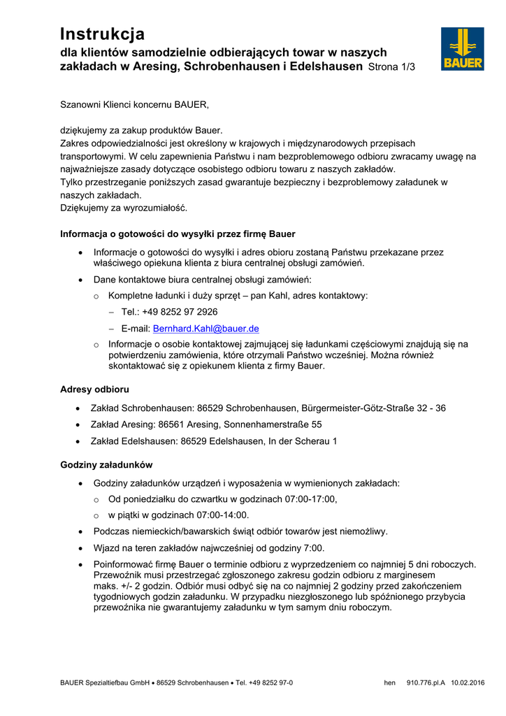 Instrukcja dla klientów samodzielnie odbierających towar w naszych zakładach w Aresing, Schrobenhausen i Edelshausen Strona 1/3 Szanowni Klienci koncernu BAUER, dziękujemy za zakup produktów Bauer. Zakres odpowiedzialności jest określony w krajowych i międzynarodowych przepisach transportowymi. W celu zapewnienia Państwu i nam bezproblemowego odbioru zwracamy uwagę na najważniejsze zasady dotyczące osobistego odbioru towaru z naszych zakładów. Tylko przestrzeganie poniższych zasad gwarantuje bezpieczny i bezproblemowy załadunek w naszych zakładach. Dziękujemy za wyrozumiałość. Informacja o gotowości do wysyłki przez firmę Bauer Informacje o gotowości do wysyłki i adres obioru zostaną Państwu przekazane przez właściwego opiekuna klienta z biura centralnej obsługi zamówień. Dane kontaktowe biura centralnej obsługi zamówień: o Kompletne ładunki i duży sprzęt – pan Kahl, adres kontaktowy: Tel.: +49 8252 97 2926 E-mail: [email protected] o Informacje o osobie kontaktowej zajmującej się ładunkami częściowymi znajdują się na potwierdzeniu zamówienia, które otrzymali Państwo wcześniej. Można również skontaktować się z opiekunem klienta z firmy Bauer. Adresy odbioru Zakład Schrobenhausen: 86529 Schrobenhausen, Bürgermeister-Götz-Straße 32 - 36 Zakład Aresing: 86561 Aresing, Sonnenhamerstraße 55 Zakład Edelshausen: 86529 Edelshausen, In der Scherau 1 Godziny załadunków Godziny załadunków urządzeń i wyposażenia w wymienionych zakładach: o Od poniedziałku do czwartku w godzinach 07:00-17:00, o w piątki w godzinach 07:00-14:00. Podczas niemieckich/bawarskich świąt odbiór towarów jest niemożliwy. Wjazd na teren zakładów najwcześniej od godziny 7:00. Poinformować firmę Bauer o terminie odbioru z wyprzedzeniem co najmniej 5 dni roboczych. Przewoźnik musi przestrzegać zgłoszonego zakresu godzin odbioru z marginesem maks. +/- 2 godzin. Odbiór musi odbyć się na co najmniej 2 godziny przed zakończeniem tygodniowych godzin załadunku. W przypadku niezgłoszonego lub spóźnionego przybycia przewoźnika nie gwarantujemy załadunku w tym samym dniu roboczym. BAUER Spezialtiefbau GmbH 86529 Schrobenhausen Tel. +49 8252 97-0 hen 910.776.pl.A 10.02.2016 Instrukcja dla klientów samodzielnie odbierających towar w naszych zakładach w Aresing, Schrobenhausen i Edelshausen Strona 2/3 Odbiór osobisty transportem powietrznym Zgodnie z europejskimi i krajowymi przepisami w sprawie bezpieczeństwa transportu powietrznego VO(EU) nr 185/2010 i LuftSiG z dnia 11.01.2005 ładunki przeznaczone do transportu powietrznego są wydawane wyłącznie z oznaczeniem NIEBEZPIECZNE. Może to spowodować opóźnienia i dodatkowe koszty transportu. Pełnomocnictwa do odbioru Warunkiem wydania lub przekazania towaru przewoźnikowi odbierającemu towar jest okazanie pełnomocnictwa do odbioru całkowicie wypełnionego i podpisanego przez odbiorcę towaru najpóźniej w momencie odbioru. Wyposażenie techniczne pojazdów Pojazdy muszą znajdować się w nienagannym stanie technicznym, spełniać wymogi przepisów ustawowych i posiadać wymagane wyposażenie techniczne niezbędne do zabezpieczenia towaru (np. wystarczająca liczba zaczepów do pasów, kłonice, dopuszczalne obciążenia osi, ...). Pojazdy wymagające zezwolenia, czyli pojazdy o wymiarach większych niż 16,5 m długości, 2,55 m szerokości i 4,0 m wysokości lub o łącznym ciężarze przekraczającym 41,8 t razem z ładunkiem, mają obowiązek uzyskania zezwolenia wyjątkowego zgodnie z § 29 StVO ust. 3, § 46 ust. 1 nr 2 i nr 5 oraz § 70 StVZO. W przypadku pojazdów o łącznym ciężarze przekraczającym 100 t osoba odbierająca towar musi samodzielnie zadbać o to, aby pojazd został dodatkowo skontrolowany i zatwierdzony przez bawarski oddział TÜV (Technischer Überwachungsverein, Stowarzyszenie Nadzoru Technicznego). Przed rozpoczęciem załadunku firma Bauer jako załadowca ma ustawowy obowiązek sprawdzenia prawidłowości i kompletności wymaganych zezwoleń na transport ciężki. Załadunek nie odbędzie się bez ważnego zezwolenia. Ładunek musi zostać załadowany i zabezpieczony przez kierowcę zgodnie z przepisami ustawowymi. W razie potrzeby kierowca musi poprawić zabezpieczenie zgodnie ze wskazaniem pracownika firmy Bauer kierującego załadunkiem. Pojazdy z niedostatecznie zabezpieczonym ładunkiem nie mogą opuścić terenu zakładu. Ładunek załadować w taki sposób, aby w normalnych warunkach nie mógł ulec uszkodzeniu i aby nie stanowił zagrożenia dla osób trzecich. Zwrócić zwłaszcza uwagę na to, aby ładunek nie mógł się ześlizgnąć, stoczyć, przewrócić, spaść ani spowodować przewrócenia całego pojazdu. Kierowca musi posiadać wymagane materiały do zabezpieczenia ładunku w wystarczającej ilości i znajdujące się w nienagannym stanie technicznym, a w szczególności o maty antypoślizgowe, o pasy zabezpieczające, o łańcuchy, o ochraniacze krawędzi. W razie podstawienia nieodpowiednich pojazdów, braku materiałów do zabezpieczenia ładunku lub odpowiednich zezwoleń Bauer ma obowiązek zaniechać załadunku pojazdów ze względu na przepisy ustawowe. BAUER Spezialtiefbau GmbH 86529 Schrobenhausen Tel. +49 8252 97-0 hen 910.776.pl.A 10.02.2016 Instrukcja dla klientów samodzielnie odbierających towar w naszych zakładach w Aresing, Schrobenhausen i Edelshausen Strona 3/3 Zasady zachowania na terenie zakładów firmy BAUER Kierowca musi zameldować się u portiera przy wjeździe i wyjeździe. Pojazdy mogą stać lub parkować tylko w wyznaczonych miejscach. Kierowcy nie wolno poruszać się samodzielnie na terenie zakładu. Kierowca może przebywać wyłącznie w samochodzie/przy samochodzie. Przestrzegać znaków nakazu, zakazu i znaków ostrzegawczych. Na terenie zakładu obowiązują przepisy kodeksu drogowego! Osoby odwiedzające muszą nosić kaski ochronne na terenie całego zakładu! W trakcie załadunku i rozładunk