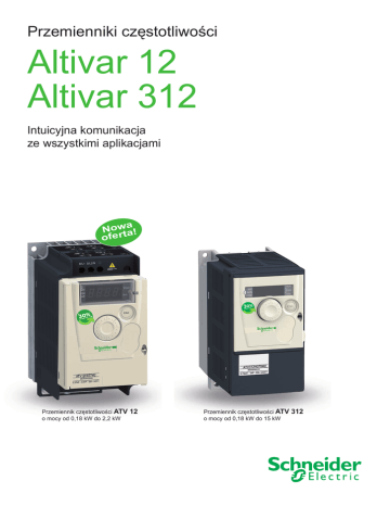Przemienniki częstotliwości Altivar 12 Altivar 312 Intuicyjna komunikacja ze wszystkimi aplikacjami a Nowta! ofer Przemiennik częstotliwości ATV o mocy od 0,18 kW do 2,2 kW 12 Przemiennik częstotliwości ATV o mocy od 0,18 kW do 15 kW 312 Spis treści Przemienniki częstotliwości Altivar 12 b Przegląd oferty . . . . . . . . . . . . . . . . . . . . . . . . . . . . . . . . . . . . . . . . . . . . . strona 4 b Prezentacja . . . . . . . . . . . . . . . . . . . . . . . . . . . . . . . . . . . . . . . . . . . . . . . strona 6 b Charakterystyki . . . . . . . . . . . . . . . . . . . . . . . . . . . . . . . . . . . . . . . . . . . . . strona 8 b Referencje . . . . . . . . . . . . . . . . . . . . . . . . . . . . . . . . . . . . . . . . . . . . . . . strona 12 b Wymiary i zalecenia montażowe . . . . . . . . . . . . . . . . . . . . . . . . . . . . . . strona 16 b Schematy . . . . . . . . . . . . . . . . . . . . . . . . . . . . . . . . . . . . . . . . . . . . . . . . strona 20 b Połączenia do samodzielnego montażu . . . . . . . . . . . . . . . . . . . . . . . . . strona 22 b Funkcje . . . . . . . . . . . . . . . . . . . . . . . . . . . . . . . . . . . . . . . . . . . . . . . . . . strona 24 Altivar 12 Strony 3 do 35 Altivar 312 Strony 36 do 105 Przemienniki częstotliwości dla silników asynchronicznych i synchronicznych Przegląd oferty Typ maszyny Maszyny proste Zakres mocy dla 50…60 Hz (kW) zasilania sieciowego Jednofazowe 100…120 V (kW) Jednofazowe 200…240 V (kW) Trzyfazowe 200…230 V (kW) Trzyfazowe 200…240 V (kW) Trzyfazowe 380…480 V (kW) Trzyfazowe 380…500 V (kW) Trzyfazowe 525…600 V (kW) Trzyfazowe 500…690 V (kW) 0.18…4 0.18…0.75 0.18…2.2 – 0.18…4 – – – – 0.18…15 – 0.18…2.2 – 0.18…15 – 0.37…15 0.75…15 – 0.75…75 – – – 0.75…30 0.75…75 – – – Napęd Częstotliwość wyjściowa 0.5…400 Hz 0.5…500 Hz 0.5…200 Hz Typ kontroli Standardowy (napięciowo/ częstotliwościowy) Zaawansowany (kontrola wektorowa) Pompy/wentylatory (Kn2 charakterystyka kwadratowa) – 150…170% momentu znamionowego silnika Standardowy (napięciowo/ częstotliwościowy) Zaawansowany (kontrola wektorowa) Kontrola wektorowa, napięciowo/ częstotliwościowa (2 punktowa), oszczędność energii 170…200% momentu znamionowego silnika 110% momentu znamionowego silnika 40 8 1 4 1 1 1 50 16 3 6 1 – 2 50 7 2 3 1 – 2 Modbus – Modbus i CANopen Ethernet TCP/IP, Device Net, Fipio, Profibus DP Modbus LonWorks, METASYS N2, APOGEE FLN, BACnet Silnik asynchroniczny Silnik synchroniczny Moment przejściowy Funkcje Ilość funkcji Ilość prędkości zadanych Ilość we/Wy Wejścia analogowe Wejścia cyfrowe Wyjścia analogowe Wyjścia cyfrowe Wyjścia przekaźnikowe Komunikacja Wbudowane Możliwe jako opcja Pompy i wentylatory (budynki (HVAC)) (1) Karty opcjonalne (możliwe jako opcja) – Standardy i certyfikaty IEC/EN 61800-5-1, IEC/EN 61800-3 (środowisko 1 i 2, kategorie C1 do C3) e, UL, CSA, C-Tick, NOM, GOST EN 55011: Grupa 1, klasa A i klasa B z kartą opcjonalną, e, UL, CSA, C-Tick, NOM Referencje ATV 12 ATV 312 Strony 3-35 36-95 (1)Ogrzewanie Wentylacja Klimatyzacja 4 ATV 21 Pompy i wentylatory (przemysł) Maszyny kompleksowe 0.37…800 – 0.37…5.5 – 0.75…90 0.75…630 – – 2.2…800 0.37…630 – 0.37…5.5 – 0.37…75 0.75…500 – – 1.5…630 0.5…500 Hz w całym zakresie mocy 0.5…1000 Hz do 37 kW przy 200…240 V a i 380…480 V a Sterowanie wektorem pola z i bez czujnika w otwartej pętli sprężenia, charakterystyka u/f (2 lub 5 punktowa), algorytm oszczędności energii 1…500 Hz w całym zakresie mocy 1…1600 Hz do 37 kW przy 200…240 V a i 380…480 V a Sterowanie wektorem pola z i bez czujnika w otwartej i zamkniętej pętli sprężenia, charakterystyka u/f (2 lub 5 punktowa), system ENA Kontrola wektorowa bez sprzężenia zwrotnego prędkości 120…130% momentu znamionowego silnika przez 60 sekund Kontrola wektorowa z lub bez sprzężenia zwrotnego prędkości 220% momentu znamionowego silnika przez 2 sekundy 170% przez 60 sekund > 100 8 2…4 6…20 1…3 0…8 2…4 > 150 16 2…4 6…20 1…3 0…8 2…4 Modbus i CANopen Modbus TCP, Fipio, Modbus/Uni-Telway, Modbus Plus, EtherNet/IP, DeviceNet, PROFIBUS DP, PROFIBUS DP V1, Interbus S, CC-Link, LonWorks, METASYS N2, APOGEE FLN, BACnet Modbus TCP, Fipio, Modbus/Uni-Telway, Modbus Plus, EtherNet/IP, DeviceNet, PROFIBUS DP, PROFIBUS DP V1, Interbus S, CC-Link Karta dodatkowych We/Wy, programowalna „Karta PLC”, karty pompowe Karty enkoderowe: inkrementalne, resolver, SinCos, SinCos Hiperface®, EnDat® lub SSI, karta dodatkowych We/Wy, programowalna „Karta PLC”, karta suwnicowa 2 IEC/EN 61800-5-1, IEC/EN 61800-3 (środowisko 1 i 2,C1 do C3), IEC/EN 61000-4-2/4-3/4-4/4-5/4-6/4-11, e, UL, CSA, DNV, C-Tick, NOM, GOST ATV 61 ATV 71 5 Przemienniki częstotliwości Prezentacja Altivar 12 Prezentacja PF539700 Altivar 12 jest przemiennikiem częstotliwości do trójfazowych asynchronicznych silników o mocach od 0,18 kW do 4 kW. Altivar 12 jest łatwy do zainstalowania i uruchomienia „Plug and Play”. Cały proces projektowania Altivara 12 miał za zadanie otrzymania niezawodnego i prostego w użyciu przemiennika częstotliwości. Jest, to idealne rozwiązanie przeznaczone dla producentów maszyn i instalatorów. ATV 12 bariery kontrolne i dojazdowe Przykłady rozwiązań zastosowanych w przemienniku Altivar 12: bb Ustawienia fabryczne umożliwiające uruchomienie bez potrzeby konfiguracji bb Multi-loader umożliwiający skonfigurowanie napędu bez potrzeby wyjmowania go z opakowania bb Skrócony czas montażu dzięki oznaczeniom na zaciskach falownika bb Alternatywna opcja dostawy umożliwiająca otrzymywanie kilkunastu przemienników w jednej paczce (1). Możliwość załadowania konfiguracji do każdego z napędów bez potrzeby wyciągania ich z paczki. Zastosowanie PF538870 Zastosowanie do prostych maszyn przemysłowych bb Transport poziomy (małe ta