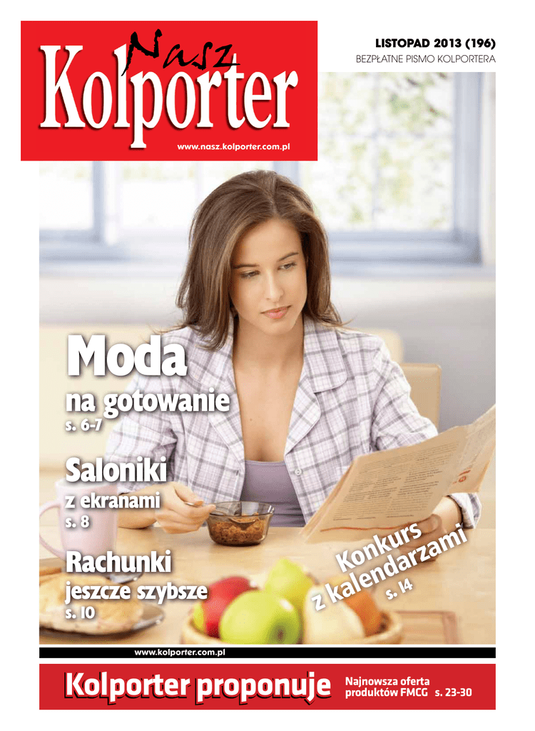 LISTOPAD 2013 (196) BEZPŁATNE PISMO KOLPORTERA www.nasz.kolporter.com.pl Moda na gotowanie s. 6-7 Saloniki z ekranami s. 8 Rachunki jeszcze szybsze s. 10 s mi r u k rza n o K nda e s. 14 l a zk www.kolporter.com.pl Kolporter proponuje Najnowsza oferta produktów FMCG s. 23-30 Chcesz nadać przesyłkę? Wejdź na stronę www. pewnapaczka.pl i zamów kuriera! Pewna dostawa Dobra cena Pewna Paczka to nowa usługa firmy kurierskiej K-EX. Z oferty mogą skorzystać zarówno osoby indywidualne, jak i małe firmy. Pewna Paczka to: Szybkość Wygoda Bezpieczeństwo Atrakcyjne ceny Przesyłki do odbiorców na terenie całego kraju doręczane są w terminie 2 dni, liczonych od dnia następującego po dniu prawidłowo złożonego zlecenia. www.pewnapaczka.pl SPIS TREŚCI LISTOPAD 2013 (196) Aktualności LISTOPAD 2013 (196) BEZPŁATNE PISMO KOLPORTERA Fleszem po rynku FMCG s. 4 Fleszem po rynku prasowym s. 5 Konkurs „Naszego Kolportera” i firmy Kalpol.Bis Wygrała skuter w konkursie s. 35 Moda Nagroda marszałka dla naczelnego NK” s. 35 s. 6-7 rynek Prasowy Saloniki Moda na gotowanie z ekranami s. 8 Rachunki jeszcze szybsze s. 10 s kur ami Konndarz e s. 14 l a zk WYDAWCA BC&O Polska (dawniej Kolporter Holding Sp. z o.o.) REDAKTOR NACZELNY Grzegorz Kozera REDAGUJĄ Dariusz Materek Kinga Beck-Tracz Joanna Szczepanik REKLAMA Bożena Migała tel. 515 220 002 OPRACOWANIE KOMPUTEROWE BC&O Polska Zakład Marketingu Kielce, ul. Zagnańska 61 tel. 41 367 80 34 SKŁAD Rafał Sabat DRUK Drukarnia ART 01-339 Warszawa ul. Fortuny 5 ADRES REDAKCJI „Nasz Kolporter” 25-528 Kielce ul. Zagnańska 61 tel. 41 367 80 31 www.nasz.kolporter.com.pl RADA PROGRAMOWA Mateusz Wiśniewski Grzegorz Fibakiewicz Wiesław Tkaczuk Jarosław Ambroziak Grzegorz Maciągowski NAKŁAD 21 715 egzemplarzy Redakcja nie bierze odpowiedzialności za treść reklam i nie zwraca nie zamówionych materiałów. FOT. Najnowsza oferta produktów FMCG s. 23-30 Moda na gotowanie s. 6-7 Raport „Naszego Kolportera” – przegląd czasopism kulinarnych www.kolporter.com.pl Kolporter proponuje 10 lat „Faktu” na polskim rynku s. 32 Jubileusz pierwszego polskiego tabloidu HANDEL Saloniki z ekranami s. 8 Kolporter nawiązał współpracę z firmą make sense media DOOH Trzeba szukać nowych trendów s. 6-7 s. 18 Od paru lat w naszym kraju panuje moda na gotowanie. Polacy coraz chętniej testują potrawy i odważniej łączą smaki. Zainteresowanie kulinariami pobudzają programy telewizyjne, w których znani kucharze udowadniają, że gotować może każdy. Dodatkową ciekawość tematem wzbudzają show promujące talenty i prezentujące rywalizację na umiejętności kulinarne. Kontrahent Kolportera Krzysztof Zając z Chełma o dobrych praktykach w handlu Slimy zostają w sprzedaży s. 19 Polska przyjęła z zadowoleniem decyzję Parlamentu Europejskiego USŁUGI ELEKTRONICZNE Rachunki ekspresowe jeszcze szybsze s. 10 Nowe rozwiązanie elektroniczne w salonikach prasowych Kolportera i salonach Top-Press s. 8 rynek WYDAWNICZY Na ścianę i do kieszeni Saloniki z ekranami s. 12-13 Tradycyjne papierowe kalendarze nie tracą na popularności Ludzie Ciepłe relacje z klientami s. 16-17 „Partner Roku” – laureaci lipcowej i sierpniowej edycji konkursu Kolportera Nie dla nich emerytura 20-21 Najlepsi sprzedawcy prasy z województwa wielkopolskiego Superoferta – skorzystaj! Kolporter proponuje s. 23-30 Rozrywka Dzięki współpracy Kolportera z firmą Make Sense Media DOOH w 205 salonikach prasowych i salonach Top-Press, po kilkumiesięcznej przerwie, wznowiono emisję programu telewizyjnego adresowanego specjalnie do klientów. Osoby odwiedzające saloniki mogą obejrzeć na ekranach najświeższe informacje, prognozę pogody, bieżące kursy walut oraz materiały reklamowe. Humor z okolic lady s. 40 s. 10 Krzyżówka Technopolu s. 44-45 Rachunki jeszcze szybsze Psycholog radzi Zrozumieć innych s. 36-37 Empatia – słowo, które warto zapamiętać Dziennik Gazeta Prawna radzi Kiedy policjant sprawdza kierowcę 38-39 Jakie mamy uprawnienia i obowiązki w razie kontroli drogowej Kolporter w prasie i Internecie s. 43 Nowości w ofercie Kolportera s. 46-49 Od października br. przelewy ekspresowe w salonikach prasowych Kolportera i salonach Top-Press realizowane są jeszcze szybciej niż dotychczas. Sprzedawca nie musi już wpisywać dokładnych danych klienta (z wyjątkiem telefonu kontaktowego), wystarczy, że przystawi czytnik do kodu kreskowego znajdującego się na rachunku. FOT. Piotr Lech na gotowanie FOT. Archiwum Przysłowia z kalendarza www.nasz.kolporter.com.pl FLESZEM PO RYNKU FMCG DrWitt z antyoksydantami Warzywa na ciepło Do oferty napojów i soków DrWitt dołączył wariant, którego zadaniem jest pomoc w walce z wolnymi rodnikami. Zawarta w napojach czarna porzeczka i granat często nazywane są superowocami, m.in. dzięki naturalnie występującym polifenolom. Nuta granatu łagodzi wyrazisty smak czarnej porzeczki, sprawiając, że DrWitt Antyoksydacja w przyjemny dla podniebienia sposób wspiera organizm w prawidłowym funkcjonowaniu. Marka Knorr jest pierwszą, która oferuje polskim konsumentom sosy do warzyw na ciepło. Debiutująca na rynku linia obejmuje cztery propozycje. Są wśród nich sos serowo-kremowy do brokułów i kalafiora, czosnkowo-serowy do szpinaku, ziołowo-maślany do mieszanki warzyw oraz tradycyjny do marchewki z groszkiem. Stworzone przez szefów kuchni Knorr kompozycje po połączeniu z masłem lub śmietaną pozwalają przyrządzić aksamitny sos, który nada świeżym albo mrożonym warzywom wyrazisty smak. Mieszanka Meksykańska Sztuka kulinarna Meksyku jest połączeniem wielu kultur - tradycji Indian i wpływów hiszpańskich konkwistadorów. Opiera się głównie na kukurydzy i roślinach strączkowych (około 20 różnych gatunków fasoli), odmianach papryki i chili. Czerpiąc z niej inspirację Hortex stworzył Mieszankę Meksykańską. Mieszanka ta przygotowana jest ze starannie wyselekc