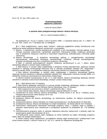AKT ARCHIWALNY Dz.U. Nr 57, poz. 553 z późn. zm. ROZPORZĄDZENIE 1) MINISTRA ZDROWIA z dnia 24 marca 2004 r. w sprawie stażu podyplomowego lekarza i lekarza dentysty (Dz. U. z dnia 8 kwietnia 2004 r.) Na podstawie art. 15 ust. 5 ustawy z dnia 5 grudnia 1996 r. o zawodzie lekarza (Dz. U. z 2002 r. Nr 2) 21, poz. 204, z późn. zm. ) zarządza się, co następuje: § 1. 1. Staż podyplomowy, zwany dalej "stażem", obejmuje pogłębienie wiedzy teoretycznej oraz praktyczną naukę udzielania świadczeń zdrowotnych, w przypadku: 1) lekarza - w dziedzinach: chorób wewnętrznych, pediatrii, w tym neonatologii, chirurgii ogólnej, w tym chirurgii urazowej, położnictwa i ginekologii, psychiatrii, intensywnej terapii, medycyny ratunkowej oraz w dziedzinie medycyny rodzinnej w warunkach stacjonarnej, ambulatoryjnej i domowej opieki zdrowotnej; 2) lekarza stomatologa - w dziedzinie stomatologii ogólnej, z uwzględnieniem stomatologii zachowawczej, stomatologii dziecięcej, periodontologii, ortodoncji, chirurgii stomatologicznej, protetyki stomatologicznej oraz w dziedzinie medycyny ratunkowej. 2. Staż, w zakresie poszczególnych dziedzin medycyny wymienionych w ust. 1, lekarz, lekarz stomatolog odbywa w ramach staży cząstkowych. 3. Staż lekarza, w ramach stażu cząstkowego z dziedziny chorób wewnętrznych, obejmuje również szkolenie w zakresie transfuzjologii klinicznej oraz w zakresie profilaktyki zakażeń HIV, diagnostyki i leczenia choroby AIDS, a w dziedzinie medycyny ratunkowej również kurs ratownictwa medycznego. 4. Staż lekarza stomatologa, w ramach stażu cząstkowego z dziedziny stomatologii ogólnej, obejmuje również szkolenie w zakresie profilaktyki zakażeń HIV, diagnostyki i leczenia choroby AIDS, a w dziedzinie medycyny ratunkowej kurs ratownictwa medycznego. 5. Oprócz szkoleń wymienionych w ust. 3 i 4, staż lekarza, lekarza stomatologa obejmuje również szkolenie w zakresie orzecznictwa lekarskiego, bioetyki i prawa medycznego. § 2. 1. Staż lekarza trwa 13 miesięcy. 2. Staż lekarza będącego żołnierzem w czynnej służbie wojskowej, pełniącego służbę w zakładzie opieki zdrowotnej utworzonym przez Ministra Obrony Narodowej, trwa 12 miesięcy. 3. Staż rozpoczyna się corocznie w dniach 1 października albo 1 marca. 4. Czas trwania stażu lekarza, lekarza stomatologa ulega przedłużeniu w razie: 1) niezdolności do pracy lekarza, lekarza stomatologa, o której mowa w art. 92 § 1 Kodeksu pracy, trwającej łącznie przez okres dłuższy niż 21 dni; 2) urlopu macierzyńskiego; 3) powołania lekarza lub lekarza stomatologa, po zakończeniu studiów, do odbycia przeszkolenia wojskowego; 4) przebywania lekarza, lekarza dentysty na urlopie wychowawczym, nie dłużej jednak niż dwa lata; 5) przebywania lekarza, lekarza stomatologa na urlopie bezpłatnym, nie dłużej jednak niż 3 miesiące; 6) niemożności zrealizowania elementów ramowego programu stażu, z powodu ciąży w związku z zakazem wykonywania prac określonych w przepisach wydanych na podstawie art. 176 Kodeksu pracy; 7) niezrealizowania programu stażu w zakresie odbywania dyżurów medycznych z powodu ciąży lub sprawowania opieki nad dzieckiem do lat 4. 5. Przedłużenie czasu trwania stażu następuje na okres realizacji tej części ramowego programu stażu, która nie została zrealizowana. 6. Okres trwania staży cząstkowych, szczegółowe rodzaje zajęć teoretycznych i praktycznych oraz okres trwania szkoleń, o których mowa w § 1 ust. 3-5, i zakres ich odbywania określają dla: AKT ARCHIWALNY 1) lekarza - ramowy program stażu podyplomowego lekarza, stanowiący załącznik nr 1 do rozporządzenia, 2) lekarza stomatologa - ramowy program stażu podyplomowego lekarza stomatologa, stanowiący załącznik nr 2 do rozporządzenia - zwane dalej "ramowym programem". 7. Lekarz, który posiada jednocześnie ograniczone prawo wykonywania zawodu lekarza i ograniczone prawo wykonywania zawodu lekarza stomatologa, nie może w tym samym czasie odbywać stażu lekarza i lekarza stomatologa. 8. W uzasadnionych przypadkach minister właściwy do spraw zdrowia, po zasięgnięciu opinii właściwego marszałka województwa oraz właściwej okręgowej izby lekarskiej, może wyrazić zgodę na rozpoczęcie stażu podyplomowego w innym terminie niż określony w ust. 3. § 3. 1. Kierując lekarza, lekarza stomatologa do odbycia stażu, okręgowa rada lekarska uwzględnia w kolejności lekarzy i lekarzy stomatologów, którzy posiadają stałe miejsce zamieszkania na obszarze działania okręgowej rady lekarskiej i ukończyli studia z kolejno najwyższą średnią oceną, a także bierze pod uwagę maksymalną liczbę lekarzy mogących jednocześnie odbywać staż w tym podmiocie. 2. W razie braku możliwości odbycia stażu przez lekarza, lekarza stomatologa na obszarze działania okręgowej izby lekarskiej, której jest członkiem, okręgowa rada lekarska tej izby uzgadnia z inną okręgową radą lekarską możliwość odbycia przez lekarza, lekarza stomatologa stażu na obszarze jej działania. 3. W przypadku, o którym mowa w ust. 2, okręgowa rada lekarska, na obszarze której lekarz, lekarz stomatolog będzie odbywał staż, wpisuje tego lekarza, lekarza stomatologa na listę członków i kieruje go do odbycia stażu. 4. Właściwa okręgowa rada lekarska wydaje: 1) lekarzowi kartę stażu podyplomowego lekarza, według wzoru określonego w załączniku nr 3 do rozporządzenia, 2) lekarzowi stomatologowi kartę stażu podyplomowego lekarza stomatologa, według wzoru określonego w załączniku nr 4 do rozporządzenia - zwane dalej "kartą stażu", 3) odpowiednio lekarzowi, lekarzowi stomatologowi ankietę - "Ocena stażu podyplomowego lekarza", "Ocena stażu podyplomowego lekarza stomatologa", której wzór stanowią odpowiednio załączniki nr 5 i 6 do rozporządzenia. 5. W przypadku likwidacji podmiotu, o którym mowa w § 5 ust. 1, lub skreślenia go z listy, o której mowa w art. 1