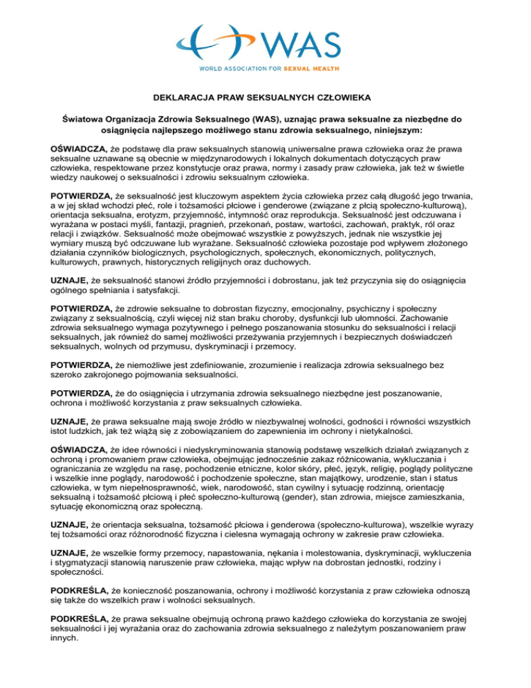 DEKLARACJA PRAW SEKSUALNYCH CZŁOWIEKA Światowa Organizacja Zdrowia Seksualnego (WAS), uznając prawa seksualne za niezbędne do osiągnięcia najlepszego możliwego stanu zdrowia seksualnego, niniejszym: OŚWIADCZA, że podstawę dla praw seksualnych stanowią uniwersalne prawa człowieka oraz że prawa seksualne uznawane są obecnie w międzynarodowych i lokalnych dokumentach dotyczących praw człowieka, respektowane przez konstytucje oraz prawa, normy i zasady praw człowieka, jak też w świetle wiedzy naukowej o seksualności i zdrowiu seksualnym człowieka. POTWIERDZA, że seksualność jest kluczowym aspektem życia człowieka przez całą długość jego trwania, a w jej skład wchodzi płeć, role i tożsamości płciowe i genderowe (związane z płcią społeczno-kulturową), orientacja seksualna, erotyzm, przyjemność, intymność oraz reprodukcja. Seksualność jest odczuwana i wyrażana w postaci myśli, fantazji, pragnień, przekonań, postaw, wartości, zachowań, praktyk, ról oraz relacji i związków. Seksualność może obejmować wszystkie z powyższych, jednak nie wszystkie jej wymiary muszą być odczuwane lub wyrażane. Seksualność człowieka pozostaje pod wpływem złożonego działania czynników biologicznych, psychologicznych, społecznych, ekonomicznych, politycznych, kulturowych, prawnych, historycznych religijnych oraz duchowych. UZNAJE, że seksualność stanowi źródło przyjemności i dobrostanu, jak też przyczynia się do osiągnięcia ogólnego spełniania i satysfakcji. POTWIERDZA, że zdrowie seksualne to dobrostan fizyczny, emocjonalny, psychiczny i społeczny związany z seksualnością, czyli więcej niż stan braku choroby, dysfunkcji lub ułomności. Zachowanie zdrowia seksualnego wymaga pozytywnego i pełnego poszanowania stosunku do seksualności i relacji seksualnych, jak również do samej możliwości przeżywania przyjemnych i bezpiecznych doświadczeń seksualnych, wolnych od przymusu, dyskryminacji i przemocy. POTWIERDZA, że niemożliwe jest zdefiniowanie, zrozumienie i realizacja zdrowia seksualnego bez szeroko zakrojonego pojmowania seksualności. POTWIERDZA, że do osiągnięcia i utrzymania zdrowia seksualnego niezbędne jest poszanowanie, ochrona i możliwość korzystania z praw seksualnych człowieka. UZNAJE, że prawa seksualne mają swoje źródło w niezbywalnej wolności, godności i równości wszystkich istot ludzkich, jak też wiążą się z zobowiązaniem do zapewnienia im ochrony i nietykalności. OŚWIADCZA, że idee równości i niedyskryminowania stanowią podstawę wszelkich działań związanych z ochroną i promowaniem praw człowieka, obejmując jednocześnie zakaz różnicowania, wykluczania i ograniczania ze względu na rasę, pochodzenie etniczne, kolor skóry, płeć, język, religię, poglądy polityczne i wszelkie inne poglądy, narodowość i pochodzenie społeczne, stan majątkowy, urodzenie, stan i status człowieka, w tym niepełnosprawność, wiek, narodowość, stan cywilny i sytuację rodzinną, orientację seksualną i tożsamość płciową i płeć społeczno-kulturową (gender), stan zdrowia, miejsce zamieszkania, sytuację ekonomiczną oraz społeczną. UZNAJE, że orientacja seksualna, tożsamość płciowa i genderowa (społeczno-kulturowa), wszelkie wyrazy tej tożsamości oraz różnorodność fizyczna i cielesna wymagają ochrony w zakresie praw człowieka. UZNAJE, że wszelkie formy przemocy, napastowania, nękania i molestowania, dyskryminacji, wykluczenia i stygmatyzacji stanowią naruszenie praw człowieka, mając wpływ na dobrostan jednostki, rodziny i społeczności. PODKREŚLA, że konieczność poszanowania, ochrony i możliwość korzystania z praw człowieka odnoszą się także do wszelkich praw i wolności seksualnych. PODKREŚLA, że prawa seksualne obejmują ochroną prawo każdego człowieka do korzystania ze swojej seksualności i jej wyrażania oraz do zachowania zdrowia seksualnego z należytym poszanowaniem praw innych. Prawa seksualne to prawa człowieka dotyczące seksualności człowieka: 1. Prawo do równości i niedyskryminacji Każdy człowiek ma prawo do korzystania ze wszystkich praw seksualnych wymienionych w niniejszej Deklaracji, bez różnicowania ze względu na rasę, pochodzenie etniczne, kolor skóry, płeć, język, religię, poglądy polityczne i wszelkie inne poglądy, kraj pochodzenia i pochodzenie społeczne, miejsce zamieszkania, stan majątkowy, urodzenie, niepełnosprawność, wiek, narodowość, stan cywilny i sytuację rodzinną, orientację seksualną, tożsamość płciową i genderową (społeczno-kulturową) i jej wyraz, stan zdrowia, sytuację ekonomiczną, sytuację społeczną oraz stan lub status danej osoby. 2. Prawo do życia, wolności i bezpieczeństwa osobistego Każdy człowiek ma prawo do życia, wolności i bezpieczeństwa, które nie mogą być przedmiotem samowolnych gróźb, których nie można arbitralnie ograniczać lub odbierać ze względu na seksualność lub z powodów z nią związanych, w tym ze względu na orientację seksualną, konsensualne (opierające się na zgodzie partnera) zachowania i praktyki seksualne, tożsamość płciową i genderową (społeczno-kulturową) i jej wyraz, jak też ze względu na świadczenie usług w zakresie zdrowia seksualnego i reprodukcyjnego oraz ze względu na dostęp do nich. 3. Prawo do niezależności, autonomii i nietykalności cielesnej Każdy człowiek ma prawo do kontroli oraz do podejmowania decyzji związanych ze swoją seksualnością oraz ze swoim ciałem w sposób wolny, w tym do dokonywania wyboru zachowań, praktyk, partnerów, relacji i stosunków seksualnych przy jednoczesnym poszanowaniu praw drugiego człowieka. Wolne i świadome (dokonywane po uzyskaniu wszelkich niezbędnych informacji) podejmowanie decyzji wymaga wyrażenia wolnej i świadomej (jw.) zgody przed rozpoczęciem wszelkich działań w zakresie seksualności lub działań z nią związanych, taki