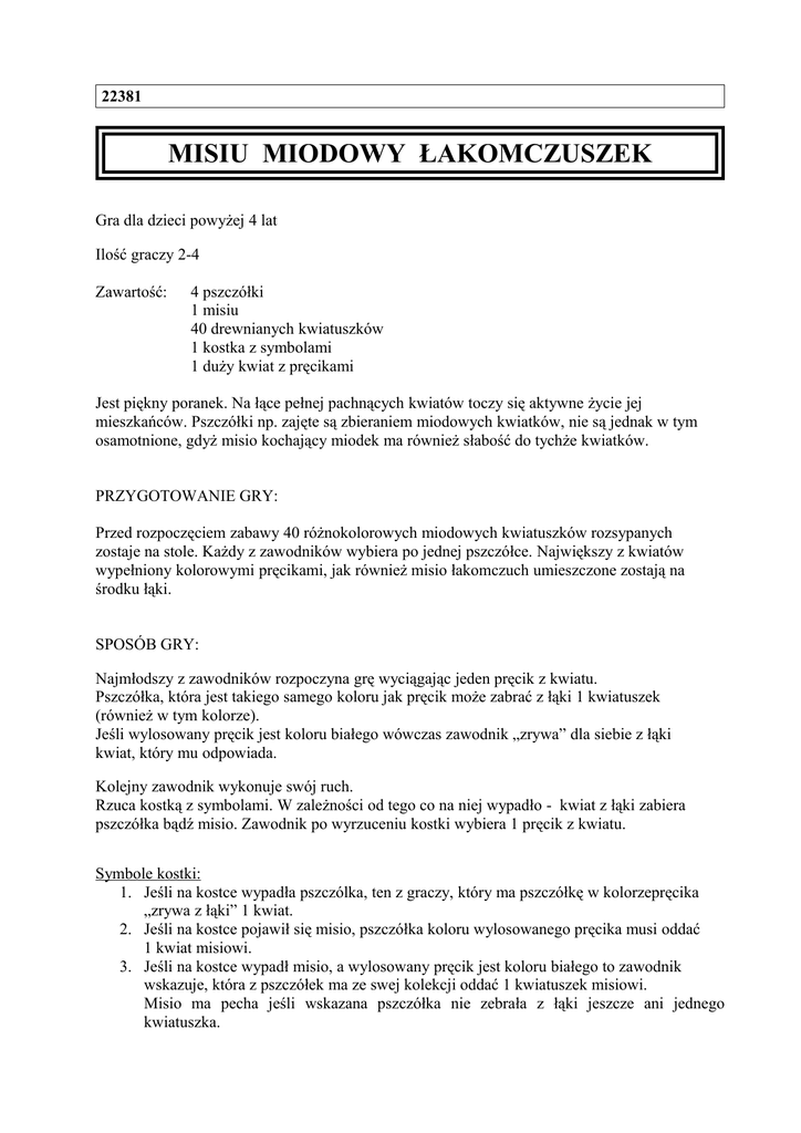 22381 MISIU MIODOWY ŁAKOMCZUSZEK Gra dla dzieci powyżej 4 lat Ilość graczy 2-4 Zawartość: 4 pszczółki 1 misiu 40 drewnianych kwiatuszków 1 kostka z symbolami 1 duży kwiat z pręcikami Jest piękny poranek. Na łące pełnej pachnących kwiatów toczy się aktywne życie jej mieszkańców. Pszczółki np. zajęte są zbieraniem miodowych kwiatków, nie są jednak w tym osamotnione, gdyż misio kochający miodek ma również słabość do tychże kwiatków. PRZYGOTOWANIE GRY: Przed rozpoczęciem zabawy 40 różnokolorowych miodowych kwiatuszków rozsypanych zostaje na stole. Każdy z zawodników wybiera po jednej pszczółce. Największy z kwiatów wypełniony kolorowymi pręcikami, jak również misio łakomczuch umieszczone zostają na środku łąki. SPOSÓB GRY: Najmłodszy z zawodników rozpoczyna grę wyciągając jeden pręcik z kwiatu. Pszczółka, która jest takiego samego koloru jak pręcik może zabrać z łąki 1 kwiatuszek (również w tym kolorze). Jeśli wylosowany pręcik jest koloru białego wówczas zawodnik „zrywa” dla siebie z łąki kwiat, który mu odpowiada. Kolejny zawodnik wykonuje swój ruch. Rzuca kostką z symbolami. W zależności od tego co na niej wypadło - kwiat z łąki zabiera pszczółka bądź misio. Zawodnik po wyrzuceniu kostki wybiera 1 pręcik z kwiatu. Symbole kostki: 1. Jeśli na kostce wypadła pszczólka, ten z graczy, który ma pszczółkę w kolorzepręcika „zrywa z łąki” 1 kwiat. 2. Jeśli na kostce pojawił się misio, pszczółka koloru wylosowanego pręcika musi oddać 1 kwiat misiowi. 3. Jeśli na kostce wypadł misio, a wylosowany pręcik jest koloru białego to zawodnik wskazuje, która z pszczółek ma ze swej kolekcji oddać 1 kwiatuszek misiowi. Misio ma pecha jeśli wskazana pszczółka nie zebrała z łąki jeszcze ani jednego kwiatuszka. W momencie kiedy zawodnik wyciąga z kwiatu pręcik i wkłada go tam ponownie, cały kwiat powinien być obrócony kilka razy wokół własnej osi po to aby utrudnić zapamiętanie, gdzie znajdują się poszczególne pręciki. Gra kończy się w momencie, kiedy jedna z pszczółek „zerwie z Łąki” ostatni kwiat swojego koloru. Zwycięzcą jest ta pszczółka, która zerwała największą liczbę miodowych kwiatuszków, ponieważ jest najbardziej pracowita. Zwycięzcą może być również misio jeśli uda mu się zebrać jako pierwszemu największą liczbę miodowych kwiatuszków. Życzymy p r z y j e m n e j z a b a w y. UWAGA! Gra nie jest zalecana dla dzieci poniżej trzech lat. Zbyt małe części mogą zostać przez nie połknięte. Należy zachować opakowanie i instrukcję. Zawierają one ważne informacje mogące być przydatne w przyszłości. Zgodność z wymaganiami bezpieczeństwa określonymi w rozporządzeniu Rady Ministrów z dnia 18.09.2001r. w sprawie szczegółowych warunków dotyczących bezpieczeństwa zabawek PRODUCENT: ”BELEDUC” NIEMCY IMPORTER: P.P.H. ”AKCES” ul. Graniczna 7 62-081 BARANOWO tel. 061 814-20-82 POWYŻEJ 3 ROKU ŻYCIA