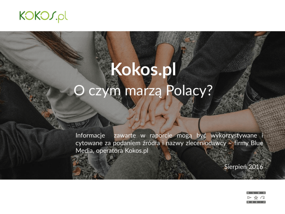 Kokos.pl O czym marzą Polacy? Informacje zawarte w raporcie mogą być wykorzystywane i cytowane za podaniem źródła i nazwy zleceniodawcy – firmy Blue Media, operatora Kokos.pl Sierpień 2016 METODOLOGIA Badanie zrealizowane było metodą CATI. Zrealizowano łącznie 1004 wywiady telefoniczne na reprezentatywnej próbie dorosłych Polaków TERMIN REALIZACJI Wywiady telefoniczne realizowane były w maju 2016 r. RESPONDENCI Polacy w wieku 18-65 lat. Próba reprezentatywna ze względu na wiek, płeć, województwo i wielkość miejsca zamieszkania. Do analizy przekrojowej wykorzystano następujące podgrupy: Wiek: Grupa młodsza 18-35 lat; Grupa starsza 3665 lat Czy ma Pan(i) jakieś marzenia? Czy ma Pan(i) jakieś marzenia? Tak; 82% Nie; 18% O czym Pan(i) marzy? Proszę wymienić wszystkie istotne dla Pani(a) marzenia. Podróże Wyższe zarobki Wakacje / odpoczynek Dom / mieszkanie Zdrowie Samochód / motor Remont domu / mieszkania Znalezienie pracy / Lepsza praca Własny biznes Sprzęt RTV/AGD Sprzęt sportowy ( w tym rower) Dziecko, wnuki Nowy telefon / komputer / tablet Miłość / znalezienie partnera(ki) Rozwój (szkoły, kursy, szkolenia) Seks Inne 30% 25% 19% 18% 12% 11% 10% 9% 5% 4% 2% 2% 1% 1% 1% 0,1% 20% Czy ma Pan(i) jakieś marzenia? Czy ma Pan(i) jakieś marzenia? 85% 80% O czym Pan(i) marzy? Proszę wymienić wszystkie istotne dla Pani(a) marzenia. 31% 30% Podróże Wyższe zarobki Dom / mieszkanie 16% Wakacje / odpoczynek Remont domu / mieszkania 7% Zdrowie Znalezienie pracy / Lepsza praca 6% 2%5% Sprzęt RTV/AGD Tak Dziecko, wnuki Sprzęt sportowy ( w tym rower) Młodsza grupa Starsza grupa Miłość / znalezienie partnera(ki) Nowy telefon / komputer / tablet Rozwój (szkoły, kursy, szkolenia) Seks 12% 16% 14% 10% 14% Samochód / motor Własny biznes 15% 7% 4% 2% 2% 3% 1% 2% 1% 2% 1% 2% 0% 0,0% 0,2% Młodsza grupa 8% Starsza grupa 28% 24% 23% 25% Czy ma Pan(i) jakieś marzenia? Jakie są przeszkody w realizacji marzeń? 58% Brak pieniędzy 41% Brak czasu 13% Konieczność dbania o rodzinę Praca to uniemożliwia Brakuje odwagi Lenistwo / Nie chce mi się Inne 10% Brak czasu Konieczność dbania o… Praca to uniemożliwia 6% Brakuje odwagi 1% 20% 63% 55% Brak pieniędzy Lenistwo / Nie chce mi się Młodsza grupa 13% 13% 11% 10% 6% 6% 1% 1% 43% 40% Starsza grupa Czy ma Pan(i) jakieś marzenia? Co by Pan(i) zrobił(a) gdyby nagle dostał(a) Pan(i) 5 000 zł? Na co przeznaczył(a)by Pan(i) te środki? Na wakacje / wycieczkę Na drobne przyjemności Na remont mieszkania Odłożyłbym / dodał do oszczędności Na sprzęt RTV / AGD Na sprzęt sportowy (w tym rower) Na samochód / motor Na spłatę zadłużenia Na szkołę / kurs / szkolenie Na sprzęt komputerowy / telefon / tablet Na kulturę (książki, płyty, koncerty, kino) Dołożyłbym do zakupu mieszkania / domu Dał(a)bym komuś z rodziny Przeznaczył(a)bym na leczenie Przeznaczył(a)bym na cele charytatywne Inne (jakie?) 38% 27% 13% 6% 4% 3% 3% 2% 2% 2% 1% 1% 1% 10% 13% 19% Zapraszamy do kontaktu: Zuzanna Szybisty Profeina [email protected] 663 728 472