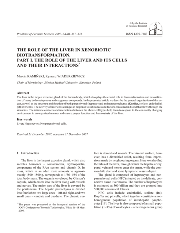 © by the Institute of Forensic Research ISSN 1230-7483 Problems of Forensic Sciences 2007, LXXII, 357–378 THE ROLE OF THE LIVER IN XENOBIOTIC BIOTRANSFORMATION. PART I. THE ROLE OF THE LIVER AND ITS CELLS AND THEIR INTERACTIONS* Marcin KAMIÑSKI, Ryszard WIADERKIEWICZ Chair of Morphology, Silesian Medical University, Katowice, Poland Abstract The liver is the largest exocrine gland of the human body, which also plays the crucial role in biotransformation and detoxification of many both endogenous and exogenous compounds. In the presented article we describe the general organisation of this organ, as well as the structure and function of both parenchymal (hepatocytes) and nonparenchymal (Kupffer, stellate, endothelial, pit) liver cells. The activity of liver cells changes in response to substances and factors contained in blood that flows through the sinusoids. The intimate contacts and interactions between the above cell types help them to respond to the constantly changing environment in an organised manner and ensure proper function and homeostasis of the liver. Key words Liver; Hepatocytes; Nonparenchymal cells. Received 21 December 2007; accepted 31 December 2007 1. Introduction The liver is the largest exocrine gland, which also secretes hormones – somatomedin, erythropoietin, components of the RAA system and vitamin D. Its mass, which in an adult male amounts to approximately 1500–1800 g, corresponds to 1/36–1/50 of the total body mass. The organ is enveloped by Glisson’s capsule, which enters into the liver along with vessels and nerves. The major part of the liver is covered by the peritoneum. The hepatic parenchyma is divided into four lobes: two large ones – left and right, and two small ones – caudate and quadrate. The phrenic sur* The paper was presented at the inaugural session of the XXIV Conference of Forensic Toxicologists, Wisla, 16–18 May, 2006. face is domed and smooth. The visceral surface, however, has a diversified relief, resulting from impressions made by neighbouring organs. Here we also find the hilus of the liver, through which the hepatic artery, portal vein and nerves enter the organ, while the common bile duct and some lymphatic vessels depart. The gland is composed of hepatocytes and nonparenchymal cells (NPC) situated on the delicate, connective tissue liver stroma. The number of hepatocytes is estimated at 300 billion and they are grouped into 500,000 anatomical lobules. NPC cells include endothelial, stellate (Ito), Kupffer and pit cells, which together constitute a nonhomogenous population of intrahepatic lymphocytes [19]. The liver is also composed of a small population (1–3%) of ovalocytes – a heterogeneous group 358 M. Kamiñski, R. Wiaderkiewicz of stem cells situated in the hepatic niche surrounding the Hering ductules [3, 20, 21]. The hepatocytes produce trabeculae, closely associated with blood vessels and bile canaliculi. Opinions concerning interrelations between the hepatic trabeculae, functional circulation, nutritional circulation and bile tract have evolved over time, leading to the differentiation of successive (separate) organisational units, and subsequently structural and functional ones. Thus, anatomical (classic) lobules have been distinguished, as well as portal lobules, simple and complex liver acini, and acinar aggregates. Finally, a microcirculatory unit has been proposed; it is composed of a variable number of hepatocytes and NPC cells, which are associated not only with respect to circulation, but also linked functionally by local paracrine and autocrine activity [1, 10]. The metabolic potential of the liver is astonishingly vast, encompassing the synthesis and excretion of bile, production of albumins, a and b globulins and proteins participating in blood coagulation processes, synthesis of some amino acids, oxidative deamination, transamination and urea synthesis. The production of metalbinding proteins – metalothioneins, transferrins, ceruloplasmin, acute phase proteins and a-fetoprotein occurs here. The hepatocytes also control systemic glucose homeostasis through storing glucose as glycogen. They store vitamins A, B, D and E, and also participate in their metabolisation. Thanks to the cytochrome P450 (CYP-450)-dependent monooxigenase system, the liver regulates the reactions of xenobiotic oxidation, hydroxylation or reduction, being a real systemic “tycoon” in this respect. The constitutive forms of the abovementioned cytochromes metabolize steroids, cholesterol, bile acids, prostaglandins and leukotrienes [16]. The location of the liver among the branches of the celiac trunk and portal vein is conducive to its special role in synthesis and biotransformation. The nutritional vasculature represented by the hepatic artery supplies the organ with oxygenated blood, while at the level of precapillary vessels, its smaller branches equipped with muscle cell groups fulfil the role of sphincters, accessed by nonmyelinated, preganglial autonomic system nerve fibres that regulate blood flow at the level of functional units. In turn, the portal vein that carries venous blood from the pancreas, spleen and intestines, supplies the organ with a large amount of nutrients, building substances, iron and hormones. Via this route, the liver is supplied with such substances as insulin, glycogen, GEP hormones and some cytokines, including IL-1 and IL-6. Significant blood flow through the liver, amounting to approximately 100–130 ml/min/100 g of tissue creates privileged conditions for this organ, and the gradient distribution of partial oxygen pressure in particular zones of a lobule or a simple acinus is one of the reasons for their morphological and biochemical heterogeneity. 2. Hepatic parenchymal cells 2.1. Structure and function of hepatocytes In rat liver, hepatocytes account for 60%–67% of the total number of cells, at the same time constituting 84.2% of the liver volume. The hepatocytes are an element of th