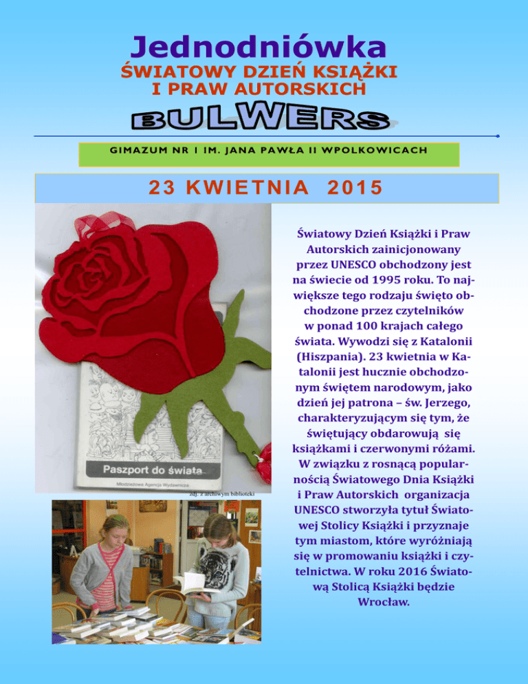 23 KWIETNIA 2015 Jednodniówka ŚWIATOWY DZIEŃ KSIĄŻKI I