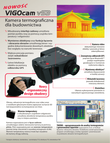 NOWOŚĆ Kamera termograficzna dla budownictwa Wbudowany interfejs radiowy umożliwia pomiar punktu rosy za pomocą czujnika temperatury i wilgotności Wymienne obiektywy oraz funkcja łączenia i obracania obrazów umożliwiają łatwe i wygodne dokumentowanie dowolnych obiektów bez względu na warunki terenowe. Kamera video dokumentuje mierzone obiekty i pozwala je łatwo zidentyfikować. Większa precyzja pomiaru dzięki wskaźnikowi laserowemu Zewnętrzny odbiornik GPS poprzez łącze Bluetooth™ podaje współrzędne geodezyjne w momencie wykonania zdjęcia. Łatwa lokalizacja obiektu za pomocą odbiornika GPS Wymienny obiektyw* umożliwia dopasowanie w każdej sytuacji. Wskaźnik laserowy pozwala zlokalizować mierzony element. Nowy ergonomiczny design obudowy Oświetlacz Ułatwia wykonywanie pomiarów w warunkach ograniczonego oświetlenia. Obrazy, sekwencje termograficzne oraz video wraz z notatkami głosowymi można zapisywać na karcie SD lub bezpośrednio na komputerze (on-line). Wzorzec temperatury z wbudowanym czujnikiem wilgotności umożliwia określenie temperatury punktu rosy w miejscu pomiaru. Kamera wyposażona jest w łącze radiowe umożliwiające zdalne sterowanie kamerą za pomocą pilota. Pilot wyposażony jest we wzorzec temperatury (pomiar temp. otoczenia) o wysokiej emisyjności (0.96). Wartość temperatury wzorca może być wysyłana do kamery drogą radiową. THERM – oprogramowanie do analizy termogramów i generowania raportów wyposażone m.in. w funkcje łączenia i obracania obrazów. Dodatkowo został opracowany program umożliwiający analizę naprężeń i przemieszczeń na podstawie obrazów termograficznych *dostępne obiektywy: standardowy - szerokokątny F18, obiektywy F35, teleobiektyw F60 SPECYFIKACJA TECHNICZNA Parametry obrazu termicznego Typ detektora obrazu FPA (Focal Plane Array) mikrobolometr 384 x 288 pikseli Rozdzielczość obrazu 384x288 lub 320x240 pikseli (przełączana) Pole widzenia Minimalna odległość pomiaru 30ºx23º (standard) lub 15ºx11º (opcja) lub 9ºx7º (opcja) Częstotliwość obrazu 30/60 Hz 0.15m (dla obiektywu standardowego) Rozdzielczość termiczna NETD Rozdzielczość przestrzenna Zakres spektralny 0,065ºC dla 30ºC 1.4mrad (obiektyw standard), 0.7mrad (opcja), 0.4mrad (opcja) Zoom cyfrowy 8 - 14 µm x2, x4 Regulacja ostrości Ręczna Parametry obrazu wizyjnego Wbudowana kamera video Kolorowa 1600x1200 pikseli Wizualizacja Wyświetlacz LCD Kolorowy 3.7" z regulacją położenia i jasności Komputer PC On-line przez port USB (w oknie programu THERM) Informacje wyświetlane na LCD Obraz termiczny lub wizyjny, aktualna paleta barw, zmierzone temperatury oraz wartości minimalne, maksymalne (w zależności od trybu pracy), stan baterii, dostępna pamięć na karcie, tryb pracy, zoom cyfrowy, stan wskaźnika laserowego Informacje wyświetlane za pomocą diod LED Wskaźnik zasilania Rejestracja obrazów Obraz termiczny Zapis obrazów i sekwencji ruchomych na karcie SD lub na dysku twardym komputera przez port USB. Możliwość eksportu obrazów do typowych formatów graficznych i tekstowych (m.in. do arkuszy kalkulacyjnych) Obraz wizyjny Zapis obrazów na karcie SD lub dysku twardym PC Notatka głosowa Do 1 minuty komentarza z każdym obrazem (wbudowany mikrofon i głośnik) Pomiar Zakres pomiarowy -30°C do 120°C, -10°C do 250°C, określony indywidualnie do 1500°C Dokładność ±2°C, ±2% zakresu Tryby pomiaru - pirometryczny, pomiar temp. w punkcie centralnym obrazu - pomiar temp. w dowolnym punkcie obrazu - pomiar temp. w 5 dowolnych punktach obrazu jednocześnie - pomiar temp. minimalnej, maksymalnej Korekcja Korekcja transmisji przez atmosferę (z uwzględnieniem wilgotności, temperatury otoczenia i odległości) Korekcja emisyjności (0.01 do 1.0) Korekcja temperatury otoczenia Interfejsy USB Wyjście audio /video USB 2.0 High Speed PAL Łącze radiowe Wyzwalanie zapisu pomiaru pilotem radiowym (opcja) Wejście / wyjście synchronizacji CMOS 3.3 V, wyzwalanie zapisu Zasilanie Akumulator Ładowanie akumulatora Li-ion, 2200 mAh / 7.4 V, wymienny, wielokrotnego łądowania Zewnętrzną ładowarką (w zestawie) z zasilacza 230VAC lub z instalacji samochodowej 12VDC Czas pracy akumulatora 2 godz. Zasilanie zewnętrzne 9 - 16 VDC Wskaźnik laserowy Typ Półprzewodnikowy, λ = 650nm, moc maksymalna: 3 mW, klasa 2 Wymiary i masa, warunki pracy Wymiary 155 x 150 x 82 mm (z obiektywem standard) Masa 1.5 kg (z baterią i obiektywem standard) Temperatura pracy -20ºC do 40ºC Temperatura przechowywania -30ºC do 70ºC Stopień ochronności obudowy IP 54 Mocowanie statywu Standardowe ¼"-20 Oprogramowanie Program do akwizycji i analizy danych pomiarowych: THERM Wyposażenie standardowe Kamera v53 ze standardowym obiektywem, GPS, oświetlacz, akumulator Li-ion 2200 mAh/7.4V (2 szt.), ładowarka, zasilacz ładowarki i kamery 230V, pilot radiowy z wzorcem temperatury i czujnikiem wilgotności, walizka transportowa, pasek na szyję, kabel audio/video, kabel USB, karta pamięci SD 4GB, czytnik kart SD, CD-ROM z oprogramowaniem THERM, instrukcja obsługi Wyposażenie opcjonalne Obiektyw 15ºx11º, teleobiektyw 9ºx7º, statyw MANFROTTO biblioteka programistyczna (DLL), biblioteka programistyczna LabView Producent zastrzega sobie możliwość wprowadzenia zmian bez zapowiedzi, 01.2012r. SYSTEM S.A. VIGO System S.A., ul. Poznańska 129/133 05-850 Ożarów Mazowiecki tel: +(48 22) 666 14 06 e-mail: [email protected] www.vigo.com.pl www.kamery.vigo.com.pl