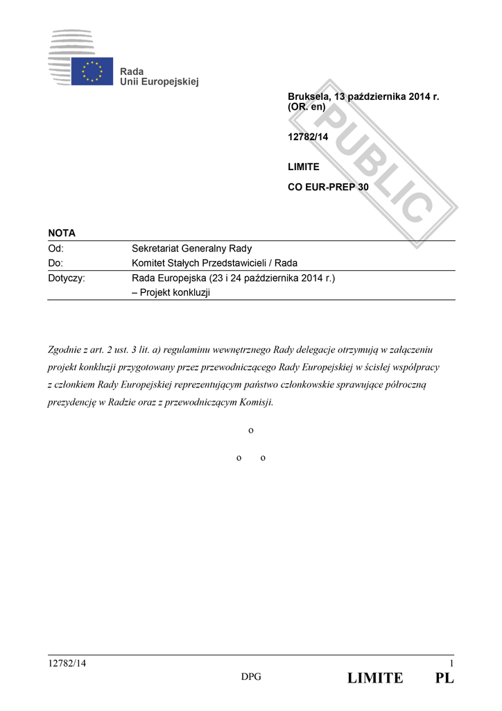 Rada Un i iEu rope jsk ie j źdz ie rn ika2014r . B rukse la,13pa (OR .en) C I BL U P 12782/ 14 L IM ITE COEURPREP30 NOTA Od : Do : Se k re ta r ia t Gene ra lnyRady Kom i te tS ta ł y chP r zed s taw i c ie l i/Rada Do ty cz y : RadaEu rope js ka(23 i24paźdz ie rn i ka2014r . ) –P ro je k tkon k lu z j i r t .2u s t .3l i t .a )r egu lam inuw ew n ę t r zn egoR ad yd e l ega c j eo t r z ym u jąwza łą c z en iu Z godn i eza p ro j e k tkon k lu z j ip r z ygo t ow an yp r z e zp r z ew odn i c zą c egoR ad yE u rop e j s k i e jwś c i s ł e jw spó łp ra c y zc z łon k i emR ad yE u rop e j s k i e jr ep r e z en tu ją c ympań s tw oc z ł on kow s k i es p raw u ją c ep ó ł ro c zną ad z i eo ra zzp r z ew o dn i c zą c ymK om i s j i . p r e z yd en c j ęwR o o 12782 / 14 Con se i lUE o DPG L IM ITE 1 PL I. RAMY POLITYKI KLIMATYCZNO-ENERGETYCZNEJ DO ROKU 2030 1. W oparciu o zasady określone w konkluzjach Rady Europejskiej obradującej w marcu 2014 r. Rada Europejska uzgodniła dzisiaj ramy polityki klimatyczno-energetycznej Unii Europejskiej do roku 2030. W związku z tym nie później niż w pierwszym kwartale 2015 r. UE przedłoży swój wkład w tym zakresie z uwzględnieniem ram czasowych dotyczących zawarcia globalnego porozumienia klimatycznego uzgodnionych przez strony Ramowej konwencji ONZ w sprawie zmian klimatu w Warszawie. Rada Europejska apeluje do wszystkich krajów o przedstawienie ambitnych celów i polityk odpowiednio wcześnie przed Konferencją Stron (COP 21) w Paryżu. Rada Europejska powróci do tej kwestii po konferencji, by dokonać oceny jej wyników. Cel w zakresie redukcji emisji gazów cieplarnianych 2. Rada Europejska zatwierdziła unijny cel zakładający ograniczenie krajowych emisji gazów cieplarnianych do roku 2030 o 40% w porównaniu z poziomem z roku 1990. W związku z tym: 2.1 wyznaczony cel zostanie zrealizowany wspólnie przez UE w sposób najbardziej racjonalny pod względem kosztów, przy czym sektory objęte unijnym systemem handlu uprawnieniami do emisji (ETS) i nieobjęte tym systemem musiałyby do 2030 r. zredukować emisję gazów cieplarnianych, odpowiednio, o 43% i 30% w stosunku do roku 2005; 2.2 wszystkie państwa członkowskie będą uczestniczyć w tych staraniach, zapewniając równowagę między względami sprawiedliwości i solidarności; EU ETS 2.3 sprawnie funkcjonujący, zreformowany system handlu uprawnieniami do emisji (ETS) będzie głównym europejskim instrumentem wykorzystywanym do osiągnięcia tego celu; roczny wskaźnik dotyczący zmniejszenia limitu maksymalnych dozwolonych emisji zostanie podniesiony z 1,74% do 2,2% począwszy od 2021 r.; 2.4 przydział bezpłatnych uprawnień nie wygaśnie i będzie nadal obowiązywał po roku 2020, tak by zapobiec ucieczce emisji wynikającej z polityki przeciwdziałania zmianie klimatu, do czasu podjęcia porównywalnych działań w innych dużych gospodarkach; ma to służyć zapewnieniu odpowiednich poziomów wsparcia dla sektorów, którym grozi utrata konkurencyjności na arenie międzynarodowej. Przyszłe uprawnienia powinny zapewnić lepsze dostosowanie do zmieniających się poziomów produkcji w różnych sektorach. Jednocześnie w pełni utrzymane zostaną zachęty dla przemysłu w zakresie innowacji, a obciążenia administracyjne nie zwiększą się; 12782/14 DPG LIMITE 2 PL 2.5 istniejący program finansowania NER300 zostanie przedłużony, jego zakres zostanie rozszerzony o innowacje w zakresie technologii niskoemisyjnych w sektorach przemysłowych, a początkowa pula zostanie zwiększona do 400 mln uprawnień (NER400). Do tego programu będą się kwalifikować projekty inwestycyjne we wszystkich państwach członkowskich; 2.6 powstanie nowa rezerwa obejmująca [1–2%] uprawnień w zakresie unijnego ETS służąca zaspokojeniu szczególnie wysokich potrzeb w zakresie dodatkowych inwestycji w tych państwach członkowskich o niskich dochodach (PKB na mieszkańca 1 poniżej 60% średniej UE). Rezerwa ta będzie miała następujące cechy: – wpływy z rezerwy będą wykorzystywane do zwiększenia efektywności energetycznej i modernizacji systemów energetycznych tych państw członkowskich, tak by ich obywatele mogli korzystać z czystszej i bezpiecznej energii po przystępnej cenie; – wykorzystanie środków finansowych będzie całkowicie przejrzyste; – uprawnienia z puli rezerwowej zostaną zbyte w drodze aukcji zgodnie z tymi samymi zasadami i na tych samych warunkach co inne uprawnienia; – rezerwa umożliwi utworzenie funduszu zarządzanego przez EBI, który będzie aktywnie współpracować z bankami krajowymi i regionalnymi, tak by zapewnić stosowną dystrybucję środków, a jednocześnie uproszczone mechanizmy dla małych projektów; 2.7 w imię solidarności i wzrostu 10% uprawnień EU ETS, które państwa członkowskie mają sprzedać na aukcji, zostanie rozdzielonych między te państwa, których PKB na mieszkańca nie przekroczył 90% średniej UE (w roku 2013), natomiast pozostałe uprawnienia zostaną rozdzielone pomiędzy wszystkie państwa członkowskie na podstawie zweryfikowanych emisji; 1 Wszystkie odniesienia do PKB dotyczą 2013 r. i są wyrażone w EUR w cenach rynkowych. 12782/14 DPG LIMITE 3 PL Sektory nieobjęte ETS 2.8 metodologia określania krajowych celów redukcji emisji dla sektorów nieobjętych ETS, uzgodniona w decyzji dotyczącej wspólnego wysiłku redukcyjnego na rok 2020, będzie nadal stosowana do roku 2030, a podział wysiłku redukcyjnego będzie ustalany na podstawie względnego PKB na mieszkańca. Wszystkie państwa członkowskie przyczynią się do osiągnięcia łącznej redukcji emisji przez UE w 2030 r., realizując cele krajowe na poziomie od 0% do -40% w stosunku do roku 2005; 2.9 cele dla państw członkowskich, w których PKB na mieszkańca jest wyższe niż średnia UE, zostaną odpowiednio dostosowane, tak by odzwierciedlić racjonalność kosztową w ramach tej grupy oraz krajowe pozi