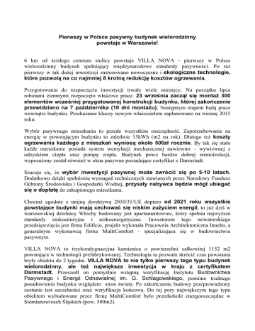 Pierwszy w Polsce pasywny budynek wielorodzinny powstaje w Warszawie! 6 km od ścisłego centrum stolicy powstaje VILLA NOVA - pierwszy w Polsce wielorodzinny budynek spełniający międzynarodowe standardy pasywności. Po raz pierwszy w tak dużej inwestycji zastosowano nowoczesne i ekologiczne technologie, które pozwolą na co najmniej 8 krotną redukcję kosztów ogrzewania. Przygotowania do rozpoczęcia inwestycji trwały wiele miesięcy. Na początku lipca robotami ziemnymi rozpoczęto właściwe prace. 23 września zaczął się montaż 300 elementów wcześniej przygotowanej konstrukcji budynku, której zakończenie przewidziano na 7 października (10 dni montażu). Następnym etapem będą prace wewnątrz budynku. Przekazanie kluczy nowym właścicielem zaplanowano na wiosnę 2015 roku. Wybór pasywnego mieszkania to przede wszystkim oszczędność. Zapotrzebowanie na energię w powstającym budynku to zaledwie 15kWh (m2 na rok). Dlatego też koszty ogrzewania każdego z mieszkań wyniosą około 500zł rocznie. By tak się stało każde mieszkanie posiada system wentylacji mechanicznej nawiewno – wywiewnej z odzyskiem ciepła oraz pompę ciepła. Budynek prócz bardzo dobrej termoizolacji, wyposażony został również w okna pasywne posiadające certyfikat z Darmstadt. Szacuje się, że wybór inwestycji pasywnej może zwrócić się po 5-10 latach. Dodatkowo dzięki spełnieniu wymagań technicznych stawianych przez Narodowy Fundusz Ochrony Środowiska i Gospodarki Wodnej, przyszły nabywca będzie mógł ubiegać się o dopłatę do zakupionego mieszkania. Chociaż zgodnie z unijną dyrektywą 2010/31/UE dopiero od 2021 roku wszystkie powstające budynki mają cechować się niskim zużyciem energii, to już dziś w warszawskiej dzielnicy Włochy budowany jest apartamentowiec, który spełnia najwyższe standardy niskoemisyjne i niskoenergetyczne. Inwestorem tego nowatorskiego przedsięwzięcia jest firma Edificio, projekt wykonała Pracownia Architektoniczna Innebo, a generalnym wykonawcą firma MultiComfort - specjalizująca się w budownictwie pasywnym. VILLA NOVA to trzykondygnacyjna kamienica o powierzchni całkowitej 1152 m2 powstająca w technologii prefabrykowanej. Technologia ta pozwala skrócić czas powstania bryły obiektu do 2 tygodni. VILLA NOVA to nie tylko pierwszy tego typu budynek wielorodzinny, ale też największa inwestycja w kraju z certyfikatem Darmstadt. Przeszedł on pomyślnie wstępną weryfikację Instytutu Budownictwa Pasywnego i Energii Odnawialnej im. G. Schlagowskiego, pomimo trudnego posadowienia budynku względem stron świata. Po zakończeniu budowy przeprowadzony zostanie test szczelności oraz weryfikacja końcowa. Do tej pory największym tego typu obiektem wybudowane przez firmę MultiComfort było przedszkole energooszczędne w Siemianowicach Śląskich (pow. 500m2). Właściciele marki Edificio, na bazie wcześniejszych doświadczeń zdobytych w branży deweloperskiej chcą zaoferować nową jakość polskiemu budownictwu mieszkaniowemu. Oprócz aspektu ekologicznego i energooszczędnego bardzo ważny jest aspekt rodzinny i społeczny. Wielkość mieszkań ma spełniać oczekiwania rodzin z większą ilością dzieci, a sam budynek ma sprzyjać relacjom sąsiedzkim. Powierzchnia każdego z 6 mieszkań to około 100 metrów. Do dwóch usytuowanych na parterze przypisane są prywatne ogródki. Mieszkania na najwyższej kondygnacji mają przypisane tarasy na dachu, zaprojektowano balkony na pierwszym i drugim piętrze. Przewidziano też wspólne podwórko umożliwiające integrację mieszkańców. W budynku jest winda, a w podziemiu znajduje się garaż. VILLA NOVA powstaje w Warszawie przy ul. Dziupli 27 na terenie Starych Włoch, w granicach przedwojennego urbanistycznego założenia Miasta-Ogrodu Włochy. Jej najbliższe otoczenie to głównie niska zabudowa jednorodzinna. Lokalizacja jest dobrze skomunikowana z centrum miasta - jedynie 6 km. W pobliżu znajduje się stacja SKM i KM (czas przejazdu do centrum to 12 minut), a także przystanki autobusowe. Osoby do kontaktu: Edificio - Anita Hawryńska tel. 530 250 079 [email protected] Warszawa MulitComfort - Karolina Gruza tel.781 239 482 [email protected] Wieliczka/Kraków