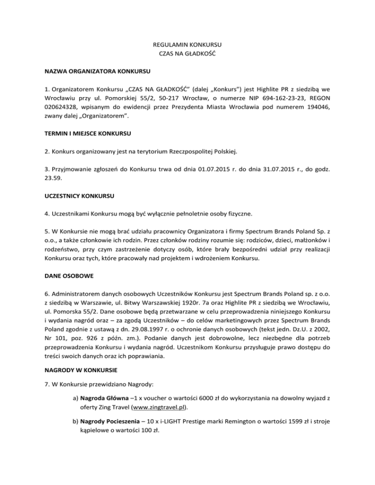 REGULAMIN KONKURSU CZAS NA GŁADKOŚĆ NAZWA ORGANIZATORA KONKURSU 1. Organizatorem Konkursu „CZAS NA GŁADKOŚĆ” (dalej „Konkurs”) jest Highlite PR z siedzibą we Wrocławiu przy ul. Pomorskiej 55/2, 50-217 Wrocław, o numerze NIP 694-162-23-23, REGON 020624328, wpisanym do ewidencji przez Prezydenta Miasta Wrocławia pod numerem 194046, zwany dalej „Organizatorem”. TERMIN I MIEJSCE KONKURSU 2. Konkurs organizowany jest na terytorium Rzeczpospolitej Polskiej. 3. Przyjmowanie zgłoszeń do Konkursu trwa od dnia 01.07.2015 r. do dnia 31.07.2015 r., do godz. 23.59. UCZESTNICY KONKURSU 4. Uczestnikami Konkursu mogą być wyłącznie pełnoletnie osoby fizyczne. 5. W Konkursie nie mogą brać udziału pracownicy Organizatora i firmy Spectrum Brands Poland Sp. z o.o., a także członkowie ich rodzin. Przez członków rodziny rozumie się: rodziców, dzieci, małżonków i rodzeństwo, przy czym zastrzeżenie dotyczy osób, które brały bezpośredni udział przy realizacji Konkursu oraz tych, które pracowały nad projektem i wdrożeniem Konkursu. DANE OSOBOWE 6. Administratorem danych osobowych Uczestników Konkursu jest Spectrum Brands Poland sp. z o.o. z siedzibą w Warszawie, ul. Bitwy Warszawskiej 1920r. 7a oraz Highlite PR z siedzibą we Wrocławiu, ul. Pomorska 55/2. Dane osobowe będą przetwarzane w celu przeprowadzenia niniejszego Konkursu i wydania nagród oraz – za zgodą Uczestników – do celów marketingowych przez Spectrum Brands Poland zgodnie z ustawą z dn. 29.08.1997 r. o ochronie danych osobowych (tekst jedn. Dz.U. z 2002, Nr 101, poz. 926 z późn. zm.). Podanie danych jest dobrowolne, lecz niezbędne dla potrzeb przeprowadzenia Konkursu i wydania nagród. Uczestnikom Konkursu przysługuje prawo dostępu do treści swoich danych oraz ich poprawiania. NAGRODY W KONKURSIE 7. W Konkursie przewidziano Nagrody: a) Nagroda Główna –1 x voucher o wartości 6000 zł do wykorzystania na dowolny wyjazd z oferty Zing Travel (www.zingtravel.pl). b) Nagrody Pocieszenia – 10 x i-LIGHT Prestige marki Remington o wartości 1599 zł i stroje kąpielowe o wartości 100 zł. c) Nagrody Dodatkowe – 20 x i-Light Reveal IPL o wartości 799 zł i stroje kąpielowe o wartości 100 zł. d) Nagrody Gwarantowane - kupony rabatowe o wartości 100 zł, uprawniające do zniżkowego zakupu i-LIGHT PRO lub i-LIGHT Prestige marki Remington w e-sklepach Media Markt i Saturn. 8. Nagroda Gwarantowana wysyłana jest w formie kodów rabatowych do realizacji w e-sklepie Media Markt (www.mediamarkt.pl) lub w e-sklepie Saturn (www.saturn.pl). 9. Stroje kąpielowe, o których mowa w punkcie 7b i 7c, zwycięzca wybiera poprzez wskazanie konkretnego modelu oraz rozmiaru (według katalogu i tabeli rozmiarów przesłanych przez Organizatora drogą elektroniczną). 9.1. W przypadku braku dostępności wskazanego przez Zwycięzcę modelu i/lub rozmiaru, Organizator zastrzega sobie prawo do zaproponowania Zwycięzcy innego modelu stroju kąpielowego. 9.2. Strój kąpielowy zostanie dostarczony Zwycięzcy drogą pocztową w ciągu 30 dni roboczych od dnia dostarczenia organizatorowi informacji o wybranym modelu i rozmiarze. 9.3. Stroje kąpielowe nie podlegają wymianie oraz zwrotowi. 10. Do nagród rzeczowych dodana jest dodatkowo Nagroda Pieniężna stanowiąca równowartość zryczałtowanego podatku dochodowego od nagrody, która nie zostanie wydana do rąk Uczestnika, lecz zostanie potrącona przez Organizatora i przeznaczona na pokrycie należnego podatku dochodowego od osób fizycznych od wygranej, na co Uczestnik biorąc udział w Konkursie wyraża zgodę. 11. Warunkiem niezbędnym do odbioru nagród rzeczowych jest przesłanie Organizatorowi następujących danych, niezbędnych do rozliczenia podatku dochodowego od nagrody: imię, nazwisko, adres zamieszkania, PESEL, właściwy Urząd Skarbowy wraz z adresem. 11.1 Nie podanie tych danych jest równoznaczne z rezygnacją z nagrody. 11.2 Uczestnik przesyłając swoje dane osobowe poświadcza jednocześnie ich prawdziwość, będąc świadomym odpowiedzialności karnej za poświadczenie nieprawdy mogące doprowadzić Organizatora do niekorzystnego rozporządzenia własnym lub cudzym mieniem poprzez wprowadzenie w błąd (art. 286 kodeksu karnego). 12. Kupon rabatowy uprawnia do zakupu jednego urządzenia i-LIGHT PRO lub i-LIGHT Prestige marki Remington i można go wykorzystać do 21 sierpnia 2015 r. 13. Nagród nie można wymienić na gotówkę lub inne produkty marki Remington. Nagrody nie można się też zrzec na rzecz innej osoby. ZASADY I PRZEBIEG KONKURSU 14. Zadaniem Uczestników Konkursu jest zaznaczenie depilowanych części ciała na stronie www.czasnagladkosc.pl, odpowiedź na zadanie konkursowe i wypełnienie formularza kontaktowego. Wzór formularza stanowi Załącznik nr 1 niniejszego Regulaminu. 15. Nagroda Główna i Nagrody Pocieszenia zostaną przyznane Uczestnikom wyłonionym przez trzyosobowe Jury, w skład którego wejdą przedstawiciele Organizatora i firmy Spectrum Brands Poland Sp. z o.o. Przy wyborze zwycięzców, Jury weźmie pod uwagę poprawność zgłoszenia i ciekawy pomysł na wykorzystanie zaoszczędzonego czasu. 16. Nagrody Dodatkowe zostaną przyznane Uczestnikom w drodze głosowania na stronie www.czasnagladkosc.pl. 17. Pozostałym uczestnikom Konkursu zostaną przekazane Nagrody Gwarantowane. 18. Informacje o wynikach Konkursu zostaną zamieszczone 10 sierpnia 2015 r. na stronie www.czasnagladkosc.pl oraz wysłane na adresy e-mail Zwycięzców. PRZEBIEG GŁOSOWANIA 19. Głosowanie odbywa się na stronie konkursowej znajdującej się pod adresem www.czasnagladkosc.pl. 20. Głosowanie trwa od dnia 01.07.2015 roku do dnia 31.07.2015 roku. 21. Przedmiotem głosowania będzie odpowiedź na zadanie konkursowe, o którym mowa w punkcie 9. niniejszego Regulaminu. Zgłoszenie konkursowe pojawi się na stronie konkursowej automatycznie po zarejestrowaniu Zgłoszenia przez Uczestnika na www.czasnagladkosc.pl. 22. Org