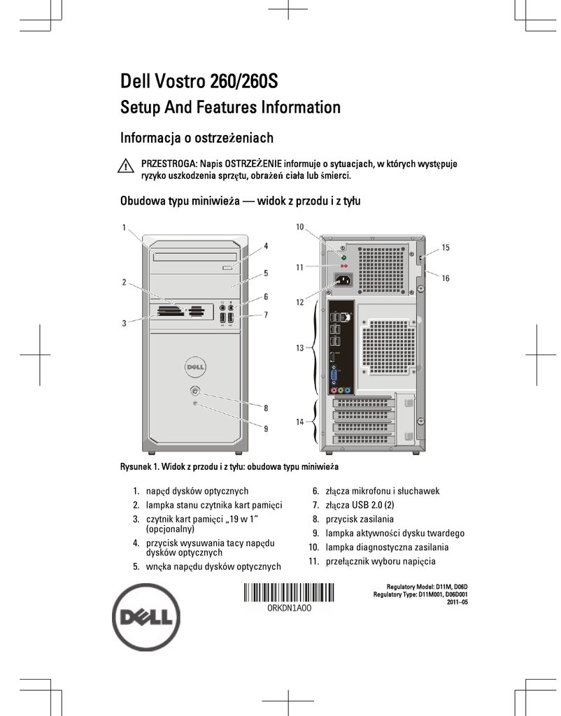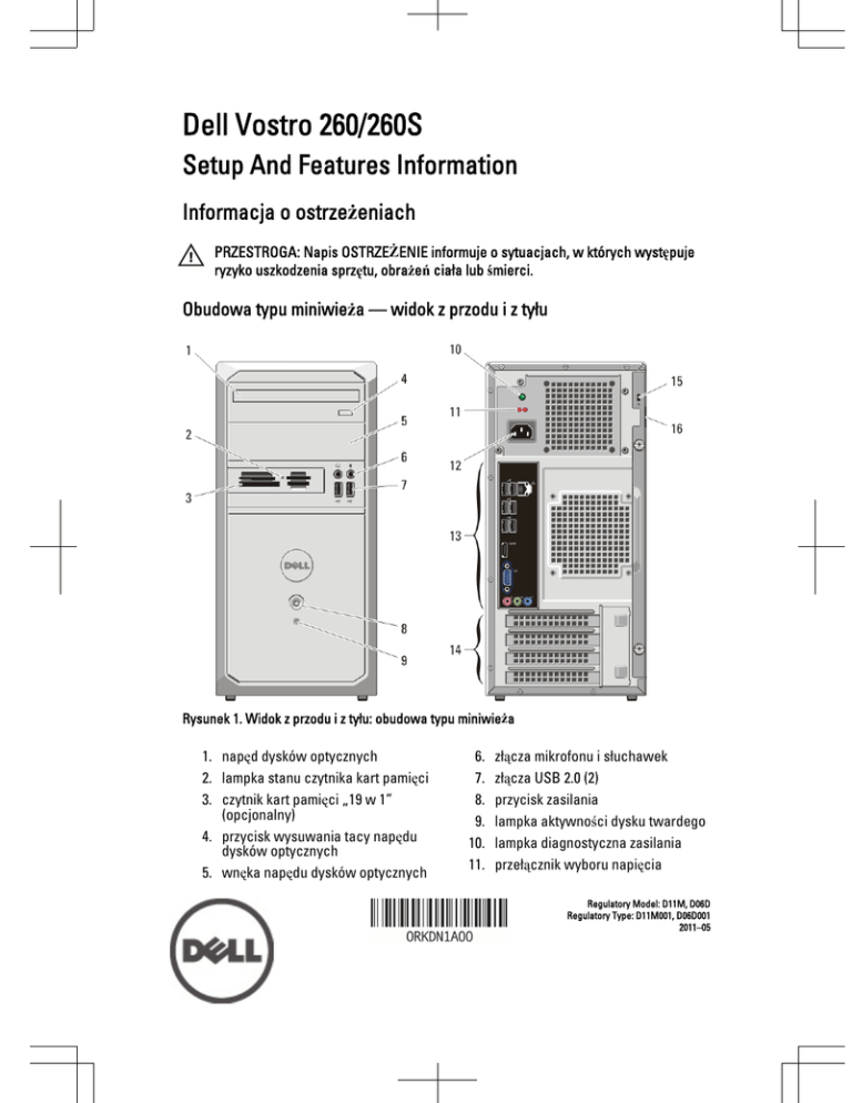 Dell Vostro 260/260S Setup And Features Information Informacja o ostrzeżeniach PRZESTROGA: Napis OSTRZEŻENIE informuje o sytuacjach, w których występuje ryzyko uszkodzenia sprzętu, obrażeń ciała lub śmierci. Obudowa typu miniwieża — widok z przodu i z tyłu Rysunek 1. Widok z przodu i z tyłu: obudowa typu miniwieża 1. napęd dysków optycznych 2. lampka stanu czytnika kart pamięci 3. czytnik kart pamięci „19 w 1” (opcjonalny) 4. przycisk wysuwania tacy napędu dysków optycznych 5. wnęka napędu dysków optycznych 6. 7. 8. 9. 10. 11. złącza mikrofonu i słuchawek złącza USB 2.0 (2) przycisk zasilania lampka aktywności dysku twardego lampka diagnostyczna zasilania przełącznik wyboru napięcia Regulatory Model: D11M, D06D Regulatory Type: D11M001, D06D001 2011–05 12. złącze kabla zasilania 13. złącza na panelu tylnym 14. gniazda kart rozszerzeń (4) 15. gniazdo linki zabezpieczającej 16. ucho kłódki Obudowa typu slim tower — widok z przodu i z tyłu Rysunek 2. Widok z przodu i z tyłu: obudowa typu slim tower 1. wnęka napędu dysków optycznych 2. przycisk zasilania 3. przycisk wysuwania tacy napędu dysków optycznych 4. lampka aktywności dysku twardego 5. czytnik kart pamięci „8 w 1” 6. złącza słuchawek i mikrofonu 7. złącza USB 2.0 (2) 2 8. 9. 10. 11. 12. 13. 14. złącza na panelu tylnym gniazda kart rozszerzeń (4) lampka diagnostyczna zasilania przycisk diagnostyki zasilania ucho kłódki gniazdo linki zabezpieczającej złącze kabla zasilania Obudowa typu miniwieża i slim tower — panel tylny Rysunek 3. Panel tylny: obudowa typu miniwieża i slim tower 1. 2. 3. 4. 5. lampka integralności łącza złącze karty sieciowej lampka aktywności sieci złącze wejścia liniowego złącze wyjścia liniowego 6. 7. 8. 9. złącze mikrofonu złącze VGA złącze HDMI złącza USB 2.0 (6) Szybka konfiguracja PRZESTROGA: Przed rozpoczęciem wykonywania jakichkolwiek procedur opisanych w tym rozdziale należy zapoznać się z informacjami dotyczącymi bezpieczeństwa dostarczonymi wraz z komputerem. Dodatkowe zalecenia można znaleźć na stronie www.dell.com/regulatory_compliance. UWAGA: Niektóre urządzenia są dostarczane z komputerem tylko wtedy, gdy zostały zamówione. 1. Podłącz monitor jednym z następujących kabli: Rysunek 4. złącze HDMI 3 Rysunek 5. złącze VGA 2. Podłącz klawiaturę lub mysz USB (opcjonalnie). Rysunek 6. Podłączanie urządzeń USB 3. Podłącz kabel sieciowy (opcjonalnie). Rysunek 7. Połączenie sieciowe 4. Podłącz kabel (lub kable) zasilania. Rysunek 8. Podłączanie zasilania 5. Naciśnij przyciski zasilania monitora i komputera. 4 Rysunek 9. Włączanie zasilania Dane techniczne UWAGA: Poniższe dane techniczne obejmują wyłącznie dane wymagane przez prawo, które muszą być dostarczone z komputerem. Pełne i aktualne dane techniczne komputera są dostępne w witrynie support.dell.com. Informacje o systemie Mikroukład Intel 6 Series H61 Procesor • • Intel Core i3/i5 series Intel Pentium dual-core • Intel HD Graphics (z dwurdzeniowym procesorem hybrydowym CPU-GPU Intel Pentium) Intel HD Graphics 2000 (z procesorem hybrydowym CPU-GPU Intel Core i3/i5 65 W i 95W) Grafika Standard grafiki: Zintegrowana • Autonomiczna Zintegrowana pamięć grafiki Karta graficzna PCI Express x16 Do 1,7 GB współużytkowanej pamięci wideo (Microsoft Windows Vista i Windows 7) Pamięć Złącza modułów pamięci dwa gniazda DIMM Pojemność modułów pamięci 1 GB, 2 GB lub 4 GB Typ 1333 MHz DDR3 (bez korekcji błędów ECC) 5 Pamięć Minimalna pojemność pamięci 1 GB Maksymalna pojemność pamięci 8 GB Napędy Vostro 260 Vostro 260S dwie jedna dwie jedna Dostępne z zewnątrz: Wnęki na napędy 5,25" Dostępne od wewnątrz: Wnęki na napędy 3,5" Wskaźniki i lampki diagnostyczne lampka przycisku zasilania Światło białe: ciągłe białe światło wskazuje, że komputer jest włączony; ciągłe pomarańczowe światło sygnalizuje stan uśpienia/gotowości. Światło pomarańczowe: w przypadku niemożności uruchomienia komputera ciągłe pomarańczowe światło oznacza problem z płytą systemową lub zasilaczem. Przerywane pomarańczowe światło oznacza problem z płytą systemową. lampka aktywności napędu Światło białe: przerywane białe światło wskazuje, że komputer odczytuje dane lub zapisuje dane na dysku twardym. Zasilanie Bateria pastylkowa litowa bateria pastylkowa 3 V CR2032 Napięcie wejściowe prąd przemienny 100 V do 127 V /200 V do 240 V Częstotliwość wejściowa 50 Hz-60 Hz Moc Vostro 260 6 300 W Zasilanie Vostro 260S 250 W Prąd wejściowy Vostro 260 9,00 A (8,00 A)/4,50 A Vostro 260S 8,00 A/4,00 A UWAGA: Całkowita moc wyjściowa przy prądzie +5,50 V i +3,30 V nie może przekraczać 160 W Maksymalne rozpraszanie ciepła Vostro 260 1574 BTU/h Vostro 260S 1312 BTU/h UWAGA: Rozproszenie ciepła jest obliczane na podstawie znamionowej mocy zasilania w watach. Wymiary i masa Vostro 260 Wysokość 360,00 mm (14,17") Szerokość 175,00 mm (6,89") Głębokość 436,30 mm (17,18") Masa (minimalna) 8,20 kg (18,08 funta) Vostro 260S Wysokość 360,00 mm (14,17") Szerokość 102,00 mm (4,02") Głębokość 433,10 mm (17,05") Masa (minimalna) 7,60 kg (16,76 funta) Środowisko pracy Temperatura: Podczas pracy 10 °C do 35 °C (50 °F do 95 °F) 7 Środowisko pracy Podczas przechowywania Wilgotność względna –40 °C do 65 °C (–40 °F do 149 °F) 20% do 80% (bez kondensacji) Dodatkowe informacje i zasoby W dostarczonych z komputerem dokumentach dotyczących bezpieczeństwa i przepisów prawnych oraz w witrynie poświęconej zgodności z przepisami, pod adresem www.dell.com/regulatory_compliance, można znaleźć szczegółowe informacje na następujące tematy: • Zalecenia dotyczące bezpieczeństwa • Certyfikaty i przepisy prawne • Ergonomia W witrynie www.dell.com można znaleźć dodatkowe informacje na następujące tematy: • Gwarancja • Warunki sprzedaży (tylko w