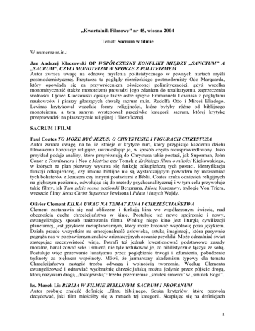 „Kwartalnik Filmowy” nr 45, wiosna 2004 Temat: Sacrum w filmie W numerze m.in.: Jan Andrzej Kłoczowski OP WSPÓŁCZESNY KONFLIKT MIĘDZY „SANCTUM” A „SACRUM”, CZYLI MONOTEIZM W SPORZE Z POLITEIZMEM Autor zwraca uwagę na odnowę myślenia politeistycznego w pewnych nurtach myśli postmodernistycznej. Przytacza tu poglądy niemieckiego postmodernisty Odo Marquarda, który opowiada się za przywróceniem oświeconej polimityczności, gdyż wszelka monomityczność (także monoteizm) prowadzi jego zdaniem do totalitaryzmu, zaprzeczenia wolności. Ojciec Kłoczowski opisuje także ostre spięcie Emmanuela Levinasa z poglądami naukowców i pisarzy głoszących chwałę sacrum m.in. Rudolfa Otto i Mircei Eliadego. Levinas krytykował wszelkie formy religijności, które byłyby różne od biblijnego monoteizmu, a tym samym występował przeciwko kategorii sacrum, której krytykę przeprowadził na płaszczyźnie religijnej i filozoficznej. SACRUM I FILM Paul Coates TO MOŻE BYĆ JEZUS: O CHRYSTUSIE I FIGURACH CHRYSTUSA Autor zwraca uwagę, na to, iż istnieje w krytyce nurt, który przypisuje każdemu dziełu filmowemu konotacje religijne, uwznioślając je, w sposób często nieusprawiedliwony. Jako przykład podaje analizy, które przyrównują do Chrystusa takie postaci, jak Superman, John Conor z Terminatora i Neo z Matrixa czy Tomek z Krótkiego filmu o miłości Kieślowskiego, w których na plan pierwszy wysuwa się funkcję odkupieńczą tych postaci. Identyfikacja funkcji odkupieńczej, czy imiona biblijne nie są wystarczającym powodem by utożsamiać tych bohaterów z Jezusem czy innymi postaciami z Biblii. Coates szuka odniesień religijnych na głębszym poziomie, odwołując się do metody psychoanalitycznej i w tym celu przywołuje takie filmy, jak Tam gdzie rosną poziomki Bergmana, Idiotę Kurosawy, trylogię Von Triera, wreszcie filmy Jesus Christ Superstar Jewisona i Piłata i innych Wajdy. Olivier Clement KILKA UWAG NA TEMAT KINA I CHRZEŚCIJAŃSTWA Clement zastanawia się nad obliczem i funkcją kina we współczesnym świecie, nad obecnością ducha chrześcijaństwa w kinie. Postuluje też nowe spojrzenie i nowy, ewangelizujący sposób traktowania filmu. Według niego kino jest liturgią cywilizacji planetarnej, jest językiem metaplanetarnym, który może kreować wspólnotę poza językiem. Działa przede wszystkim na emocjonalność człowieka, sztuką imaginacji, która pasywnie pogrąża nas w pozbawionym znaków orientacyjnych oceanie psychiki. Może odrealniać świat zastępując rzeczywistość wizją. Potrafi też jednak kwestionować podstawowe zasady moralne, banalizować seks i śmierć, nie tyle redukować je, co nihilistycznie łączyć ze sobą. Postuluje więc przerwanie lunatyzmu przez pogłębienie trwogi i zdumienia, pobudzenie tęsknoty za pięknem wspólnoty. Mówi, że jarmarczny akademizm typowy dla tematu Chrześcijaństwa zastąpić trzeba odwagą i wolnością tworzenia. Według Clementa ewangelizować i odnawiać wyobraźnię chrześcijańską można jedynie przez pójście drogą, którą nazywam drogą „dostojewską”: trzeba przemieniać „smutek śmierci” w „smutek Boga”. ks. Marek Lis BIBLIA W FILMIE BIBLIJNYM. SACRUM I PROFANUM Autor próbuje znaleźć definicje „filmu biblijnego. Szuka kryteriów, które pozwolą decydować, jaki film mieściłby się w ramach tej kategorii. Skupiając się na definicjach 1 pochodzących z licznych słowników, encyklopedii i opracowań filmowych stara się usystematyzować dotychczasowe podejścia do problemu. Celem jego wywodu nie jest jednak ustalenie czy film biblijny stanowi odrębny gatunek, ale raczej odpowiedź na pytanie, jak realizowana w filmie „biblijność” może być postrzegana i oceniana. Autor Konstruuje typologię filmów o tematyce biblijnej – od bezpośrednich adaptacji tekstu Pisma Świętego, poprzez próby wejścia w wymiar duchowy Biblii, aż do przywoływania archetypów występujących w niej postaci i sytuacji (przy szczególnym uwzględnieniu osoby Chrystusa, jego Pasji i problemu odkupienia świata). Agnieszka Morstin-Popławska PŁACZ NAD OBRAZEM. PROBLEMATYKA KICZU RELIGIJNEGO W FILMIE JERZEGO ŁUKASZEWICZA „FAUSTYNA” Tekst jest próbą odpowiedzi na pytanie o przyczyny żywotności kiczu w obrębie ikonografii religijnej zachodnioeuropejskiego kręgu kulturowego. Powstrzymując się od jednoznacznej oceny zjawiska, autorka śledzi mechanizmy powstawania i funkcjonowania kiczu religijnego poddając analizie film Jerzego Łukaszewicza "Faustyna". Pytanie o możliwość współistnienia kiczu i sacrum jest tu pytaniem o to, czy poprzez język kiczu można wyrazić prawdy najgłębsze i najistotniejsze. Tekst jest rozdziałem pracy magisterskiej Kicz w kinie polskim lat 90. Monika Piętas BIBLIJNY WYMIAR „OFIAROWANIA” ANDRIEJA TARKOWSKIEGO Według autorki Ofiarowanie Andrieja Tarkowskiego ma charakter medytacji religijnej i bezpośrednio odnosi się nie tylko do wydarzeń opisanych w Biblii, ale i do ich znaczeń. Związek tego filmu z Biblią można obserwować na czterech płaszczyznach: tematu, treści, rzeczy przedstawionych oraz elementów formy. Przestrzenie rzeczywistości ekranowej i świata biblijnego bardzo wyraźnie łączą się ze sobą - w obu widoczny jest ten sam porządek moralny i sens eschatologiczny. Piętas wnikliwie analizuje związki i odniesienia, jakie łączą te dwie płaszczyzny. Stara się też umieścić Ofiarowanie w kontekście teorii reżysera dotyczących istoty i misji twórczości artysty w ogóle. DOŚWIADCZENIE TRANSCENDENCJI? Vivian Sobchack ROZSZERZONE SPOJRZENIE W ZAWĘŻONEJ PRZESTRZENI. KIEŚLOWSKI I KWESTIA TRANSCENDENCJI Autorka wykorzystując myśli Claude Lévi-Straussa oraz filozoficzne teorie spojrzenia Jacquesa Lacana i Keiji Nishitaniego bada sposoby rozszerzania przestrzeni pola wizualengo stosowane przez Krzysztofa Kieślowskiego, głównie w pierwszej części cyklu Dekalog. Wedłu