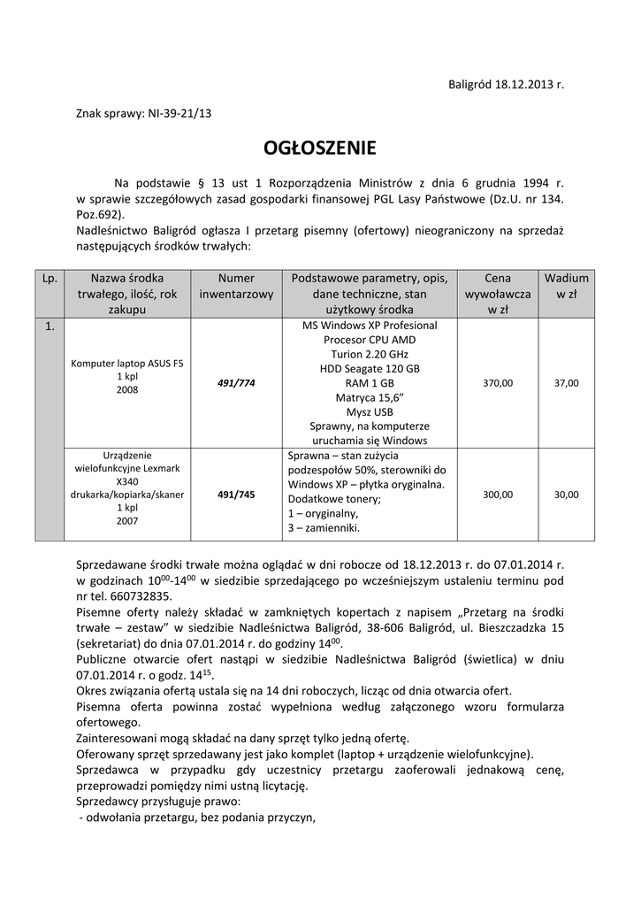 Baligród 18.12.2013 r. Znak sprawy: NI-39-21/13 OGŁOSZENIE Na podstawie § 13 ust 1 Rozporządzenia Ministrów z dnia 6 grudnia 1994 r. w sprawie szczegółowych zasad gospodarki finansowej PGL Lasy Państwowe (Dz.U. nr 134. Poz.692). Nadleśnictwo Baligród ogłasza I przetarg pisemny (ofertowy) nieograniczony na sprzedaż następujących środków trwałych: Lp. Nazwa środka trwałego, ilość, rok zakupu Numer inwentarzowy 1. Komputer laptop ASUS F5 1 kpl 2008 Urządzenie wielofunkcyjne Lexmark X340 drukarka/kopiarka/skaner 1 kpl 2007 491/774 491/745 Podstawowe parametry, opis, dane techniczne, stan użytkowy środka MS Windows XP Profesional Procesor CPU AMD Turion 2.20 GHz HDD Seagate 120 GB RAM 1 GB Matryca 15,6” Mysz USB Sprawny, na komputerze uruchamia się Windows Sprawna – stan zużycia podzespołów 50%, sterowniki do Windows XP – płytka oryginalna. Dodatkowe tonery; 1 – oryginalny, 3 – zamienniki. Cena wywoławcza w zł Wadium w zł 370,00 37,00 300,00 30,00 Sprzedawane środki trwałe można oglądać w dni robocze od 18.12.2013 r. do 07.01.2014 r. w godzinach 1000-1400 w siedzibie sprzedającego po wcześniejszym ustaleniu terminu pod nr tel. 660732835. Pisemne oferty należy składać w zamkniętych kopertach z napisem „Przetarg na środki trwałe – zestaw” w siedzibie Nadleśnictwa Baligród, 38-606 Baligród, ul. Bieszczadzka 15 (sekretariat) do dnia 07.01.2014 r. do godziny 1400. Publiczne otwarcie ofert nastąpi w siedzibie Nadleśnictwa Baligród (świetlica) w dniu 07.01.2014 r. o godz. 1415. Okres związania ofertą ustala się na 14 dni roboczych, licząc od dnia otwarcia ofert. Pisemna oferta powinna zostać wypełniona według załączonego wzoru formularza ofertowego. Zainteresowani mogą składać na dany sprzęt tylko jedną ofertę. Oferowany sprzęt sprzedawany jest jako komplet (laptop + urządzenie wielofunkcyjne). Sprzedawca w przypadku gdy uczestnicy przetargu zaoferowali jednakową cenę, przeprowadzi pomiędzy nimi ustną licytację. Sprzedawcy przysługuje prawo: - odwołania przetargu, bez podania przyczyn, - zamknięcia przetargu bez wyboru którejkolwiek z ofert. Warunkiem udziału w postępowaniu jest wpłata wadium w wysokości 10% ceny wywoławczej. Wadium należy wpłacić gotówką do kasy Nadleśnictwa Baligród, lub przelewem na konto Nadleśnictwa Baligród: Bank Gospodarki Żywnościowej – Lesko : Nr 27 2030 0045 1110 0000 0077 8820 najpóźniej w dniu przetargu do godziny 1000. Wadium oferenta, którego oferta zostanie przyjęta zostanie zaliczone na poczet ceny nabycia środka trwałego. Wadium przepada na rzecz sprzedawcy, jeżeli oferent, którego oferta została przyjęta uchyli się od zapłaty ceny sprzedaży w terminie 5 dni od daty zawiadomienia o rozstrzygnięciu przetargu. Warunkiem ważności postępowania i wyboru oferenta przez komisję przetargową jest zatwierdzenie protokołu przez Nadleśniczego Nadleśnictwa Baligród. Oferentom nie przysługuje prawo domagania się zwrotu kosztów poniesionych na przygotowanie oferty, oraz kosztów uczestnictwa w postępowaniu przetargowym. Przedmiot przetargu zostanie wydany po podpisaniu umowy sprzedaży zbywanego środka trwałego i zapłaceniu przez nabywcę 100% zaoferowanej ceny nabycia. Załączniki: - formularz ofertowy. Otrzymują: 1. Tablica ogłoszeń w siedzibie Nadleśnictwa Baligród. 2. Strona internetowa Nadleśnictwa Baligród. Oryginał podpisał Nadleśniczy Nadleśnictwa Baligród mgr inż. Wojciech Głuszko