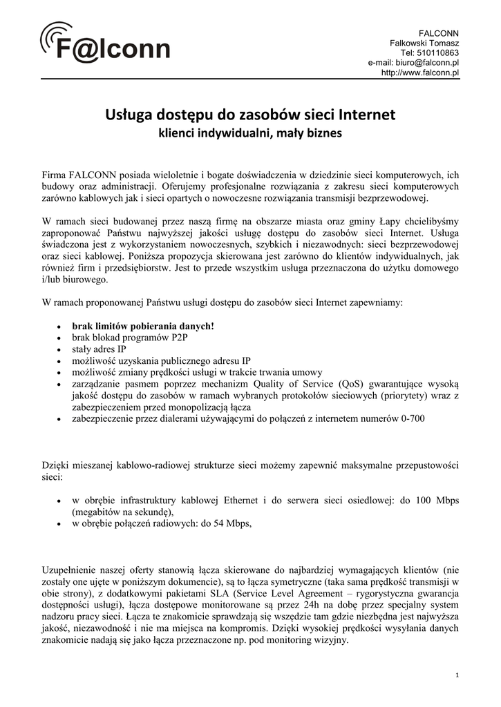 FALCONN Falkowski Tomasz Tel: 510110863 e-mail: [email protected] http://www.falconn.pl Usługa dostępu do zasobów sieci Internet klienci indywidualni, mały biznes Firma FALCONN posiada wieloletnie i bogate doświadczenia w dziedzinie sieci komputerowych, ich budowy oraz administracji. Oferujemy profesjonalne rozwiązania z zakresu sieci komputerowych zarówno kablowych jak i sieci opartych o nowoczesne rozwiązania transmisji bezprzewodowej. W ramach sieci budowanej przez naszą firmę na obszarze miasta oraz gminy Łapy chcielibyśmy zaproponować Państwu najwyższej jakości usługę dostępu do zasobów sieci Internet. Usługa świadczona jest z wykorzystaniem nowoczesnych, szybkich i niezawodnych: sieci bezprzewodowej oraz sieci kablowej. Poniższa propozycja skierowana jest zarówno do klientów indywidualnych, jak również firm i przedsiębiorstw. Jest to przede wszystkim usługa przeznaczona do użytku domowego i/lub biurowego. W ramach proponowanej Państwu usługi dostępu do zasobów sieci Internet zapewniamy: brak limitów pobierania danych! brak blokad programów P2P stały adres IP możliwość uzyskania publicznego adresu IP możliwość zmiany prędkości usługi w trakcie trwania umowy zarządzanie pasmem poprzez mechanizm Quality of Service (QoS) gwarantujące wysoką jakość dostępu do zasobów w ramach wybranych protokołów sieciowych (priorytety) wraz z zabezpieczeniem przed monopolizacją łącza zabezpieczenie przez dialerami używającymi do połączeń z internetem numerów 0-700 Dzięki mieszanej kablowo-radiowej strukturze sieci możemy zapewnić maksymalne przepustowości sieci: w obrębie infrastruktury kablowej Ethernet i do serwera sieci osiedlowej: do 100 Mbps (megabitów na sekundę), w obrębie połączeń radiowych: do 54 Mbps, Uzupełnienie naszej oferty stanowią łącza skierowane do najbardziej wymagających klientów (nie zostały one ujęte w poniższym dokumencie), są to łącza symetryczne (taka sama prędkość transmisji w obie strony), z dodatkowymi pakietami SLA (Service Level Agreement – rygorystyczna gwarancja dostępności usługi), łącza dostępowe monitorowane są przez 24h na dobę przez specjalny system nadzoru pracy sieci. Łącza te znakomicie sprawdzają się wszędzie tam gdzie niezbędna jest najwyższa jakość, niezawodność i nie ma miejsca na kompromis. Dzięki wysokiej prędkości wysyłania danych znakomicie nadają się jako łącza przeznaczone np. pod monitoring wizyjny. 1 FALCONN Falkowski Tomasz Tel: 510110863 e-mail: [email protected] http://www.falconn.pl Cennik usług dostępu do zasobów sieci Internet klienci indywidualni, mały biznes Opcja Usługi Opłaty abonamentowe (z VAT) szybkość transmisji okres trwania umowa do komputera od komputera 12 miesięcy 24 miesiące 36 miesięcy do 1 Mbps do 512 kbps 45 zł 39 zł 35 zł do 2 Mbps do 640 kbps 59 zł 49 zł 45 zł do 4 Mbps* do 640 kbps 65 zł 55 zł 49 zł do 8 Mbps* do 640 kbps 75 zł 65 zł 59 zł Opłata aktywacyjna dla wszystkich powyższych opcji usługi wynosi 150zł brutto. * Dostępność usługi ograniczona terytorialnie i pod warunkiem istnienia warunków technicznych. Cennik usług dostępu do zasobów sieci Internet pakiet z telefonem** klienci indywidualni, mały biznes Opcja Usługi Opłaty abonamentowe (z VAT) szybkość transmisji okres trwania umowa do komputera od komputera 12 miesięcy 24 miesiące 36 miesięcy do 1 Mbps do 512 kbps 35 zł 29 zł 25 zł do 2 Mbps do 640 kbps 49 zł 39 zł 35 zł do 4 Mbps* do 640 kbps 55 zł 45 zł 39 zł do 8 Mbps* do 640 kbps 65 zł 55 zł 49 zł Opłata aktywacyjna dla pakietu Internet + telefon wynosi od 300zł brutto. * Dostępność usługi ograniczona terytorialnie i pod warunkiem istnienia warunków technicznych. ** Oferta promocyjna obowiązuje wyłącznie z abonamentami telefonicznymi Komfort i Premium. 2 FALCONN Falkowski Tomasz Tel: 510110863 e-mail: [email protected] http://www.falconn.pl TELEFON klienci indywidualni Usługa jest dostępna dla wszystkich abonentów usługi dostępu do internetu w sieci FALCONN. Jako jedyni z nielicznych oferujemy możliwość przenoszenia numerów z Telekomunikacji Polskiej, dzięki czemu nasi klienci w znaczący sposób mogą obniżyć miesięczne koszty abonamentu telefonicznego (abonament z przeniesionym numerem z TPSA już od 0 zł!). Korzyści płynące z korzystania z telefonii cyfrowej FALCONN: przekierowanie połączeń połączenia oczekujące Voice2Email – wiadomości nagrane na Twojej poczcie głosowej wysyłane są na Twoje konto e-mail przekazywanie połączeń prezentacja numeru dzwoniącego możliwość blokowania połączeń na wybrane numery możliwość blokowania prezentacji własnego numeru dowolna liczba linii telefonicznych (własny numer dla dzieci, rodziców itp.) Skrócony cennik znajduje się poniżej. Podane ceny są cenami brutto (zawierają 23% podatek VAT). Socjalny Podstawowy Komfort Premium 0,00 zł 19,00 zł 29,00 zł 49,00 zł 0 60 160 400 Połączenia wewnątrz sieci FALCONN 0,00 zł 0,00 zł 0,00 zł 0,00 zł Połączenia lokalne i międzymiastowe 0,12 zł 0,09 zł 0,07 zł 0,07 zł Połączenia na komórki 0,56 zł 0,52 zł 0,50 zł 0,48 zł Połączenia na komórki (Play, Polsat Cyfrowy) 1,10 zł 1,06 zł 1,01 zł 0,98 zł NOL 0,15 zł 0,11 zł 0,10 zł 0,10 zł Połączenia do Anglii* 0,15 zł 0,11 zł 0,10 zł 0,09 zł Połączenia do Irlandii* 0,15 zł 0,11 zł 0,10 zł 0,09 zł Połączenie do Niemiec* 0,20 zł 0,13 zł 0,12 zł 0,11 zł Połączenia do USA* 0,17 zł 0,16 zł 0,15 zł 0,13 zł Połączenia do Kanady* 0,11 zł 0,09 zł 0,07 zł 0,06 zł Abonament Liczba minut w abonamencie * W związku z obecnością wielu operatorów w tych krajach są to ceny najniższe. Ceny zależne od operatorów dostępne są w pełnej wersji cennika. Opłata aktywacyjna dla usługi Telefon wynosi od 150zł brutto. 3 FALCONN Falkowski Tomasz Tel: 510110863 e-mail: [email protected] http://www.falconn.pl TELEFON bizne