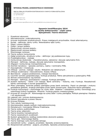 Egzamin kwalifikacyjny 2016 na studia doktoranckie - część ustna Specjalność: Teoria ekonomii 1. Przedmiot ekonomii. 2. Mikroekonomia i makroekonomia. 3. Krzywa możliwości produkcyjnych. Prawo malejących przychodów. Koszt alternatywny. 4. Rynek - definicja, cechy rynku. Niewidzialna ręka rynku. 5. Popyt i prawo popytu. 6. Podaż i prawo podaży. 7. Elastyczność cenowa popytu . 8. Elastyczność cenowa podaży. 9. Równowaga rynkowa. 10. Teoria wyboru konsumenta 11. Gałąź przemysłu, struktura rynku - definicja i jej podstawowe typy. 12. Przedsiębiorstwa - rodzaje 13. Konkurencja doskonała - charakterystyka, założenia i decyzje optymalne firm. 14. Monopol - definicja, rodzaje, decyzje optymalne monopolisty. 15. Oligopol i konkurencja monopolistyczna. 16. Dochód narodowy - sposoby pomiaru, realny i nominalny PKB, 17. Oszczędności i inwestycje. 18. Inflacja - pomiar, rodzaje i skutki. Wskaźnik cen detalicznych . 19. Inflacja oczekiwana i nieoczekiwana. Koszty inflacji. 20. Bezrobocie - pojęcia podstawowe, rodzaje bezrobocie. 21. Czynniki wzrostu gospodarczego, funkcja produkcji. Pełne zatrudnienie a potencjalny PKB. 22. Wzrost zrównoważony wg Solowa 23. Pieniądz - definicja, pochodzenie i rodzaje. Funkcje pieniądza. 24. System bankowy - banki i ich rodzaje. Bank centralny - historia, rola i funkcje. Niezależność banku centralnego a wzrost gospodarczy. 25. Miary pieniądza, kontrola podaży pieniądza przez bank centralny. Popyt na pieniądz i motywy posiadania gotówki. Kreacja pieniądza przez banki komercyjne. Ilościowa teoria pieniądza. 26. Funkcja konsumpcji i równowaga na rynku dóbr. Stabilne i niestabilne punkty równowagi przy nieliniowej funkcji wydatków. Mnożnik. Funkcja popytu inwestycyjnego. 27. Krzywa IS i krzywa LM . Równowaga na rynku dóbr i rynku pieniądza. Polityki pieniężna i fiskalna i ich skuteczność. 28. Lepkość cen i proces dostosowawczy. 29. Poziom bezrobocia a prawo Okuna. 30. Krzywa Philipsa. 31. Tezy szkoły neoklasycznej. 32. Keynesowskie zasady polityki makroekonomicznej. 33. Monetaryzm i koncepcje Miltona Friedmana. 34. Teoria wyboru publicznego. 35. Teoria praw własności. 36. Teoria kosztów transakcyjnych. 37. Teoria racjonalnych oczekiwań. 38. System gospodarczy według zwolenników ekonomii podaży. 39. Teoria gier. Równowaga Nasha. 40. Teoria realnego cyklu koniunkturalnego. 41. Zawodność rynku - pojęcie, przykłady. Sposoby przezwyciężania. 42. Niesprawność państwa - pojęcie, przykłady. Sposoby przezwyciężania. 43. Teoria kosztów komparatywnych 44. Zasady podejmowania decyzji w przedsiębiorstwie. 45. Instrumenty rynku kapitałowego-akcje, obligacje, listy zastawne, kontrakty terminowe, opcje. 46. Ograniczenie budżetowe i linia budżetowa. 47. Przesłanki monopolizacji produkcji. Narzędzia polityki antymonopolowej. 48. Rodzaje przedsiębiorstw monopolistycznych. 49. Miary koncentracji produkcji. 50. Ubezpieczenia gospodarcze - definicja, rodzaje, funkcje. 51. Równowaga na rynku pracy. Czynniki kształtujące popyt i podaż na rynku pracy. 52. Własność intelektualna - pojęcie, naruszenie, ochrona. 53. Cykl koniunkturalny - pojęcie, rodzaje. Przebieg we współczesnej gospodarce. 54. Przyczyny kryzysów gospodarczych w ujęciu 3 wybranych teorii. 55. Polityka fiskalna i jej narzędzia. 56. Automatyczne stabilizatory koniunktury - pojęcie, rodzaje, ocena skuteczności. 57. Budżet państwa - pojęcie, struktura, funkcje. 58. Mnożnik wydatków państwa. Twierdzenie Haavelmoo. 59. Inwestycje publiczne a prywatne. Wypychanie inwestycji. 60. Wpływ zmiany podaży pieniądza na poziom PKB i inflację. 61. Teorie wzrostu endogenicznego. 62. Klasyczne i neoklasyczne teorie handlu międzynarodowego. 63. Pieniądz światowy. 64. Teorie kursów walutowych. 65. Instrumenty finansowe na rynku międzynarodowym - rodzaje, wycena. 66. System z Bretton Woods. Współczesny system walutowy. 67. Narzędzia interwencjonizmu państwowego. 68. Podatki i rodzaje podatków. Funkcje podatków w gospodarce 69. Bilans - pojęcie, struktura. Znaczenie dla decyzji przedsiębiorstwa. 70. Spółka z ograniczoną odpowiedzialnością. 71. Amortyzacja - pojęcie, rodzaje. 72. Koszty przedsiębiorstwa i ich rodzaje. 73. Zewnętrzne źródła finansowania przedsiębiorstwa. 74. Tradycyjne i nowe instrumenty rynku kapitałowego. 75. Przedsiębiorstwo indywidualne. 76. Nadzór nad sektorem bankowym, giełdowym i ubezpieczeniowym. 77. Merkantylizm w Europie Zachodniej i w Polsce 78. Gospodarka w koncepcjach fizjokratów 79. System Gospodarczy w teorii Adama Smitha 80. Koncepcja homo oeconomicusa 81. Szkoła psychologiczna - subiektywna teoria wartości, analiza marginalistyczna 82. Teoria równowagi ogólnej Leona Walrasa 83. Pojecie integracji regionalnej i globalizacji 84. Inwestorzy na rynku kapitałowym. Fundusze inwestycyjne i emerytalne. 85. Organizacja rynku pierwotnego i wtórnego papierów wartościowych. 86. Metoda dedukcyjna i indukcyjna 87. Spółka akcyjna. 88. Korporacje transnarodowe. 89. Znaczenie bezpośrednich inwestycji zagranicznych w gospodarce 90. Ilościowa teoria pieniądza. 91. Polityka deflacyjna. 92. Hipoteza konwergencji. 93. Consensus waszyngtoński. 94. Ekonomiczne funkcje państwa 95. Polityka stymulowania wzrostu gospodarczego. 96. Ekonomia instytucjonalna. 97. Unia celna a strefa wolnego handlu. 98. Europejska integracja walutowa. 99. Wspólna Polityka Rolna Unii Europejskiej- instrumenty, ocena. 100. Polityka regionalna i Fundusze strukturalne UE