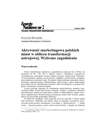 Krzysztof Borodako Akademia Ekonomiczna w Krakowie Aktywność marketingowa polskich miast w obliczu transformacji ustrojowej. Wybrane zagadnienia Wprowadzenie Proces transformacji ustrojowej i gospodarczej rozpoczął się w Polsce na przełomie lat 80. i 90. XX w. Oprócz zmian o charakterze systemowym i gospodarczym zachodziły również zmiany procesów społecznych. Wielotorowe przeobrażenia polskiej rzeczywistości pogłębiły zróżnicowanie pomiędzy poszczególnymi częściami kraju. Posiadanie odpowiedniego potencjału (ekonomicznego, organizacyjnego, intelektualnego, kulturowego, a także społecznego) przyczyniło się do wykształcenia obszarów silnie rozwiniętych, na jednym biegunie i zacofanych, na przeciwległym. Liczne zjawiska wpłynęły na niejednolite przekształcenie struktury przestrzennej Polski. Wśród nich można wymienić: zmiany w strukturze własności (prywatyzacja), zmiany na rynku pracy, zmiany w infrastrukturze, napływ inwestycji zagranicznych. Konsekwencją powyższych zmian było otwarcie gospodarcze oraz powstanie gospodarki rynkowej1. W latach 90. ubiegłego wieku pojawiło się nowe zjawisko w Polsce jakim było bezrobocie. Wpłynęło ono bardzo silnie na migrację wewnętrzną, motywowaną koniecznością zatrudnienia, wywołując w społeczeństwie z jednej strony aktywną postawę wobec nowej rzeczywistości, z drugiej zaś depresję 1 A. Harańczyk, Miasta Polski w procesie globalizacji gospodarki, Wydawnictwo Naukowe PWN, Warszawa 1998, s. 57. 350 Krzysztof Borodako i przygnębienie powodowane brakiem przystosowania do trudnej sytuacji. Bardzo negatywne skutki braku miejsc pracy można było zauważyć w tych regionach, w których dominowały wówczas nierentowne sektory, takie jak przemysł lekki czy rolnictwo. Nisko wydajne gospodarstwa, w szczególności PGR-y (Państwowe Gospodarstwa Rolne), były przeważnie stabilnym miejscem pracy niewymagającym wysokich kwalifikacji oraz zastosowania zaawansowanych technik produkcji. Procesy zachodzące w gospodarce i społeczeństwie stały się przyczyną kształtowania się nowej formy funkcjonowania miast i regionów. Władze regionalne (na poziomie wojewódzkim), jak również lokalne (na szczeblu powiatowym i gminnym) równolegle z budowaniem gospodarki kapitalistycznej przejmowały coraz to nowe i szersze obowiązki związane z działaniem na właściwym szczeblu. Z czasem samorząd lokalny miał bardzo rozległą odpowiedzialność publicznoprawną, a także majątek i szerokie kompetencje w bardzo wielu obszarach życia zbiorowego2. Razem z przejęciem dodatkowych zadań urzędy wyposażano w odpowiednie narzędzia, zarówno prawne, jak i finansowe. Okres transformacji systemowej wpłynął również na zmianę paradygmatu w zarządzaniu gminą. Administracja gminna i miejska zaczęła spoglądać na społeczność lokalną przez pryzmat jej potrzeb3. Urzędy lokalne, nie mając doświadczenia w samodzielnym rządzeniu, zostawały włączone w programy, których celem było przyspieszenie zniwelowania różnic między funkcjonowaniem urzędu w Polsce i w krajach Europy Zachodniej. Jednym z bardzo wielu zrealizowanych programów był „Program Rozwoju Instytucjonalnego” (PRI), który jako część szerszego programu rządowego – miał być odpowiedzią na zapotrzebowanie społeczne w kwestii budowania sprawnej i efektywnej administracji samorządowej 4. Tylko taka administracja mogła być motorem rozwoju obszarów, które najbardziej potrzebowały wsparcia. Poprzez ten program miały one nabyć umiejętność budowania odpowiednich struktur organizacyjnych, właściwych procedur postępowania, mechanizmów skłaniających ludność lokalną do większego zaangażowania oraz wykształcić kompetentnych i odpowiedzialnych urzędników. Dzięki temu programowi zwrócono szczególną uwagę wszystkich uczestników życia publicznego na nowoczesne reguły zarządzania instytucjami publicznymi oraz koncepcje współudziału mieszkańców w zarządzaniu sprawami publicznymi. 2 Diagnoza stanu terytorialnej administracji publicznej w Polsce, „Samorząd Terytorialny” 2004, nr 1–2, s. 21 i 22. 3 B. Gajdzik, Orientacja marketingowa gminy, „Marketing i Rynek” 1998, nr 2, s. 14. 4 Program Rozwoju Instytucjonalnego. Analiza instytucjonalna urzędu gminy, Małopolska Szkoła Administracji Publicznej Akademii Ekonomicznej w Krakowie, Kraków 2003, s. 7. Aktywność marketingowa polskich miast... 351 1. Miasto jako megaprodukt W momencie, kiedy samorządy lokalne i regionalne przejęły dużą część swobody decydowania o rozwoju swojego obszaru i jego przyszłości, pojawiła się jednocześnie potrzeba nowego zarządzania i orientacji na niewykorzystany do tej pory potencjał. Rządzący miastami zauważyli, że stoją przed podobnymi problemami związanymi z poprawą kondycji gospodarczej jednostek samorządu terytorialnego. W dużej części napotkane problemy są rozwiązywalne po wykonaniu określonych działań, procedur oraz uzyskaniu pewnych zasobów. Mimo że jednostki terytorialne dysponują już własnymi zasobami, tj. finansowymi, ludzkimi, organizacyjnymi, to wciąż zabiegają o nowe. Z uwagi na fakt, że zasoby te są ograniczone, powstaje naturalna potrzeba konkurowania o nie. Rywalizacja między jednostkami na poziomie lokalnym (ale także w skali regionalnej) związana jest z powstaniem mechanizmów rynkowych i samego rynku. Z istoty rynku wynika fakt, że muszą znajdować się na nim sprzedający, kupujący oraz określony produkt. W początkowych analizach za produkt postrzegano jedynie przedmiot materialny, potem pod tym pojęciem zaczęły funkcjonować również usługi. Na rynku miast mamy do czynienia z jeszcze bardziej skomplikowanym produktem. Znajdująca się na rynku oferta specyficznych dla miasta kategorii powoduje, że można dokonać segmentacji rynku według oferowanych produktów w różnych grupach, np.: usługi, nieruchomości, przestrzeń miejska, k