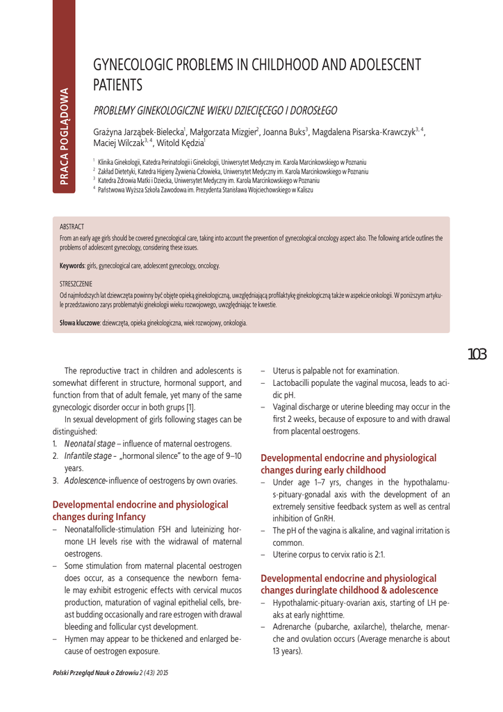 PRACA POGLĄDOWA GYNECOLOGIC PROBLEMS IN CHILDHOOD AND ADOLESCENT PATIENTS PROBLEMY GINEKOLOGICZNE WIEKU DZIECIĘCEGO I DOROSŁEGO Grażyna Jarząbek-Bielecka1, Małgorzata Mizgier2, Joanna Buks3, Magdalena Pisarska-Krawczyk3, 4, Maciej Wilczak3, 4, Witold Kędzia1 1 2 3 4 Klinika Ginekologii, Katedra Perinatologii i Ginekologii, Uniwersytet Medyczny im. Karola Marcinkowskiego w Poznaniu Zakład Dietetyki, Katedra Higieny Żywienia Człowieka, Uniwersytet Medyczny im. Karola Marcinkowskiego w Poznaniu Katedra Zdrowia Matki i Dziecka, Uniwersytet Medyczny im. Karola Marcinkowskiego w Poznaniu Państwowa Wyższa Szkoła Zawodowa im. Prezydenta Stanisława Wojciechowskiego w Kaliszu ABSTRACT From an early age girls should be covered gynecological care, taking into account the prevention of gynecological oncology aspect also. The following article outlines the problems of adolescent gynecology, considering these issues. Keywords: girls, gynecological care, adolescent gynecology, oncology. STRESZCZENIE Od najmłodszych lat dziewczęta powinny być objęte opieką ginekologiczną, uwzględniającą profilaktykę ginekologiczną także w aspekcie onkologii. W poniższym artykule przedstawiono zarys problematyki ginekologii wieku rozwojowego, uwzględniając te kwestie. Słowa kluczowe: dziewczęta, opieka ginekologiczna, wiek rozwojowy, onkologia. 103 The reproductive tract in children and adolescents is somewhat different in structure, hormonal support, and function from that of adult female, yet many of the same gynecologic disorder occur in both grups [1]. In sexual development of girls following stages can be distinguished: 1. Neonatal stage – influence of maternal oestrogens. 2. Infantile stage – „hormonal silence” to the age of 9–10 years. 3. Adolescence-influence of oestrogens by own ovaries. Developmental endocrine and physiological changes during Infancy – Neonatalfollicle-stimulation FSH and luteinizing hormone LH levels rise with the widrawal of maternal oestrogens. – Some stimulation from maternal placental oestrogen does occur, as a consequence the newborn female may exhibit estrogenic effects with cervical mucos production, maturation of vaginal epithelial cells, breast budding occasionally and rare estrogen with drawal bleeding and follicular cyst development. – Hymen may appear to be thickened and enlarged because of oestrogen exposure. Polski Przegląd Nauk o Zdrowiu 2 (43) 2015 – Uterus is palpable not for examination. – Lactobacilli populate the vaginal mucosa, leads to acidic pH. – Vaginal discharge or uterine bleeding may occur in the first 2 weeks, because of exposure to and with drawal from placental oestrogens. Developmental endocrine and physiological changes during early childhood – Under age 1–7 yrs, changes in the hypothalamus-pituary-gonadal axis with the development of an extremely sensitive feedback system as well as central inhibition of GnRH. – The pH of the vagina is alkaline, and vaginal irritation is common. – Uterine corpus to cervix ratio is 2:1. Developmental endocrine and physiological changes duringlate childhood & adolescence – Hypothalamic-pituary-ovarian axis, starting of LH peaks at early nighttime. – Adrenarche (pubarche, axilarche), thelarche, menarche and ovulation occurs (Average menarche is about 13 years). Puberty is the period of transition between childhood and adulthood, a time of accelereted growth, sexual maturation, and profound psychological changes [1–3]. Menarche – The median age of menarche is 12.8 years, and the normal menstrual cycle is 21 to 35 days in length. Bleeding normally lasts for 3 to 7 days and consists of 30 to 40 ml of blood. Cycles are abnormal if they are longer than 8 to 10 days or if more than 80 ml of blood loss occurs. Soaking more than 25 pads or 30 tampons during a menstrual period is abnormal. Menstrual cycles – Regular ovulatory menstrual cycles often do not develop until 1 to 1.5 years after menarche, and 55–82% of cycles are anovulatory for the first 2 years after menarche. Anovulatory cycles typically cause heavier and longer bleeding. – Adolescents frequently experience irregular menstrual bleeding patterns, which can include several consecutive months of amenorrhea. 104 The normal menstrual cycle – During the follicular phase, release of gonadotropinreleasing hormone (GnRH) from the hypothalamus stimulates the pituitary to secrete luteinizing hormone (LH) and follicle-stimulating hormone (FSH), which then stimulate ovarian estrogen secretion, which induces endometrial proliferation. – Ovulation occurs 12 hours after the midcycle surge in LH. The normal menstrual cycle – Ovulation occurs 12 hours after the midcycle surge in LH. – The luteal phase follows ovulation, and the corpus luteum secretes progesterone and estrogen. Progesterone inhibits endometrial proliferation and induces glandular changes. Without fertilization, progesterone and estradiol levels decrease, and sloughing of the endometrium occurs 14 days after ovulation. Amenorrhea – Primary amenorrhea is defined as the absence of menarche by age 16. Puberty is considered delayed and warrants evaluation if breast development (the initial sign of puberty in girls) does not begin by the age of 13. The mean time between the onset of breast development and menarche is 2 years. Absence of menses Polski Przegląd Nauk o Zdrowiu 2 (43) 2015 within 2 to 2.5 years of the onset of puberty should be evaluated. – Secondary amenorrhea is defined as the absence of 3 consecutive menstrual cycles or 6 months of amenorrhea in patients who have already established regular menstrual periods [1, 3]. Precious puberty Early sexual maturation prior to age 8 in girls and age 9 in boys there are two types: – isosexual praecocity-characteristic are appropriate for the child’s genetic and gonadal sex – heterosexual preciocity-sexual characteristic inappropriate for the genetic sex (feminizing syndrome in boys or vi