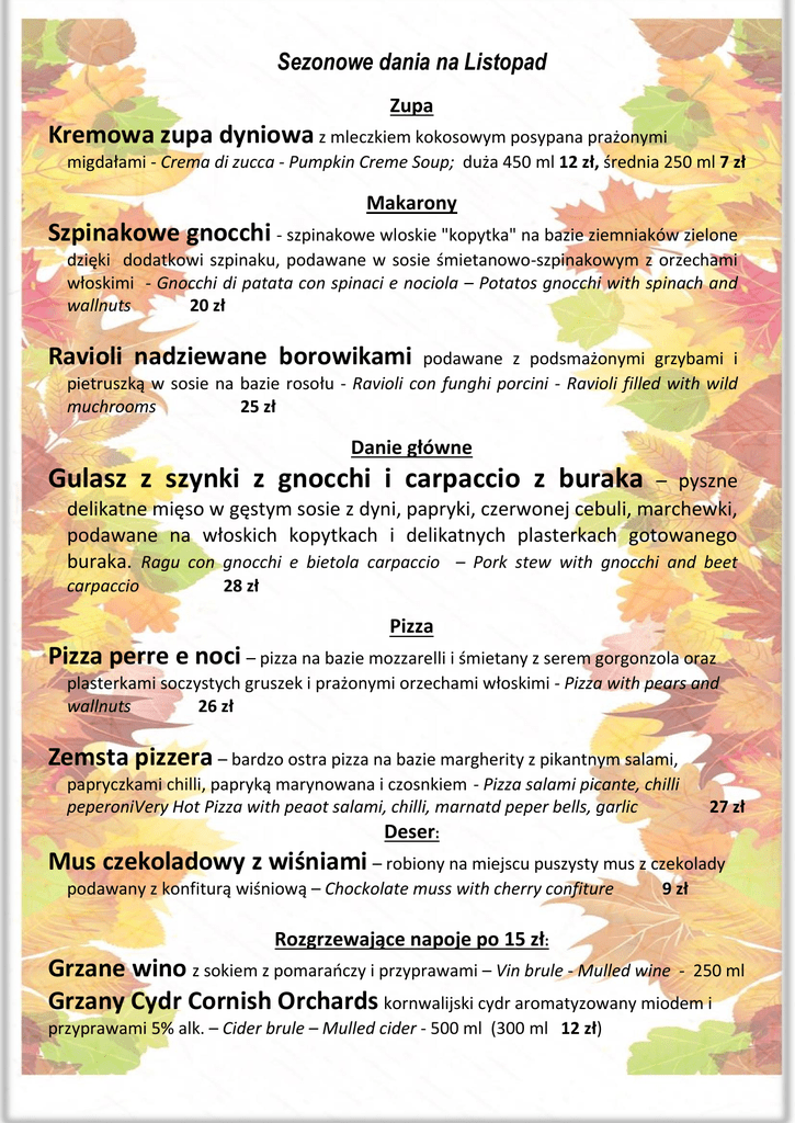 Sezonowe dania na Listopad Zupa Kremowa zupa dyniowa z mleczkiem kokosowym posypana prażonymi migdałami - Crema di zucca - Pumpkin Creme Soup; duża 450 ml 12 zł, średnia 250 ml 7 zł Makarony Szpinakowe gnocchi - szpinakowe wloskie "kopytka" na bazie ziemniaków zielone dzięki dodatkowi szpinaku, podawane w sosie śmietanowo-szpinakowym z orzechami włoskimi - Gnocchi di patata con spinaci e nociola – Potatos gnocchi with spinach and wallnuts 20 zł Ravioli nadziewane borowikami podawane z podsmażonymi grzybami i pietruszką w sosie na bazie rosołu - Ravioli con funghi porcini - Ravioli filled with wild muchrooms 25 zł Danie główne Gulasz z szynki z gnocchi i carpaccio z buraka – pyszne delikatne mięso w gęstym sosie z dyni, papryki, czerwonej cebuli, marchewki, podawane na włoskich kopytkach i delikatnych plasterkach gotowanego buraka. Ragu con gnocchi e bietola carpaccio – Pork stew with gnocchi and beet carpaccio 28 zł Pizza Pizza perre e noci – pizza na bazie mozzarelli i śmietany z serem gorgonzola oraz plasterkami soczystych gruszek i prażonymi orzechami włoskimi - Pizza with pears and wallnuts 26 zł Zemsta pizzera – bardzo ostra pizza na bazie margherity z pikantnym salami, papryczkami chilli, papryką marynowana i czosnkiem - Pizza salami picante, chilli peperoniVery Hot Pizza with peaot salami, chilli, marnatd peper bells, garlic 27 zł Deser: Mus czekoladowy z wiśniami – robiony na miejscu puszysty mus z czekolady podawany z konfiturą wiśniową – Chockolate muss with cherry confiture 9 zł Rozgrzewające napoje po 15 zł: Grzane wino z sokiem z pomarańczy i przyprawami – Vin brule - Mulled wine - 250 ml Grzany Cydr Cornish Orchards kornwalijski cydr aromatyzowany miodem i przyprawami 5% alk. – Cider brule – Mulled cider - 500 ml (300 ml 12 zł) KALENDARZ WYDARZEŃ LISTOPADA W TRAKCIE kontakt do klubu: tel. 505 84 74 24, [email protected] 7 listopada sobota godz. 11:00 11 listopada środa godz. 17:00-22:00 14 listopada sobota godz. 11:00 18 listopada środa godz. 19:30 19 listopada czwartek godz. 18:00-22:00 21 listopada sobota Uszyj własnego pluszaka w klubie. Warsztat szycia własnych kolorowych pluszaków z filcu i wełny. Każdy wyjdzie ze swoim przytulakiem:) Na zapisy. Warsztat od lat 6. Bilet 30zł Niepodległościowy wieczór z degustacją win w restauracji Restauracja przygotuje na wieczór niepodległości dania w barwach narodowych i specjalnych cenach. A do tego możliwość wzięcia udziału w degustacji włoskich win w jednorazowej cenie 19 zł. Lego Minionki - kreatywne budowanie w klubie W Trakcie. Kolejny warsztat ze szkołą Iwony Kallaman Lego Fun. Teraz budujemy śmieczne postacie filmowe MINIONKI. Bilet: w karnecie 25zł za 3 różne spotkania do stycznia, jednorazowo 30zł. Na zapisy. Szycie dla początkujących – ciepłe kominy w sam raz na chłodną i mokrą jesień. Warsztat dla dorosłych. Ok 2 h. Liczba miejsc ograniczona. Bilet 30zł Przyjdź z koleżanką – kawy latte gratis dla Was. Święto Wina w restauracji W Trakcie - Beaujolais Nouveau Restauracja świętuje świeżo wyprodukowane, tegoroczne francuskie wino beaujolais nouveau oraz nowe wina włoskie zapraszając do degustacji win w jednorazowej cenie 19 zł. Do wina sugerujemy zamówić deski wędlin i serów w atrakcyjnych cenach. Laboratorium zmysłów w klubie. godz. 11:00 Spróbujemy odnaleźć odpowiedź na pytanie jakie mamy zmysły i czy zawsze przekazują nam prawdziwe informacje? Poznamy też mapę smaków naszego języka i zasadę działania ludzkiego serca, którego model zabierzemy do domu. Na zapisy. Bilet w przedsprzedaży 25zł, w dniu warsztatu 30zł 28 listopada Spektakl teatralny Świat – przedstawienie dla najnajów, czyli sobota dzieci od 1 roku do 3 lat. Dwójka aktorów z wielką wrażliwością zaprosi swoich małych godz. 11:00 widzów (oraz ich opiekunów, oczywiście) do przyjrzenia się czterem krainom jak czterem stronom świata. Po oglądaniu przyjdzie czas na wspólną zabawę. Obowiązują wcześniejsze zapisy, koszt biletu dla dziecka 35 zł. Rodzic gratis. 29 listopada niedziela Andrzejki dla dzieci W Trakcie! godz. 17:30 29 listopada niedziela godz. 17:00-22:00 Wieczór zabaw z wróżbami, czarami i alchemicznymi eksperymentami przygotowany specjalnie dla dzieci od lat 5. Liczba miejsc ograniczona. Bilet 30zł. Adrzejkowy wieczór wróżb i niespodzianek w Restauracji Wywróż swoją przyszłość:) Każdy bezpłatnie będzie mógł polać wosk oraz wywróżyć co się mu wydarzy w przyszłym roku. Wszystkie rachunki od 60 zł w górę biorą udział w losowaniu kuponów na pizzę i inne dania. Gwarantujemy same miłe wróżby NOWE ZAJĘCIA W KLUBIE W TRAKCIE poniedziałki KARATE FUN dla przedszkolaków godz. 17:15 Zajęcia sportowe dla przedszkolaków. Jednorazowy wstęp 30zł. Wejścia w karnecie 22 – 24 zł. poniedziałki i czwartki HIP-HOP dla dzieci od lat 8 Dynamiczne nowoczesne tańce także w stylu Hi-Hop.