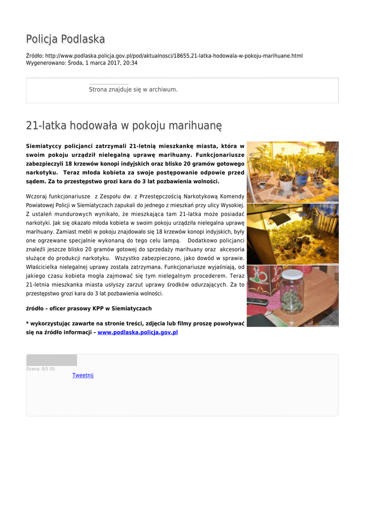 Policja Podlaska Źródło: http://www.podlaska.policja.gov.pl/pod/aktualnosci/18655,21-latka-hodowala-w-pokoju-marihuane.html Wygenerowano: Środa, 1 marca 2017, 20:34 Strona znajduje się w archiwum. 21-latka hodowała w pokoju marihuanę Siemiatyccy policjanci zatrzymali 21-letnią mieszkankę miasta, która w swoim pokoju urządził nielegalną uprawę marihuany. Funkcjonariusze zabezpieczyli 18 krzewów konopi indyjskich oraz blisko 20 gramów gotowego narkotyku. Teraz młoda kobieta za swoje postępowanie odpowie przed sądem. Za to przestępstwo grozi kara do 3 lat pozbawienia wolności. Wczoraj funkcjonariusze z Zespołu dw. z Przestępczością Narkotykową Komendy Powiatowej Policji w Siemiatyczach zapukali do jednego z mieszkań przy ulicy Wysokiej. Z ustaleń mundurowych wynikało, że mieszkająca tam 21-latka może posiadać narkotyki. Jak się okazało młoda kobieta w swoim pokoju urządziła nielegalna uprawę marihuany. Zamiast mebli w pokoju znajdowało się 18 krzewów konopi indyjskich, były one ogrzewane specjalnie wykonaną do tego celu lampą. Dodatkowo policjanci znaleźli jeszcze blisko 20 gramów gotowej do sprzedaży marihuany oraz akcesoria służące do produkcji narkotyku. Wszystko zabezpieczono, jako dowód w sprawie. Właścicielka nielegalnej uprawy została zatrzymana. Funkcjonariusze wyjaśniają, od jakiego czasu kobieta mogła zajmować się tym nielegalnym procederem. Teraz 21-letnia mieszkanka miasta usłyszy zarzut uprawy środków odurzających. Za to przestępstwo grozi kara do 3 lat pozbawienia wolności. źródło – oficer prasowy KPP w Siemiatyczach * wykorzystując zawarte na stronie treści, zdjęcia lub filmy proszę powoływać się na źródło informacji – www.podlaska.policja.gov.pl Ocena: 0/5 (0) Tweetnij