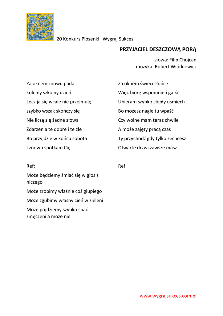 20 Konkurs Piosenki „Wygraj Sukces” PRZYJACIEL DESZCZOWĄ PORĄ słowa: Filip Chojcan muzyka: Robert Wiórkiewicz Za oknem znowu pada Za oknem świeci słońce kolejny szkolny dzień Więc biorę wspomnień garść Lecz ja się wcale nie przejmuję Ubieram szybko ciepły uśmiech szybko wszak skończy się Bo możesz nagle tu wpaść Nie liczą się żadne słowa Czy wolne mam teraz chwile Zdarzenia te dobre i te złe A może zajęty pracą czas Bo przyjdzie w końcu sobota Ty przychodź gdy tylko zechcesz I znowu spotkam Cię Otwarte drzwi zawsze masz Ref: Ref: Może będziemy śmiać się w głos z niczego Może zrobimy właśnie coś głupiego Może zgubimy własny cień w zieleni Może pójdziemy szybko spać zmęczeni a może nie www.wygrajsukces.com.pl