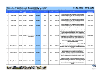 Samochody posłużbowe do sprzedaży w dniach 07.12.2016 - 09.12.2016 Zainteresowanych prosimy o kontakt z Działem Personalnym: tel: +48 735 991 901. Przy zgłoszeniach proszę podawać numer rejestracyjny samochodu. l.p. 1 2 3 4 5 6 7 model Caddy Combi Caddy Combi Caddy Combi Transporter T5 Caddy Combi IV Caddy Combi IV Caddy Combi IV silnik 2.0 TDI 2.0 TDI 2.0 TDI 2.0 TSI 2.0 TDI 2.0 TDI 2.0 TDI moc silnika 103 kW 103 kW 103 kW 150 kW 75 kW 110 kW 110 kW wersja Trendline Trendline Trendline Multivan Business DSG 4Motion Trendline Comfortline DSG Comfortline DSG nr rej. PO 6M981 PO 6M978 PO 6M980 PO 5J876 PO 3N384 PO 8M817 PO 1N797 kolor szary szary szary czarny czerwony czarny biały rocznik 2015 2015 2015 2015 2015 2015 2015 przebieg wyposażenie cena brutto dla klienta zewn. 20 167 km Czujniki parkowania -tył, klimatyzacja, system nawigacji satelitarnej RNS 315, szyby tylne przyciemniane, światła przeciwmgielne przednie, tempomat 72 468,00 zł 15 147 km Czujniki parkowania - tył, klimatyzacja, system nawigacji satelitarnej RNS 315, szyby tylne przyciemniane, światła przeciwmgielne przednie, tempomat 73 017,00 zł 26 134 km Czujniki parkowania - tył, klimatyzacja, system nawigacji satelitarnej RNS 315, szyby tylne przyciemniane, światła przeciwmgielne przednie, tempomat 71 736,00 zł 27 413 km Czujniki parkowania - przód/tył, dach regulowany mechanicznie, drzwi boczne lewe przesuwane, fotele przednie obracane, hak holowniczy demontowany, kamera cofania, ogrzewanie dodatkowe wodne z wyłącznikiem czasowym i pilotem, pakiet Chrom, pakiet Komfortowy, pakiet Side Assist, reflektory LED, spryskiwacze reflektorów, system nawigacji satelitarnej 510, szyba przednia ogrzewana, szyba z lewej strony środkowa przesuwana, szyba z prawej strony środkowa przesuwana, tapicerka foteli ze skóry Nappa, wykończenie wnętrza drewnem/skórą/specjalne 193 065,00 zł 16 350 km Czujniki parkowania - tył, klimatyzacja, pakiet "Light & Vision", system nawigacji satelitarnej Discover, szyba przednia ogrzewana, szyby tylne przyciemniane, światła przeciwmgielne przednie 71 919,00 zł 38 840 km Czujniki parkowania - tył, fotele przednie podgrzewane, kierownica wielofunkcyjna pokryta skórą, klimatyzacja Climatronic, ogrzewanie dodatkowe wodne z wyłącznikiem czasowym i pilotem, reflektory bi-ksenonowe, sensor deszczu, system nawigacji Discover, brak jednego kompletu kluczy 92 415,00 zł 29 000 km Czujniki parkowania - tył, fotele przednie podgrzewane, hak holowniczy, klimatyzacja Climatronic, ogrzewanie dodatkowe wodne z wyłącznikiem czasowym i pilotem, reflektory biksenonowe, sensor deszczu, system nawigacji satelitarnej Discover 94 977,00 zł 8 9 10 11 Caddy Combi IV Caddy Combi IV Caddy Combi IV Caddy Comi IV 2.0 TDI 2.0 TDI 2.0 TDI 2.0 TDI 75 kW 110 kW 110 kW 110 kW Trendline Comfortline DSG Comfortline DSG Highline DSG PO 3N382 PO 1N798 PO 3N379 PO 1N005 czerwony granatowy srebrny biały 2015 2015 2015 2015 27 879 km Czujniki parkowania - tył, klimatyzacja, pakiet "Light & Vision", system nawigacji satelitarnej Discover, szyba przednia ogrzewana, szyby tylne przyciemniane, światła przeciwmgielne przednie 70 638,00 zł 26 076 km Czujnik parkowania - tył/kamera, fotele przednie podgrzewane, klimatyzacja Climatronic, ogrzewanie dodatkowe wodne z wyłącznikiem czasowym i pilotem, reflektory bi-ksenonowe, sensor deszczu, system nawigacji satelitarnej Discover, szyba przednia ogrzewana 96 624,00 zł 60 483 km Czujniki parkowania - tył, fotele przednie podgrzewane, kierownica wielofunkcyjna pokryta skórą, klimatyzacja Climatronic, ogrzewanie dodatkowe wodne z wyłącznikiem czasowym i pilotem, reflektory bi-ksenonowe, sensor deszczu, system nawigacji satelitarnej Discover, brak książki serwisowej 88 663,50 zł 61 901 km Hak holowniczy, kamera cofania, ogrzewanie postojowe z wyłącznikiem czasowym, reflektory bi-ksenonowe, system nawigacji satelitarnej Discover Media, tarcze kół alum. 17'' "Canyon", brak książki serwisowej 92 140,50 zł 12 Caddy Combi IV 2.0 TDI 110 kW Highline PO 3N753 biały 2015 37 504 km 13 Caddy Combi IV 2.0 TDI 110 kW Highline DSG PO 1N799 biały 2015 35 620 km 14 Transporter T6 BiTDI 150 kW Caravelle Trendline DSG PO 2M437 szary 2015 27 317 km Hak holowniczy, ogrzewanie postojowe z wyłącznikiem czasowym, system nawigacji satelitarnej Discover Media, system Park Assist Kamera cofania, ogrzewanie postojowe z wyłącznikiem czasowym, reflektory bi-ksenonowe, system nawigacji satelitarnej Discover Media Czujniki parkowania - przód/tył, drzwi boczne lewe przesuwane, drzwi boczne przesuwane prawe sterowane elektrycznie, fotele przednie podgrzewane, hak holowniczy, kierownica wielofunkcyjna obszyta skórą, klimatyzacja Climatronic, ogrzewanie dodatkowe wodne z wyłącznikiem czasowym i pilotem, pakiet komfortowy, reflektory LED, rolety przeciwsłoneczne szyb bocznych w przedziale pasażerskim, spryskiwacze reflektorów, system nawigacji satelitarnej Discover Media, szyba przednia ogrzewana, światła przeciwmgielne przednie z doświetlaniem łuków, tarcze kół alum. 17'' "Davenport", tempomat, wycieraczka z czujnikiem deszczu + lusterko wewn. fotochrom., zamek centralny zdalnie sterowany 89 944,50 zł 95 251,50 zł 150 151,50 zł 15 16 17 18 19 20 Transporter T6 Caddy Combi Caddy Combi Caddy Combi Caddy Combi IV Caddy Combi IV BiTDI 2.0 TDI 2.0 TDI 2.0 TDI 2.0 TDI 2.0 TDI 150 kW 103 kW 103 kW 103 kW 110 kW 75 kW Caravelle Trendline DSG 4Motion Trendline DSG Trendline DSG Trendline Highline Highline DSG PO 8M805 PO 8L732 PO 8L837 PO 6M979 PO 2N984 PO 1N796 granatowy czerwony czerwony szary czarny ciemny fiolet Audio system Composition Colour, drzwi boczne lewe przesuwane, hak holowniczy, ogrzewanie dodatkowe z tyłu, pakiet elektryczny III, pakiet komfortowy, podłokietniki fotela kierowcy, reflektory LED, rolety przeciwsłoneczne szyb bocznych w przedziale pasażerskim, tarcze kół alum. 17'' Davenport, tempomat, wycieraczka z czujnikiem deszczu + lus