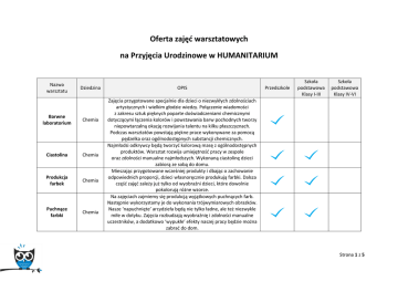 Oferta zajęć warsztatowych na Przyjęcia Urodzinowe w HUMANITARIUM Nazwa warsztatu Dziedzina Barwne laboratorium Chemia Ciastolina Chemia Produkcja farbek Chemia Puchnące farbki Chemia OPIS Przedszkole Szkoła podstawowa Klasy I-III Szkoła podstawowa Klasy IV-VI Zajęcia przygotowane specjalnie dla dzieci o niezwykłych zdolnościach artystycznych i wielkim głodzie wiedzy. Połączenie wiadomości z zakresu sztuk pięknych poparte doświadczeniami chemicznymi dotyczącymi łączenia kolorów i powstawania barw pochodnych tworzy niepowtarzalną okazję rozwijania talentu na kilku płaszczyznach. Podczas warsztatów powstają piękne prace wykonywane za pomocą pędzelka oraz ogólnodostępnych substancji chemicznych. Najmłodsi odkrywcy będą tworzyć kolorową masę z ogólnodostępnych produktów. Warsztat rozwija umiejętność pracy w zespole oraz zdolności manualne najmłodszych. Wykonaną ciastolinę dzieci zabiorą ze sobą do domu. Mieszając przygotowane wcześniej produkty i dbając o zachowanie odpowiednich proporcji, dzieci własnoręcznie produkują farbki. Dalsza część zajęć zależy już tylko od wyobraźni dzieci, które dowolnie pokolorują różne wzorce. Na zajęciach zajmiemy się produkcją wyjątkowych puchnących farb. Następnie wykorzystamy je do wykonania trójwymiarowych obrazków. Nasze ‘napuchnięte’ arcydzieła będą nie tylko ładne, ale też niezwykle miłe w dotyku. Zajęcia rozbudzają wyobraźnię i zdolności manualne uczestników, a dodatkowo ‘wypukłe’ efekty naszej pracy będzie można zabrać do dom. Strona 1 z 5 Nazwa warsztatu Dziedzina Szalona piana Chemia Wężowe laboratorium Chemia Wulkan Chemia + Geografia Kostki kąpielowe Chemia Napięte laboratorium Chemia + Fizyka OPIS Przedszkole Szkoła podstawowa Klasy I-III Szkoła podstawowa Klasy IV-VI Dzieci zmieniają się w małych naukowców. Przy pomocy szkła laboratoryjnego wytworzą kolorową pachnącą pianę. Ma ona niezwykłą właściwość – sama powiększa swoją objętość. Ponadto uczestnicy dowiedzą się czym się różni woda utleniona od tej zwykłej płynącej z kranu. Przy użyciu tajemniczej substancji oraz własnej wyobraźni uczestnicy będą konstruować spiralne stwory. Będzie to możliwe dzięki poznaniu sprytnego triku chemicznego oraz właściwości charakterystycznego związku chemicznego. Dla najmłodszych warsztat będzie zabawą rozwijającą sprawność manualną, a dla troszkę starszych – wstępem do prawdziwej chemii. Dzieci zapoznają się ze zjawiskiem wulkanu. Odkryją jak zbudowana jest Ziemia i czy lawa może być zimna. Dowiedzą się, które ze sławnych wulkanów są aktywne, a które uśpione i nie należy się ich obawiać. Następnie każdy uczestnik skonstruuje swój własny wulkan i spowoduje jego erupcję. W czasie pracy uczestnicy zajęć nauczą się pracować z wagą oraz dowiedzą się czym jest sztuka tarowania. Następnie z odważonych składników dostępnych na co dzień uczestnicy stworzą pastelowe kostki kąpielowe, które zabiorą do domu. W czasie Napiętego Laboratorium nikt nie będzie się spinać! Przetestujemy napięcie powierzchniowe i zbadamy wpływ substancji zmieniających strukturę powierzchniową wody. Stworzymy też kolorowe mleko. Doświadczenie zakończy obserwacja, która odpowie na pytanie „czym właściwie są meniski?”. Strona 2 z 5 Nazwa warsztatu Dziedzina OZE: Badamy wodę Chemia + Fizyka Witrażowe farby Chemia Tempery Chemia Akcja i reakcja Fizyka Glicerynowe stworki Chemia OPIS Przedszkole Szkoła podstawowa Klasy I-III Szkoła podstawowa Klasy IV-VI Najmłodsi naukowcy wyposażeni w fartuchy laboratoryjne i okulary ochronne poznają szczególne właściwości wody. Będą mogli zbadać różne płyny, a nawet skonstruować „lampę-lawę”. Czy jest to możliwe…? Tego i wielu innych ciekawostek nasi odkrywcy dowiedzą się podczas laboratorium. Zajęcia pełne kolorów, rozbudzające zdolności artystyczne w naszych małych naukowcach. Najpierw uczestnicy samodzielnie wykonają kolorowe farby witrażowe, a następnie przy ich wykorzystaniu będą tworzyć własne arcydzieła. Wyraziste kolory oraz łatwa aplikacja pozwolą stworzyć oryginalne prace, które dzieci będą mogły zabrać do domu. Być może nie każdy zostanie znanym malarzem, ale każde zajęcia plastyczne rozwijają nowe talenty i pasje. Warsztaty dla dzieci i młodzieży z zakresu edukacji plastycznej, których celem jest pobudzenie ekspresji i percepcji rozwijającej wrażliwość artystyczną, a także inteligencji przestrzenno-wizualnej. Uczestnicy zapoznają się z definicją prawa III Zasady Newtona, przytaczając przykłady jej zastosowania w codziennym życiu (np. przeciąganie się liną lub odbicie się dwóch piłek od siebie). Zbudują własny poduszkowiec i sprawdzą na skonstruowanym silniku III Zasadę Dynamiki. W naszym laboratorium mali naukowcy zamieniają tajemniczą żelową substancję w przyjazne stworki. Dzieci podążając we własnym świecie wyobraźni kształtują przyszłego stworka nadając mu ulubiony kolor, oraz brokatowe elementy. Tak stworzonego żelowego bohatera zajęć dzieci zabierają do domu, by przedłużyć zabawę płynącą z nauki. Strona 3 z 5 Nazwa warsztatu Dziedzina Kwaśne laboratorium Chemia Manufaktura świeczek Chemia Odkryj świat planet Fizyka Pachnące laboratorium Chemia OPIS Przedszkole Szkoła podstawowa Klasy I-III Szkoła podstawowa Klasy IV-VI Podczas tych zajęć uczestnicy poznają różnicę pomiędzy kwasami i zasadami (alkaliami). Będą również mogli sprawdzić pH produktów używanych w każdym gospodarstwie domowym, a wszystko to przy wykorzystaniu specjalnego wskaźnika. Możliwe będzie uzyskanie różnorodnych barw oraz dowolne ich mieszanie, co zawsze jest dużą atrakcją dla młodych naukowców. Zajęcia odbywają się przy użyciu szkła laboratoryjnego. Zapraszamy do tworzenia oryginalnych świeczek według własnego pomysłu. To Ty