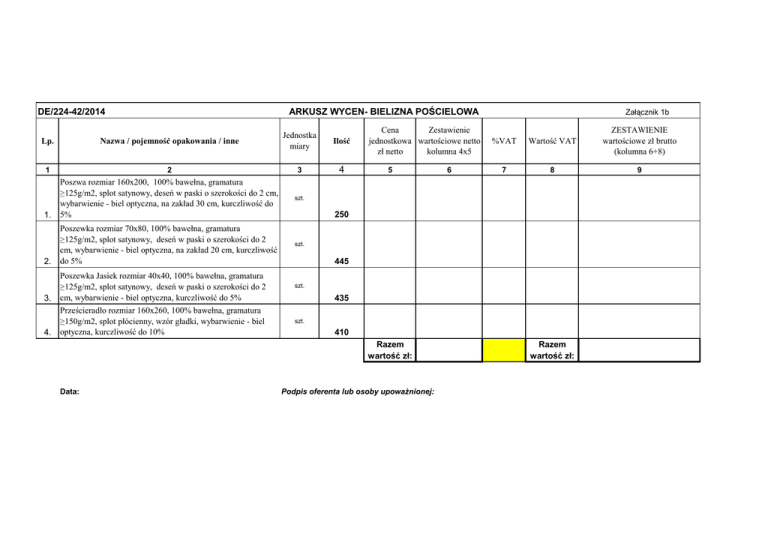 DE/224-42/2014 ARKUSZ WYCEN- BIELIZNA POŚCIELOWA Nazwa / pojemność opakowania / inne Jednostka miary Ilość 1 2 3 4 szt. 1. Poszwa rozmiar 160x200, 100% bawełna, gramatura ≥125g/m2, splot satynowy, deseń w paski o szerokości do 2 cm, wybarwienie - biel optyczna, na zakład 30 cm, kurczliwość do 5% szt. 2. Poszewka rozmiar 70x80, 100% bawełna, gramatura ≥125g/m2, splot satynowy, deseń w paski o szerokości do 2 cm, wybarwienie - biel optyczna, na zakład 20 cm, kurczliwość do 5% Lp. 3. 4. Poszewka Jasiek rozmiar 40x40, 100% bawełna, gramatura ≥125g/m2, splot satynowy, deseń w paski o szerokości do 2 cm, wybarwienie - biel optyczna, kurczliwość do 5% Prześcieradło rozmiar 160x260, 100% bawełna, gramatura ≥150g/m2, splot płócienny, wzór gładki, wybarwienie - biel optyczna, kurczliwość do 10% Cena Zestawienie jednostkowa wartościowe netto zł netto kolumna 4x5 5 %VAT Wartość VAT ZESTAWIENIE wartościowe zł brutto (kolumna 6+8) 7 8 9 250 445 szt. 435 szt. 410 Razem wartość zł: Data: 6 Załącznik 1b Podpis oferenta lub osoby upowaŜnionej: Razem wartość zł: