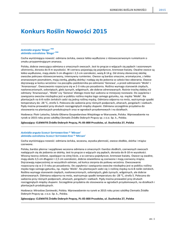 KONKURS ROŚLIN NOWOŚCI 2015 Konkurs Roślin Nowości 2015 PBR Actinidia arguta ‘Bingo’ PBR aktinidia ostrolistna ‘Bingo’ Cecha wyróżniająca nowość: odmiana żeńska, owoce lekko wydłużone z różowoczerwonym rumieńcem o smaku przypominającym ananasa. Polska, dobrze owocująca odmiana o smacznych owocach. Jest to pnącze o wijących się pędach i sezonowym ulistnieniu, dorasta do 8 m wysokości. W czerwcu pojawiają się pojedyncze, kremowe kwiaty. Owalne owoce są lekko wydłużone, mają około 3 cm długości i 2,5 cm szerokości, ważą 8-14 g. Od strony słonecznej skórkę owoców pokrywa różowoczerwony, intensywny rumieniec. Owoce są bardzo smaczne, aromatyczne, z lekko ananasowym posmakiem, mają cienką, gładką skórkę i nadają się do jedzenia w całości bez obierania. Owoce dojrzewają w końcu września i na początku października po odmianie ‘Genewa’, a przed odmianami ‘Weiki’ i ‘Ananasnaya’. Owocowanie rozpoczyna się w 2-3 roku po posadzeniu. Roślina wymaga stanowisk ciepłych, nasłonecznionych, osłoniętych, gleb żyznych, wilgotnych, ale dobrze zdrenowanych. Rośnie trochę słabiej niż odmiany ‘Ananasnaya’, ‘Weiki’ czy ‘Geneva’ dlatego może być sadzona w mniejszej rozstawie. Do zapylenia i zawiązania owoców niezbędna jest w pobliżu roślina męska tego samego gatunku, np. męska ‘Weiki’. Na plantacjach na 6-8 roślin żeńskich sadzi się jedną roślinę męską. Odmiana odporna na mróz, wytrzymuje spadki temperatury do -28 °C, strefa 5. Polecana do sadzenia przy różnych podporach, altanach, pergolach i siatkach. Pędy można prowadzić przy drutach rozciągniętych między słupami. Odmiana szczególnie przydatna do stosowania na plantacjach produkcyjnych oraz w ogrodach przydomowych i na działkach. Hodowca: Piotr Latocha, Szkoła Główna Gospodarstwa Wiejskiego w Warszawie, Polska. Wprowadzenie na rynek w 2015 roku przez szkółkę Clematis Źródło Dobrych Pnączy sp. z o.o. Sp. k., Polska. Zgłaszający: CLEMATIS Źródło Dobrych Pnączy, PL-05-800 Pruszków, ul. Duchnicka 27, Polska Actinidia arguta SCARLET SEPTEMBER KIWI ® ‘Mirzan’ aktinidia ostrolistna SCARLET SEPTEMBER KIWI ® ‘Mirzan’ Cecha wyróżniająca nowość: odmiana żeńska, wczesna, wysoka plenność, owoce słodkie, skórka i miąższ czerwone. Polska, bardzo plenna i wyjątkowo wczesna odmiana o smacznych i bardzo słodkich, czerwonych owocach nadających się do jedzenia ze skórką. Jest to pnącze o wijących się pędach, dorasta do 8-10 m wysokości. Wiosną tworzy zielone, opadające na zimę liście, a w czerwcu pojedyncze, kremowe kwiaty. Owoce są owalne, mają około 3,5 cm długości i 2,5 cm szerokości, dobrze oświetlone są czerwone i mają czerwony miąższ. Dojrzewają najwcześniej ze wszystkich odmian, od końca sierpnia do połowy września. Owocowanie rozpoczyna się w 2-3 roku po posadzeniu. Do zapylenia i zawiązania owoców niezbędna jest w pobliżu roślina męska tego samego gatunku, np. męska ‘Weiki’. Na plantacjach sadzi się 1 roślinę męską na 6-8 roślin żeńskich. Roślina wymaga stanowisk ciepłych, nasłonecznionych, osłoniętych, gleb żyznych, wilgotnych, ale dobrze zdrenowanych. Odmiana odporna na mróz, wytrzymuje spadki temperatury do -28 °C, strefa 5. Polecana do sadzenia przy różnych podporach, altanach, pergolach i siatkach. Pędy można prowadzić przy drutach rozciągniętych między słupami. Szczególnie przydatna do stosowania w ogrodach przydomowych, na działkach i plantacjach produkcyjnych. Hodowca: Mirosław Zaniewski, Polska. Wprowadzenie na rynek w 2015 roku przez szkółkę Clematis Źródło Dobrych Pnączy sp. z o.o. Sp. k., Polska. Zgłaszający: CLEMATIS Źródło Dobrych Pnączy, PL-05-800 Pruszków, ul. Duchnicka 27, Polska str. 1 KONKURS ROŚLIN NOWOŚCI 2015 PBR Actinidia kolomikta ‘Vitakola’ PBR aktinidia pstrolistna ‘Vitakola’ Cecha wyróżniająca nowość: odmiana żeńska, wysoka plenność i mrozoodporność, duże owoce. Pnącze o smacznych owocach i ozdobnych, częściowo przebarwiających się liściach, dorasta do 3-4 m wysokości. Pędy są długie, owijają się wokół podpór. Liście dekoracyjne, zielone lub zielono-biało-różowe, opadające na zimę. Kolorowe przebarwienia liści pojawiają się wczesnym latem w 2˗3 roku po posadzeniu. Najintensywniej wybarwiają się liście dobrze oświetlone. W maju rozwijają się pojedyncze, białe kwiaty o średnicy 1,5˗2 cm. Mają one lekko cytrynowy zapach. Owoce są duże, owalne, wydłużone, mają 4-4,5 cm długości, czasem są lekko spłaszczone, zielonożółte, dojrzewają w sierpniu, są aromatyczne i bardzo smaczne. Po dojrzeniu opadają. Owoce zawierają dużo witaminy C, około 1520mg%. Do wydania owoców potrzeba zapylacza, np. odmiany ‘Adam’. Owocowanie rozpoczyna się w 3-4 roku uprawy. Roślina wymaga stanowisk ciepłych, nasłonecznionych, osłoniętych od wiatru. Preferuje gleby wilgotne, ale dobrze zdrenowane, żyzne, o odczynie lekko kwaśnym lub obojętnym. Wytrzymuje spadki temperatur do około ˗34 °C, strefa 4, ale jest wrażliwa na przymrozki podczas wegetacji. Odmiana szczególnie przydatna do stosowania w małych i dużych ogrodach przydomowych jako pnącze owocowe i jednocześnie ozdobne. Hodowca: Jan i Daniela Kola, Czechy. Wprowadzenie na rynek w 2015 roku przez szkółkę Clematis Źródło Dobrych Pnączy sp. z o.o. Sp. k., Polska. Zgłaszający: CLEMATIS Źródło Dobrych Pnączy, PL-05-800 Pruszków, ul. Duchnicka 27, Polska PBR Berberis thunbergii GOLDEN HORIZON ‘Hoho 2’ PBR berberys Thunberga GOLDEN HORIZON ‘Hoho 2’ Cecha wyróżniająca nowość: odmiana niska, horyzontalne ułożenie pędów, żółte ulistnienie. Gęsty i niski krzew o rozłożystym pokroju, dorasta do 0,2-0,3 m wysokości i 0,6 m szerokości. Pędy ułożone horyzontalnie, bogato rozgałęzione. Liście drobne, łopatkowate, żółte, ogonki liściowe kró