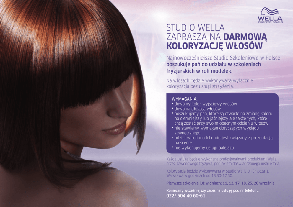 STUDIO WELLA ZAPRASZA NA DARMOWĄ KOLORYZACJĘ WŁOSÓW Najnowocześniejsze Studio Szkoleniowe w Polsce poszukuje pań do udziału w szkoleniach fryzjerskich w roli modelek. Na włosach będzie wykonywana wyłącznie koloryzacja bez usługi strzyżenia. Wymagania: • dowolny kolor wyjściowy włosów • dowolna długość włosów • poszukujemy pań, które są otwarte na zmianę koloru na ciemniejszy lub jaśniejszy ale także tych, które chcą zostać przy swoim obecnym odcieniu włosów • nie stawiamy wymagań dotyczących wyglądu zewnętrznego • udział w roli modelki nie jest związany z prezentacją na scenie • nie wykonujemy usługi balejażu Każda usługa będzie wykonana profesjonalnymi produktami Wella, przez zawodowego fryzjera, pod okiem doświadczonego instruktora. Koloryzacja będzie wykonywana w Studio Wella ul. Smocza 1, Warszawa w godzinach od 13:30-17:30. Pierwsze szkolenia już w dniach: 11, 12, 17, 18, 25, 26 września. Konieczny wcześniejszy zapis na usługę pod nr telefonu: 022/ 504 40 60-61