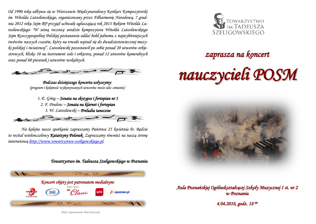 Od 1990 roku odbywa się w Warszawie Międzynarodowy Konkurs Kompozytorski im. Witolda Lutosławskiego, organizowany przez Filharmonię Narodową. 7 grudnia 2012 roku Sejm RP przyjął uchwałę ogłaszającą rok 2013 Rokiem Witolda Lutosławskiego: "W setną rocznicę urodzin kompozytora Witolda Lutosławskiego Sejm Rzeczypospolitej Polskiej postanawia oddać hołd jednemu z najwybitniejszych twórców naszych czasów, który na trwałe wpisał się do dwudziestowiecznej muzyki polskiej i światowej”. Lutosławski pozostawił po sobie ponad 20 utworów orkiestrowych, blisko 10 na instrument solo i orkiestrę, ponad 12 utworów kameralnych oraz ponad 60 piosenek i utworów wokalnych. Podczas dzisiejszego koncertu usłyszymy: zaprasza na koncert nauczycieli POSM (program i kolejność wykonywanych utworów może ulec zmianie) 1. E. Grieg – Sonata na skrzypce i fortepian nr 1 2. F. Poulenc – Sonata na klarnet i fortepian 3. W. Lutosławski – Preludia taneczne Na kolejne nasze spotkanie zapraszamy Państwa 25 kwietnia br. Będzie to recital wiolonczelowy Katarzyny Polonek. Zapraszamy również na naszą stronę internetową http://www.towarzystwo-szeligowskiego.pl. Towarzystwo im. Tadeusza Szeligowskiego w Poznaniu Koncert objęty jest patronatem medialnym: Aula Poznańskiej Ogólnokształcącej Szkoły Muzycznej I st. nr 2 w Poznaniu 4.04.2016, godz. 18 00 Tekst i opracowanie: Piotr Jaszczak Szanowni Państwo, Drodzy Melomani! Po raz kolejny, tym razem już wiosennie, witamy na kolejnym koncercie organizowanym przez Towarzystwo im. Tadeusza Szeligowskiego w Poznaniu. Usłyszymy nauczycieli Poznańskiej Ogólnokształcącej Szkoły Muzycznej I st. nr 2 – Łukasza Nazarczuka (skrzypce), Marcina Piekuta (klarnet), Katarzynę SikorskąWrembel (fortepian) i Jacka Fokta (fortepian). Zgodnie z tradycją naszych koncertów, w atmosferę naszego spotkania wprowadzą nas uczniowie szkoły. Podczas dzisiejszego spotkania usłyszymy utwory E. Griega, F. Poulenca i W. Lutosławskiego. Edward Grieg (1843-1907) to norweski pianista i kompozytor pochodzenia szkockiego. Studia muzyczne rozpoczął w Lipsku w wieku 12 lat. Założył towarzystwo Euterpe, promujące ówczesną muzykę skandynawską z naciskiem na duński romantyzm. W 1866 roku przeprowadził się do Christianii (obecne Oslo), gdzie pracował jako dyrygent. W 1868 skomponował pierwsze ze swoich najbardziej znanych dzieł - Koncert fortepianowy a-moll op. 16. W latach 1874-1875, na prośbę Henryka Ibsena, napisał muzykę do jego dramatu Peer Gynt. Dwie suity napisane do tego dzieła są do dziś uważane za największe jego osiągnięcie. Suita „Peer Gynt” zawierała m.in. takie utwory jak: „Poranek”, „Śmierć Azy”, „Taniec Anitry” czy słynne „W grocie Króla Gór”, II suita Peer Gynt m.in. „Pieśń Solwejgi”. Podstawą wielu jego utworów były skandynawskie dzieła literackie – sagi, poezja ludowa, legendy czy nordycka ballada. Wprowadził do muzyki klasycznej elementy muzycznego folkloru skandynawskiego. Komponował zarówno utwory liryczne i minimalistyczne (bliskie impresjonizmowi), jak i takie z bogatym akompaniamentem, rozbudowaną harmoniką oraz niebywałą zgodnością melodii z tekstem, zarówno w akcentach, jak i frazowaniu. Do dziś pozostaje klasykiem europejskiej muzyki poważnej. Francis Poulenc (1899-1963) to francuski kompozytor i pianista, który dorastał na muzyce Debussy’ego, Ravela i Strawińskiego. Interesował się poezją francuskich symbolistów. Jego pierwsze kompozycje pochodzą z czasów służby wojsko- wej (1919-1921). W 1920 roku, wspólnie z D. Milhaud’em, A. Honegger’em, P. Auric’iem, L. Durey’em i G. Tailleferre’m założył nieformalny związek francuskich kompozytorów – Grupa Sześciu (Les Six). Jednym z głównych celów jego działania było dążenie do uzyskania prostoty w zakresie kompozycji i architektoniki dzieła muzycznego. Chodziło o to, aby każdy wielki utwór był dostępny i zrozumiały dla jak najszerszego grona odbiorców. Poulenc nawiązał również wiele kontaktów z europejskim środowiskiem muzycznym, m. in. z A. Schoenbergiem, B. Bartókiem czy W. Landowską. Komponował na zamówienie S. Diagilewa (balet „Les biches”). W połowie lat 30 w jego twórczości pojawiła się zmiana stylistyczna i zaczęły powstawać pierwsze kompozycje religijne. Po zakończeniu II wojny światowej wiele podróżował i koncertował w Europie i USA. Premiera jego opery „Dialogi karmelitanek” odbyła się w 1956 roku. Dwa lata później zakończył pracę nad tragedią kameralną „Głos ludzki”. W ostatnich latach swojego życia wiele podróżował po USA, gdzie wydał swoją książkę o innym kompozytorze francuskim, E. Chabrierze. Witold Lutosławski (1913-1994) to polski dyrygent i kompozytor. Naukę gry na fortepianie rozpoczął w wieku 6 lat u H. Hoffman, J. Śmidowicza i A. Taubego. Pobierał również lekcje gry na skrzypcach u L. Kmitowej. Uczęszczał także na prywatne lekcje teorii i kompozycji do W. Maliszewskiego. To właśnie pod jego kierunkiem Lutosławski skomponował w 1930 roku swój pierwszy utwór – „Taniec Chimery”. Od 1932 roku kontynuował naukę w Konserwatorium Warszawskiem na studiach kompozytorskich. Uczył się również grać u J. Lefelda. Dyplom kompozytora uzyskał w 1937 roku za utwór „Requiem”. Lutosławski za swój debiut kompozytorski uznał jednak prawykonanie w 1938 roku „Wariacji symfonicznych”, pisanych w latach 1936-38. Po wojnie Lutosławski zaangażował się w organizację Związku Kompozytorów Polskich. Był z nim czynnie związany do końca swojego życia. Współtworzył Międzynarodowy Festiwal Muzyki Współczesnej „Warszawska Jesień”. Otrzymał wiele nagród i odznaczeń – zarówno w Polsce, jak i za granicą. W 1994 nadano Lutosławskiemu najwyższe polskie odznaczenie: Order Orła Białego. To najwybitniejszy - obok F. Chopina i K, Szymanowskiego - kompozytor 