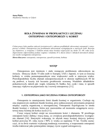 Anna Platta Akademia Morska w Gdyni ROLA ŻYWIENIA W PROFILAKTYCE I LECZENIU OSTEOPENII I OSTEOPOROZY U KOBIET Celem pracy była analiza zaleceń żywieniowych z zakresu profilaktyki zdrowotnej osteopenii i osteoporozy u kobiet. Osteoporoza jest problemem zdrowotnym występującym u starszych osób. Rozwija się stopniowo, a związana z wiekiem utrata masy kostnej rozpoczyna się około 35.–40. roku życia. Zapewnienie odpowiedniej podaży wapnia i witaminy D w diecie dzieci i młodych dorosłych zmniejsza ryzyko wystąpienia osteoporozy. Słowa kluczowe: osteopenia, osteoporoza, sposób żywienia, kobiety WSTĘP Osteoporoza jest istotnym i stale rosnącym problemem zdrowotnym na świecie. Dotyczy około 75 mln osób w Europie, USA i Japonii, w tym co trzeciej kobiety w wieku pomenopauzalnym oraz większości osób w starszym wieku. Prawdopodobnie liczba złamań osteoporotycznych w okresie najbliższych 50 lat się podwoi, a koszty ich leczenia gwałtownie wzrosną. Niedobór składników pokarmowych, takich jak: wapń, witamina D, białko, bor, cynk i inne, w sposób znaczący wpływa na pojawienie się i rozwój osteoporozy [11]. 1. OSTEOPENIA JAKO WCZESNA FORMA OSTEOPOROZY Osteopenia to zmniejszenie ilości tkanki kostnej w organizmie. Cechuje się ona stopniowym zanikiem tkanki kostnej, przy jednoczesnym utrzymaniu proporcji między częścią organiczną a nieorganiczną. Osteopenia fizjologiczna to utrata tkanki kostnej z wiekiem, która jest zauważalna od momentu osiągnięcia szczytowej masy kostnej do końca życia [11]. Coraz więcej kobiet cierpi na rzeszotnienie kości i złamania. W przebiegu osteopenii kości słabną i tracą masę, co zwiększa prawdopodobieństwo wystąpienia złamań [14]. Statystyki wskazują, że ubytek masy kostnej dotyczy połowy kobiet powyżej 45. roku życia i 90% w wieku co najmniej 75 lat. Trzeba zaznaczyć, że te dwie wartości wykazują tendencję wzrostową, a rozpoznanie osteopenii trzeba traktować jako potencjalnie ratujący życie sygnał ostrzegawczy. A. Platta, Rola żywienia w profilaktyce i leczeniu osteopenii i osteoporozy u kobiet 17 Możliwość rozwoju osteopenii zależy od różnych czynników ryzyka, m.in. od gęstości kości we wczesnym okresie życia, wieku, uwarunkowań genetycznych, sposobu odżywiania, obecnych nawyków, aktywności fizycznej i innych. Ważne, aby kobiety świadome istniejącego zagrożenia osteopenii potrafiły skutecznie jej zapobiegać. Przyczyny, objawy i zalecenia w przypadku osteopenii są niemal identyczne jak w przypadku osteoporozy. Nie należy zapominać, że osteopenia jest początkową fazą osteoporozy, która w istocie nie musi wystąpić. Do czynników ryzyka wystąpienia osteopenii zalicza się: niską masę ciała, niezdrowy tryb życia (palenie tytoniu, nadużywanie alkoholu), niedostateczne spożycie produktów mlecznych, nieregularne miesiączki, czynniki genetyczne (wywiad rodzinny), wcześniejsze złamania, rasę (kaukaską lub żółtą), przedwczesną menopauzę (z przyczyn naturalnych lub w następstwie zabiegu chirurgicznego), wiek, działanie niektórych leków, choroby tarczycy i reumatoidalne zapalenie stawów [14]. Do najczęstszych objawów osteopenii można zaliczyć lekkie bóle kręgosłupa, które z czasem się nasilają, zmienioną sylwetkę (pojawiający się garb), niską masę kostną [25]. Osteopenia bardzo często przebiega bezobjawowo, podobnie jak osteoporoza, aż do momentu wystąpienia pierwszego złamania [24]. Zalecenia w osteopenii dotyczą przede wszystkim takich elementów, jak: • rozpoznanie czynników ryzyka rozwoju osteopenii; • zwiększenie intensywności ćwiczeń obciążeniowych i wytrzymałościowych; • wzbogacenie dziennego jadłospisu w produkty bogate w składniki wzmacniające kości; • unikanie tytoniu i alkoholu; • w miarę możliwości zabezpieczanie się przed upadkami; • konsultacja z lekarzem na temat suplementacji i organicznych dodatków żywieniowych, które mają za zadanie zwiększenie masy tkanki kostnej [14]; • wykonywanie badań densytometrycznych przynajmniej raz w roku; • przyjmowanie pozycji z wyprostowanymi plecami przez osoby pracujące w pozycji siedzącej, wybieranie krzesła o prawidłowej wysokości z oparciami na ramiona; • spanie na sprężystym materacu leżącym na twardym podłożu, • uważanie na preparaty zawierające fluor, gdyż przy ich częstym stosowaniu mogą pojawić się zaburzenia żołądkowo-jelitowe oraz obrzęki stawów [25]. 2. OSTEOPOROZA JAKO POSTĘPUJĄCA CHOROBA CYWILIZACYJNA Osteoporoza to układowa choroba szkieletu charakteryzująca się niską masą kości i zwiększoną podatnością kości na złamania. Mając na uwadze kryterium lokalizacji osteoporozy, można podzielić ją na miejscową i uogólnioną [1, 7, 15], a czynniki ryzyka jej wystąpienia na dwie grupy. Pierwszą grupę stanowią czynniki 18 ZESZYTY NAUKOWE AKADEMII MORSKIEJ W GDYNI, nr 86, grudzień 2014 niezależne od chorującego, a drugą grupę czynniki związane ze stylem życia, na które ma on pewien wpływ. Do pierwszej grupy czynników ryzyka wystąpienia osteoporozy zalicza się uwarunkowania genetyczne i geograficzne, proces starzenia się, drobną budowę kostno-szkieletową, usunięcie jajników u kobiet, jasną cerę, wczesną amenorheę, alergię na mleko i jego przetwory, szczupłą budowę ciała z małą ilością tkanki tłuszczowej, nierództwo. Z kolei do drugiej grupy należą takie czynniki, jak: palenie tytoniu, nadużywanie alkoholu, nieprawidłowe odżywianie, spożywanie nadmiernej ilości kawy i produktów zawierających kofeinę, małe spożycie mleka i przetworów mlecznych, nadmierne spożycie białka (zwłaszcza mięsa), dieta z dużym ograniczeniem tłuszczów, niedobór witaminy D i wapnia, niedobór witaminy K2, zażywanie niektórych leków z grupy steroidów, hormonów, leków przeciwzakrzepowych, przeciwdrgawkowych [23]. Do grupy czynników ryzyka w występowaniu ost