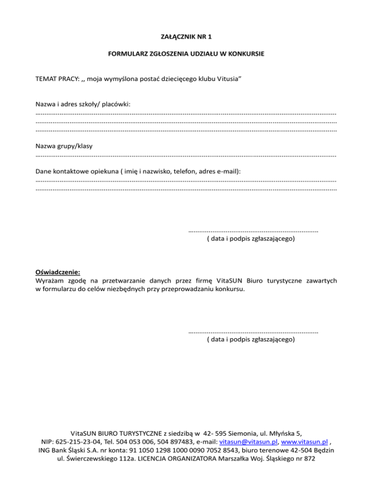 ZAŁĄCZNIK NR 1 FORMULARZ ZGŁOSZENIA UDZIAŁU W KONKURSIE TEMAT PRACY: ,, moja wymyślona postać dziecięcego klubu Vitusia” Nazwa i adres szkoły/ placówki: …............................................................................................................................................................ ............................................................................................................................................................... ............................................................................................................................................................... Nazwa grupy/klasy …............................................................................................................................................................ Dane kontaktowe opiekuna ( imię i nazwisko, telefon, adres e-mail): …............................................................................................................................................................ ............................................................................................................................................................... ….................................................................. ( data i podpis zgłaszającego) Oświadczenie: Wyrażam zgodę na przetwarzanie danych przez firmę VitaSUN Biuro turystyczne zawartych w formularzu do celów niezbędnych przy przeprowadzaniu konkursu. ….................................................................. ( data i podpis zgłaszającego) VitaSUN BIURO TURYSTYCZNE z siedzibą w 42- 595 Siemonia, ul. Młyńska 5, NIP: 625-215-23-04, Tel. 504 053 006, 504 897483, e-mail: [email protected], www.vitasun.pl , ING Bank Śląski S.A. nr konta: 91 1050 1298 1000 0090 7052 8543, biuro terenowe 42-504 Będzin ul. Świerczewskiego 112a. LICENCJA ORGANIZATORA Marszałka Woj. Śląskiego nr 872